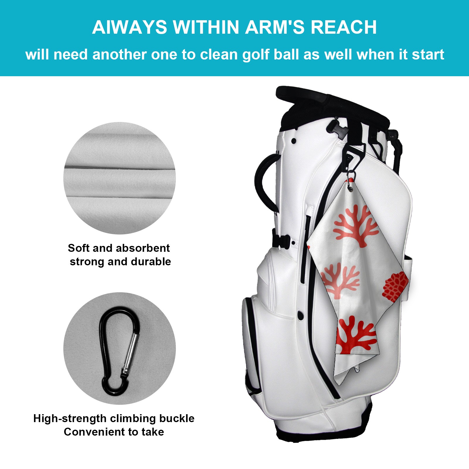 • <p>Designed to care for clubs and balls, this high performance golf towel is a compact and portable 15.7 in x 23.6 in size that cleans precisely without taking up space in your bag.&nbsp;</p> <p>The polyester material creates a dense cleaning network that absorbs dust and grass clippings and removes divot stains in a single wipe.&nbsp;</p> <p>Durable, absorbent fabric stays fluffy through multiple washes and dries quickly when hung, eliminating damp odors. The buckle clip design attaches to the side of the bag for easy access and natural air drying while walking, keeping the towel dry and efficient at all times.&nbsp;</p> <p>Whether it's wiping the ball before teeing off or cleaning the club face on the green side, it's a practical aid for golfers who want to keep their equipment looking fresh and new.</p>