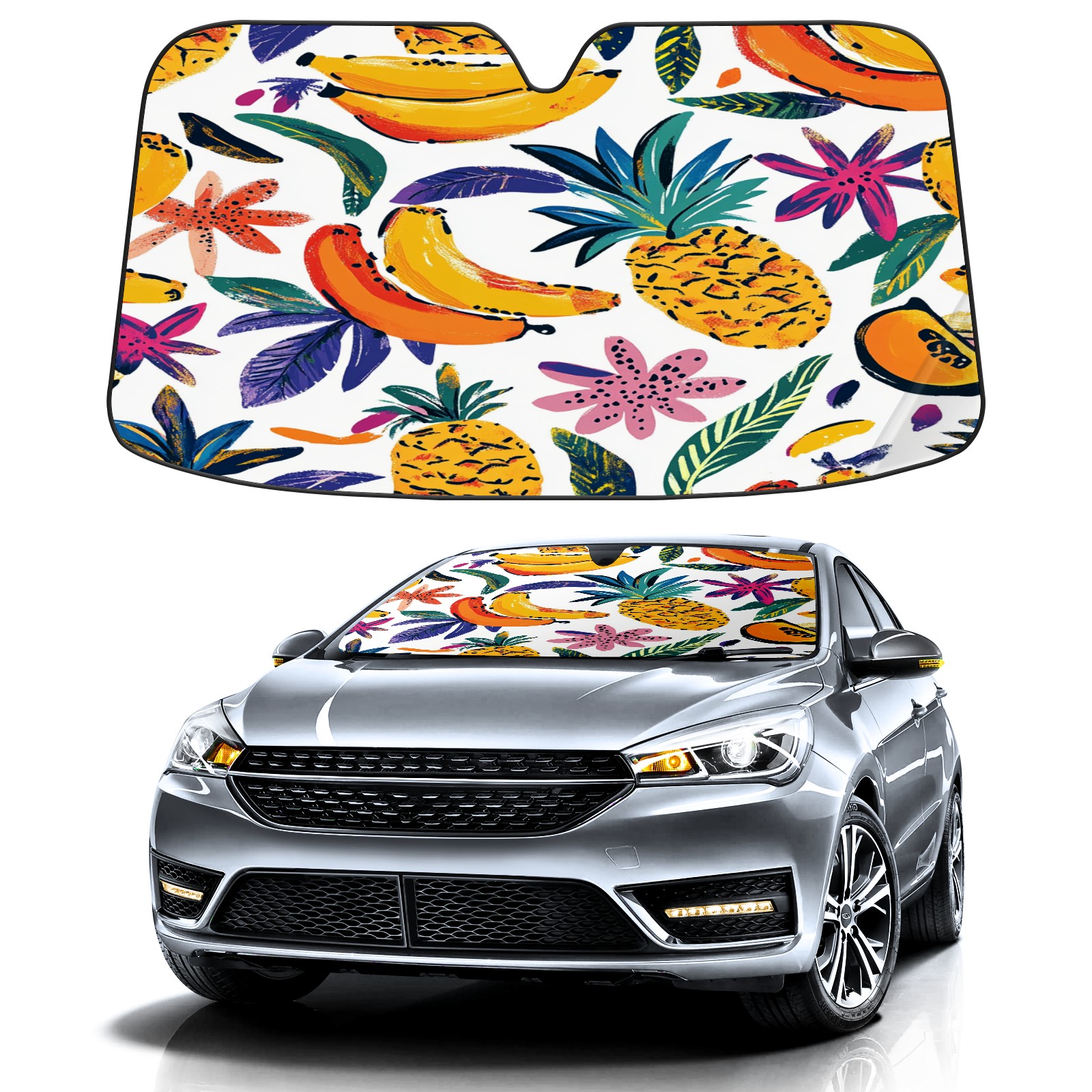 Car Windshield Sun Shade Foldable-Universal Fit Sunshade for Front Windows, UV Protection Heat Shield for Most Vehicles (55x30in)-Sun Visor Extender, Dashboard Cover(Colorful Tropical Pattern)