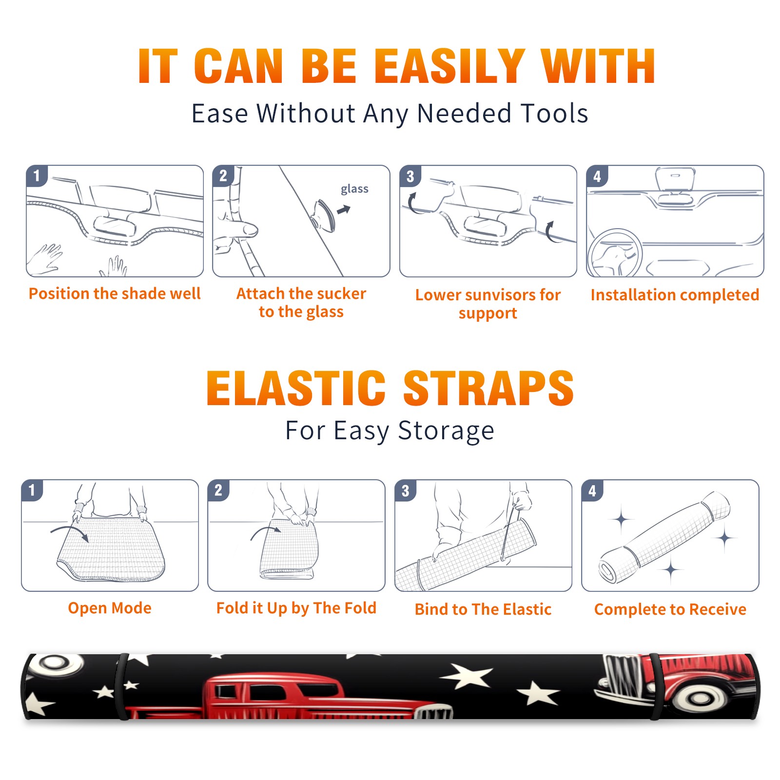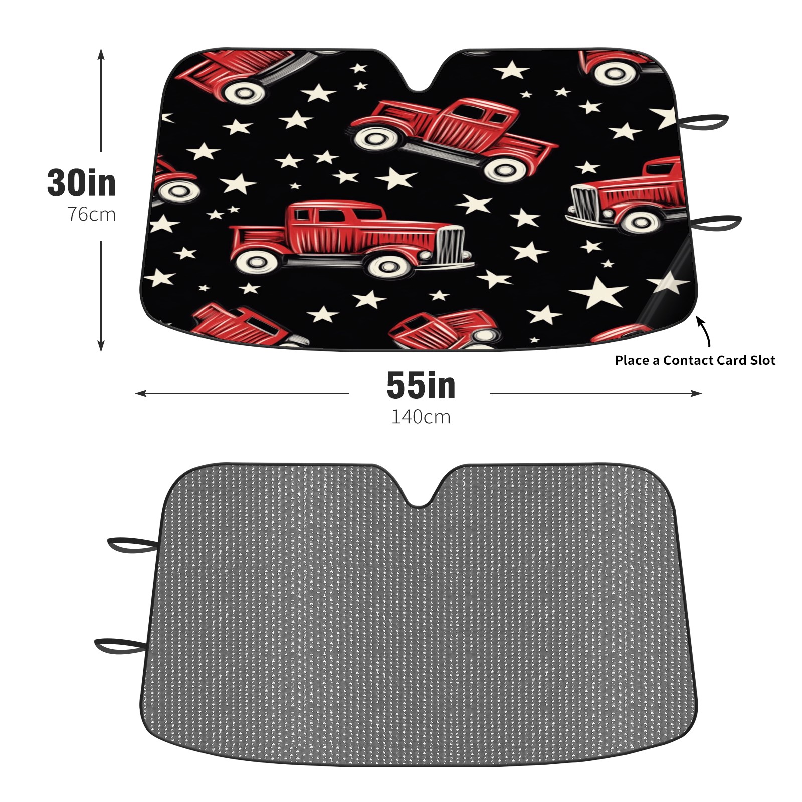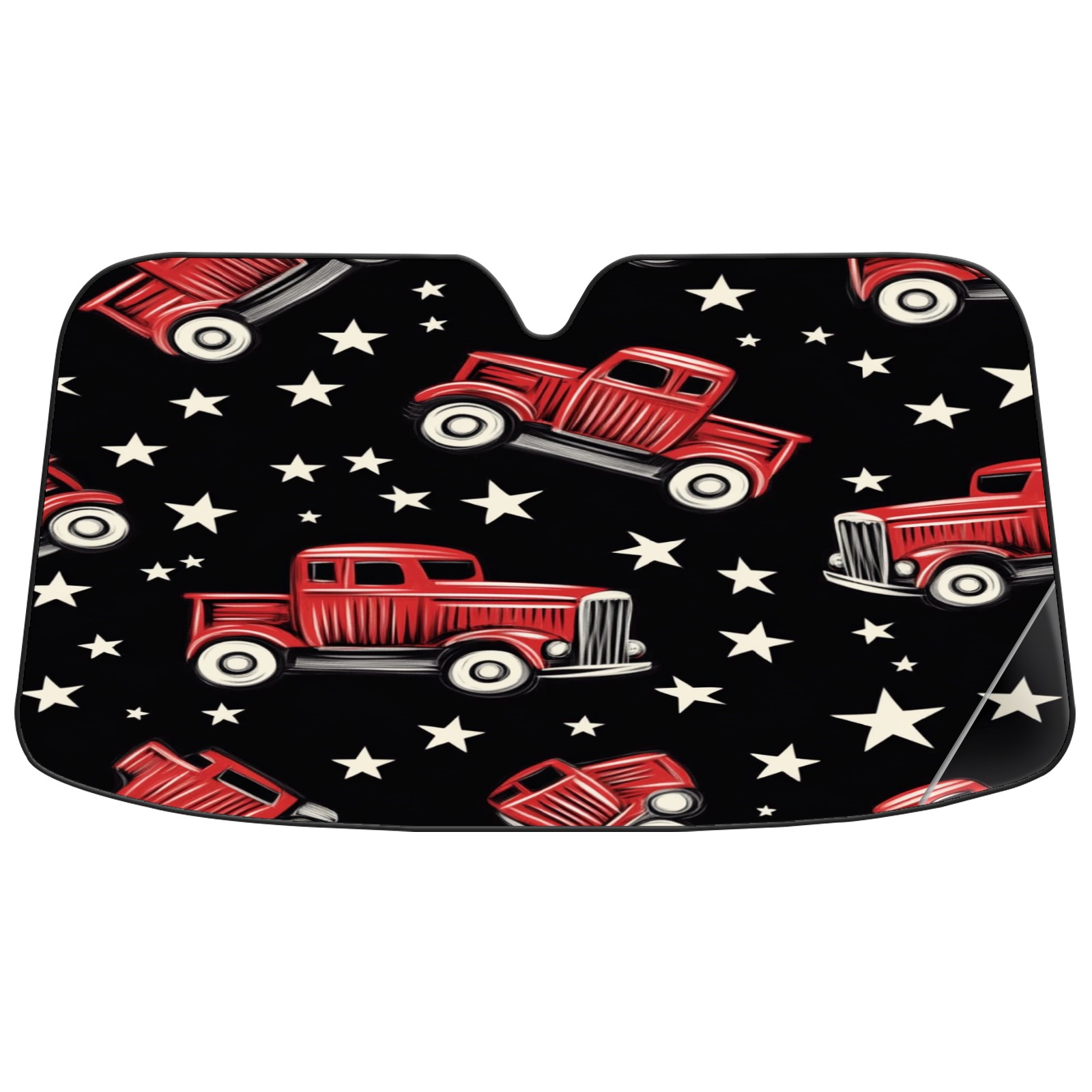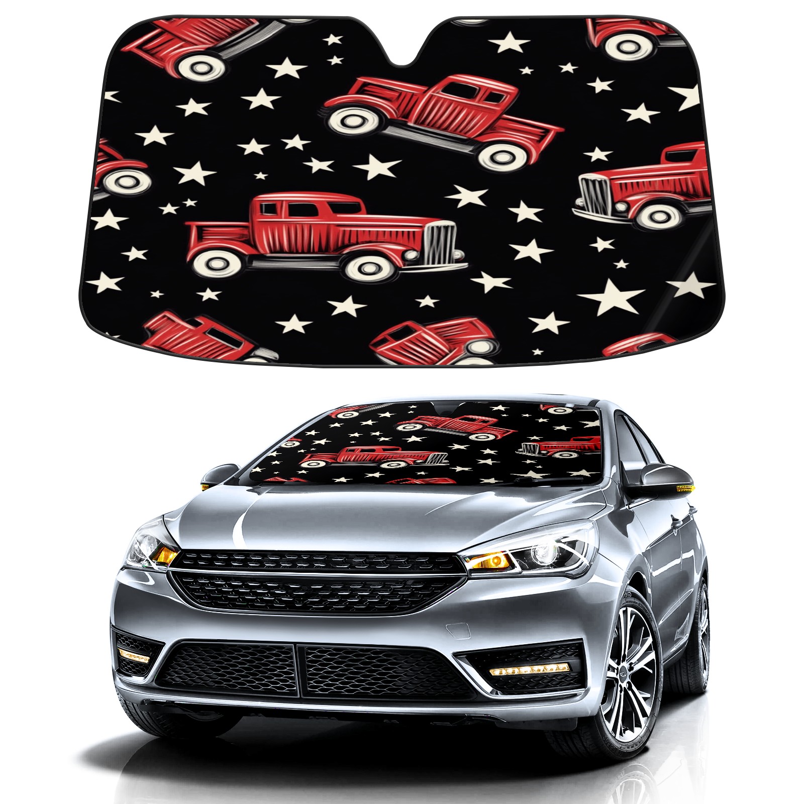 Car Windshield Sun Shade Foldable-Universal Fit Sunshade for Front Windows, UV Protection Heat Shield for Most Vehicles (55x30in)-Sun Visor Extender, Dashboard Cover(Red Vintage Trucks)