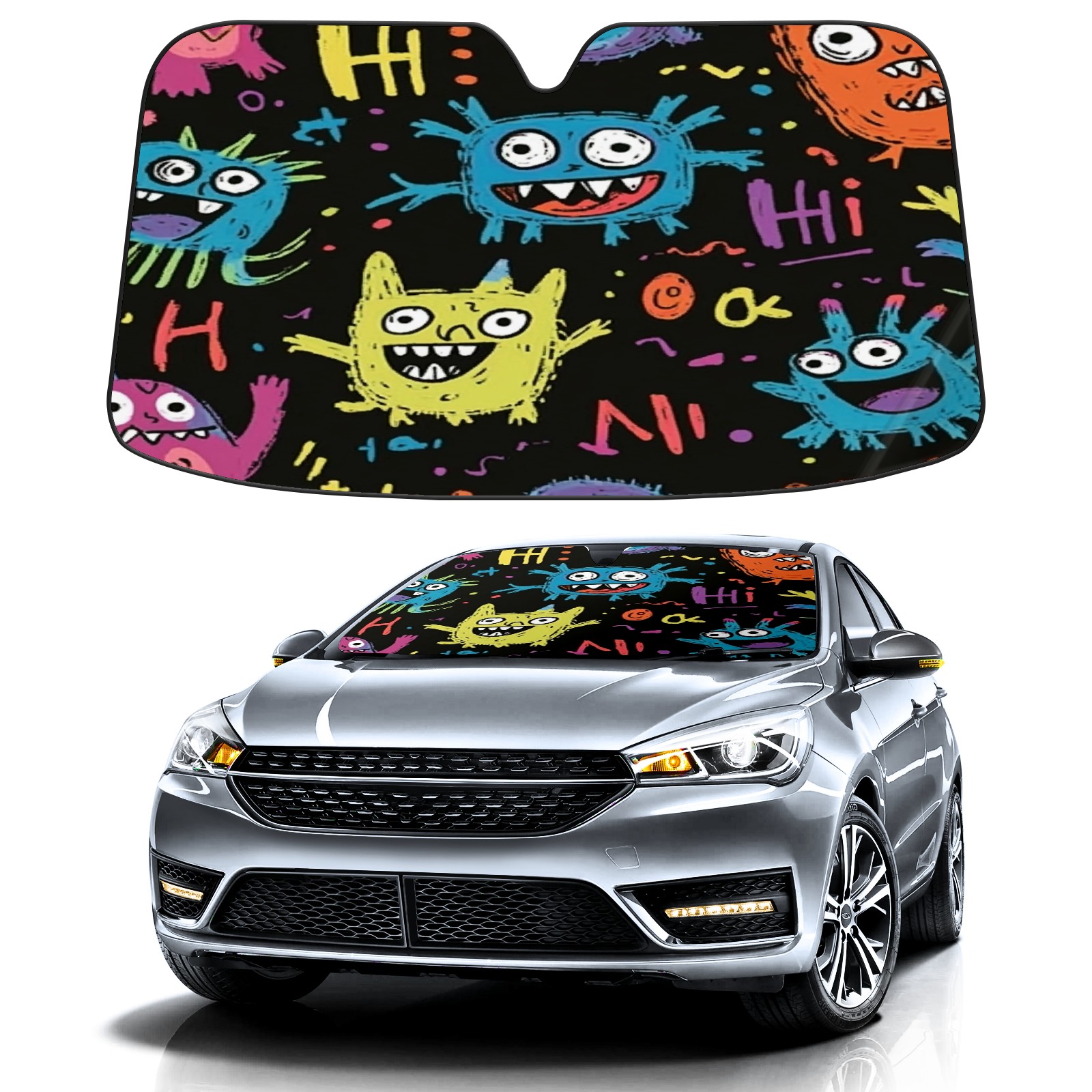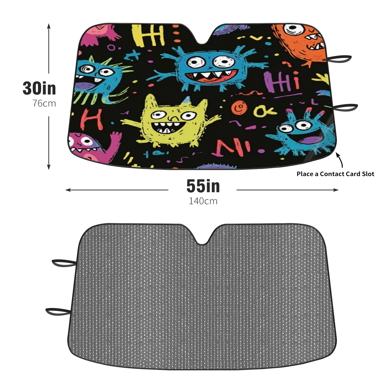 Car Windshield Sun Shade Foldable-Universal Fit Sunshade for Front Windows, UV Protection Heat Shield for Most Vehicles (55x30in)-Sun Visor Extender, Dashboard Cover(Cute Cartoon Monsters)