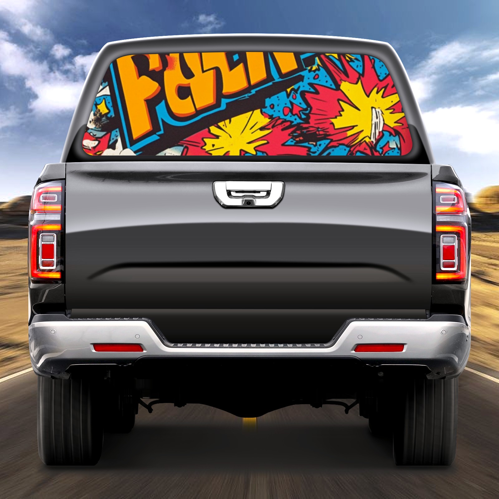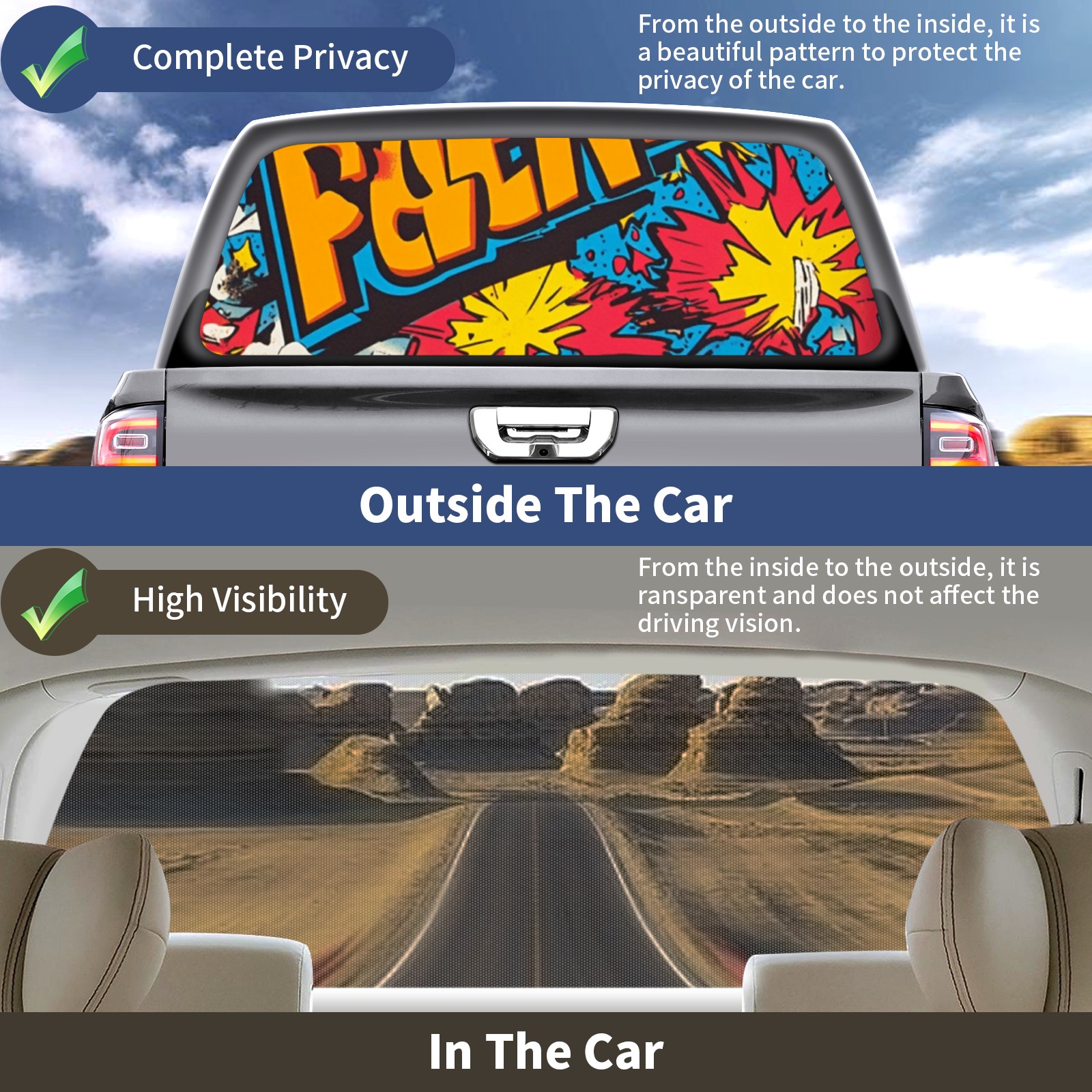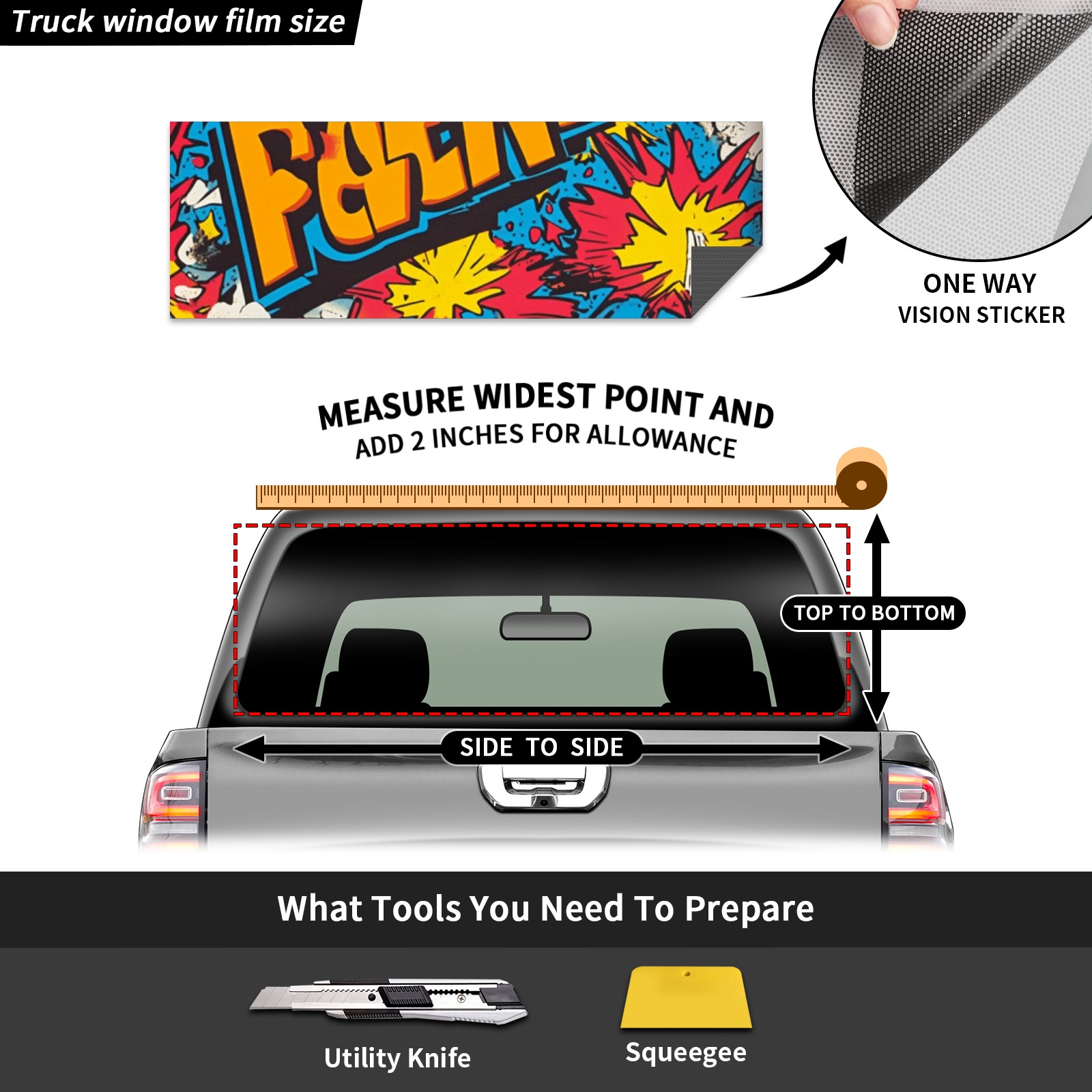• ●<b>Truck Rear Window Graphics Decals Pickup Trucks Back Window Film Stickers 66" x 22" Perforated Vinyl Wrap Stickers Decorations for Car Rear Window.</b><br> <br> <b>Features :</b><br> - Size of the rear window decals for trucks is 66x22 Inches (168x56cm).<br> - High quality perforated vinyl window film, one way vision sticker.<br> - Perforated is see through from the inside but not from outside.<br> - Clear printing, waterproof and continued.<br> - The car back window graphics stickers fits most truck and makes your vehicle more beautiful.<br> <br> <b>【Installation Instructions】</b><br> <b>1. CLEAN SURFACE - </b>Clean the rear window thoroughly and make sure the surface clean.<br> <b>2. STICK THE DECALS - </b>Tear off the paper on the back and stick the decal on the window.<br> <b>3. SCRAPE OFF AIR BUBBLES - </b>Use a squeegee or other card to scrape off the excess air bubbles.<br> <b>4. TRIM THE EXCESS -</b> Use a knife to cut off the excess stickers of the window, finally complete.<br> 1. Please measure the size before purchasing, back window graphics decal for truck can be cut to your desired size.<br> 2.The graphics stickers for truck back window is a great gift for yourself also can as a birthday / halloween / christmas gift for your friends and family.<br> <b>Decorate Your Pickup Truck With Rear Window Decal Today!</b>