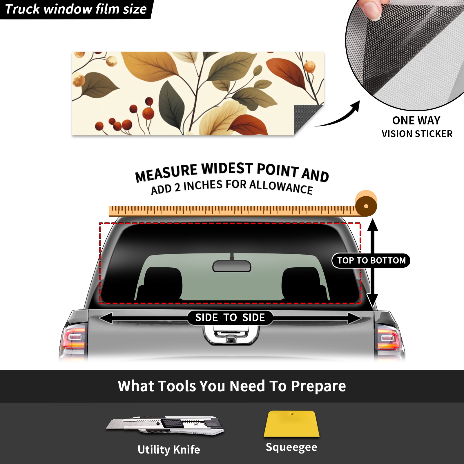 • ●<b>Truck Rear Window Graphics Decals Pickup Trucks Back Window Film Stickers 66" x 22" Perforated Vinyl Wrap Stickers Decorations for Car Rear Window.</b><br> <br> <b>Features :</b><br> - Size of the rear window decals for trucks is 66x22 Inches (168x56cm).<br> - High quality perforated vinyl window film, one way vision sticker.<br> - Perforated is see through from the inside but not from outside.<br> - Clear printing, waterproof and continued.<br> - The car back window graphics stickers fits most truck and makes your vehicle more beautiful.<br> <br> <b>【Installation Instructions】</b><br> <b>1. CLEAN SURFACE - </b>Clean the rear window thoroughly and make sure the surface clean.<br> <b>2. STICK THE DECALS - </b>Tear off the paper on the back and stick the decal on the window.<br> <b>3. SCRAPE OFF AIR BUBBLES - </b>Use a squeegee or other card to scrape off the excess air bubbles.<br> <b>4. TRIM THE EXCESS -</b> Use a knife to cut off the excess stickers of the window, finally complete.<br> 1. Please measure the size before purchasing, back window graphics decal for truck can be cut to your desired size.<br> 2.The graphics stickers for truck back window is a great gift for yourself also can as a birthday / halloween / christmas gift for your friends and family.<br> <b>Decorate Your Pickup Truck With Rear Window Decal Today!</b>
