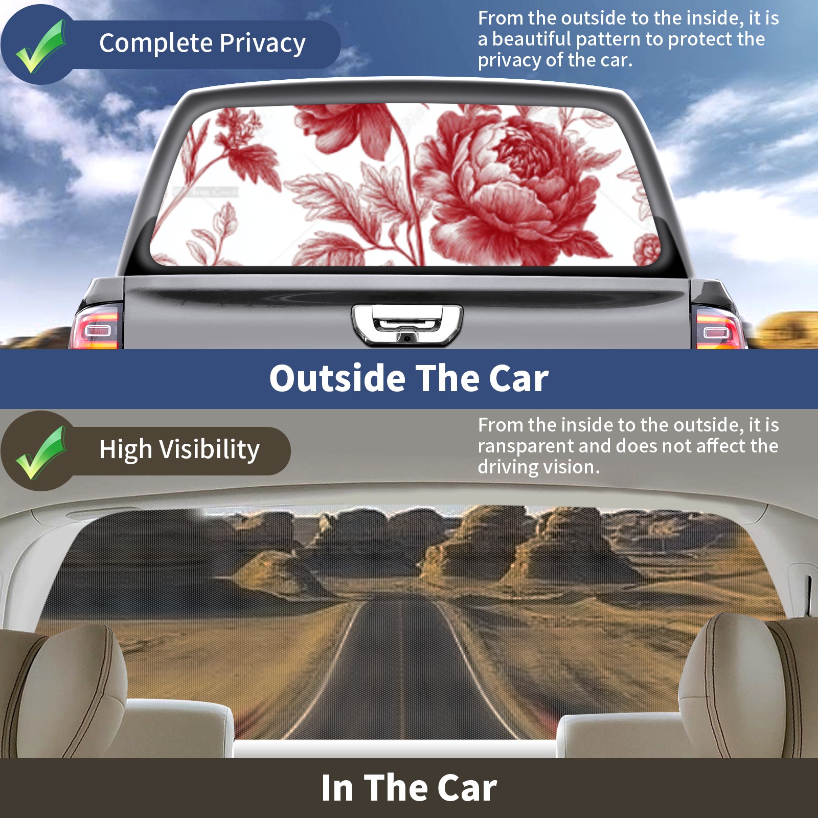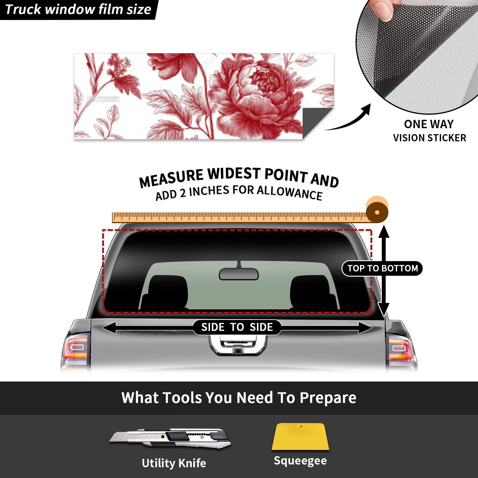• ●<b>Truck Rear Window Graphics Decals Pickup Trucks Back Window Film Stickers 66" x 22" Perforated Vinyl Wrap Stickers Decorations for Car Rear Window.</b><br> <br> <b>Features :</b><br> - Size of the rear window decals for trucks is 66x22 Inches (168x56cm).<br> - High quality perforated vinyl window film, one way vision sticker.<br> - Perforated is see through from the inside but not from outside.<br> - Clear printing, waterproof and continued.<br> - The car back window graphics stickers fits most truck and makes your vehicle more beautiful.<br> <br> <b>【Installation Instructions】</b><br> <b>1. CLEAN SURFACE - </b>Clean the rear window thoroughly and make sure the surface clean.<br> <b>2. STICK THE DECALS - </b>Tear off the paper on the back and stick the decal on the window.<br> <b>3. SCRAPE OFF AIR BUBBLES - </b>Use a squeegee or other card to scrape off the excess air bubbles.<br> <b>4. TRIM THE EXCESS -</b> Use a knife to cut off the excess stickers of the window, finally complete.<br> 1. Please measure the size before purchasing, back window graphics decal for truck can be cut to your desired size.<br> 2.The graphics stickers for truck back window is a great gift for yourself also can as a birthday / halloween / christmas gift for your friends and family.<br> <b>Decorate Your Pickup Truck With Rear Window Decal Today!</b>