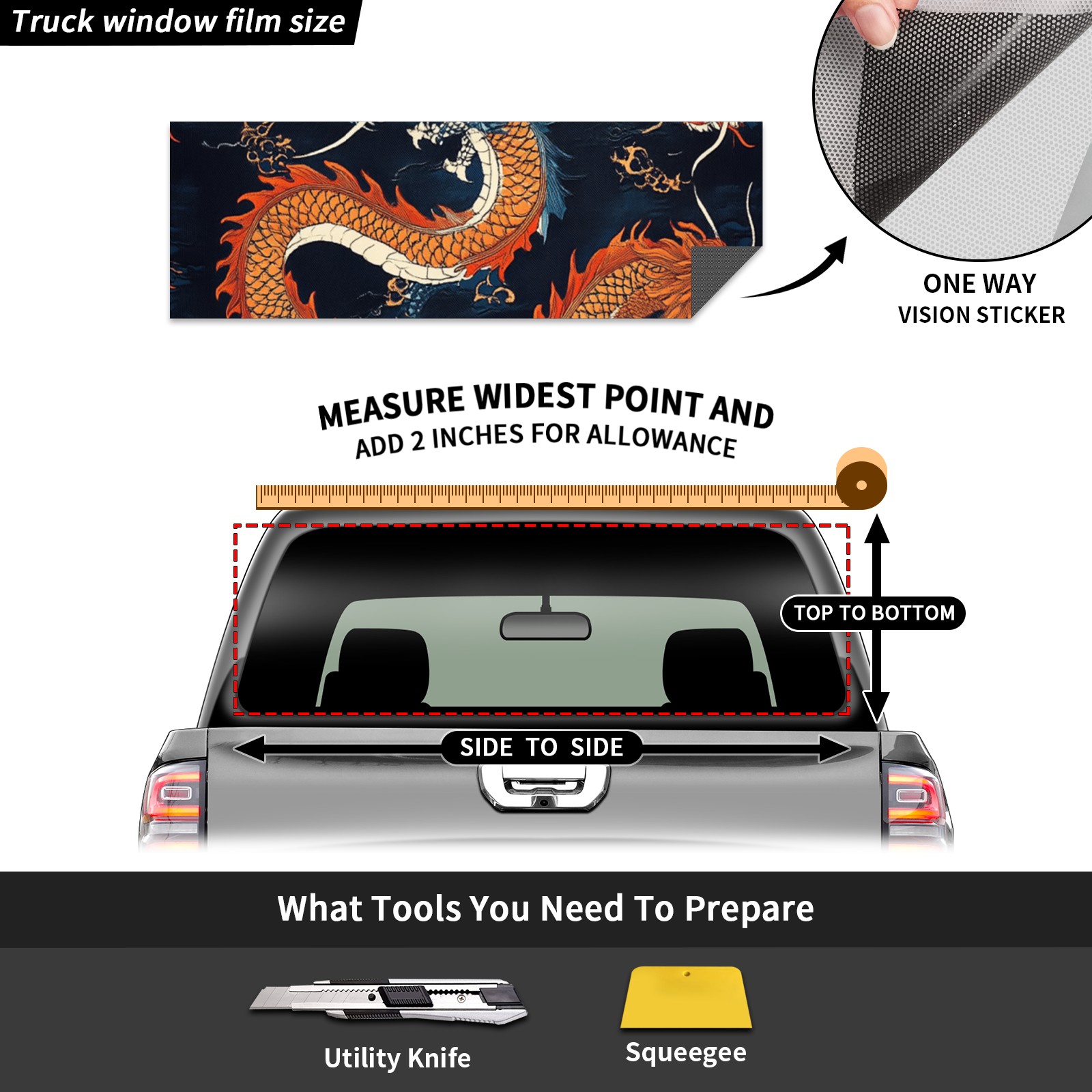 • ●<b>Truck Rear Window Graphics Decals Pickup Trucks Back Window Film Stickers 66" x 22" Perforated Vinyl Wrap Stickers Decorations for Car Rear Window.</b><br> <br> <b>Features :</b><br> - Size of the rear window decals for trucks is 66x22 Inches (168x56cm).<br> - High quality perforated vinyl window film, one way vision sticker.<br> - Perforated is see through from the inside but not from outside.<br> - Clear printing, waterproof and continued.<br> - The car back window graphics stickers fits most truck and makes your vehicle more beautiful.<br> <br> <b>【Installation Instructions】</b><br> <b>1. CLEAN SURFACE - </b>Clean the rear window thoroughly and make sure the surface clean.<br> <b>2. STICK THE DECALS - </b>Tear off the paper on the back and stick the decal on the window.<br> <b>3. SCRAPE OFF AIR BUBBLES - </b>Use a squeegee or other card to scrape off the excess air bubbles.<br> <b>4. TRIM THE EXCESS -</b> Use a knife to cut off the excess stickers of the window, finally complete.<br> 1. Please measure the size before purchasing, back window graphics decal for truck can be cut to your desired size.<br> 2.The graphics stickers for truck back window is a great gift for yourself also can as a birthday / halloween / christmas gift for your friends and family.<br> <b>Decorate Your Pickup Truck With Rear Window Decal Today!</b>