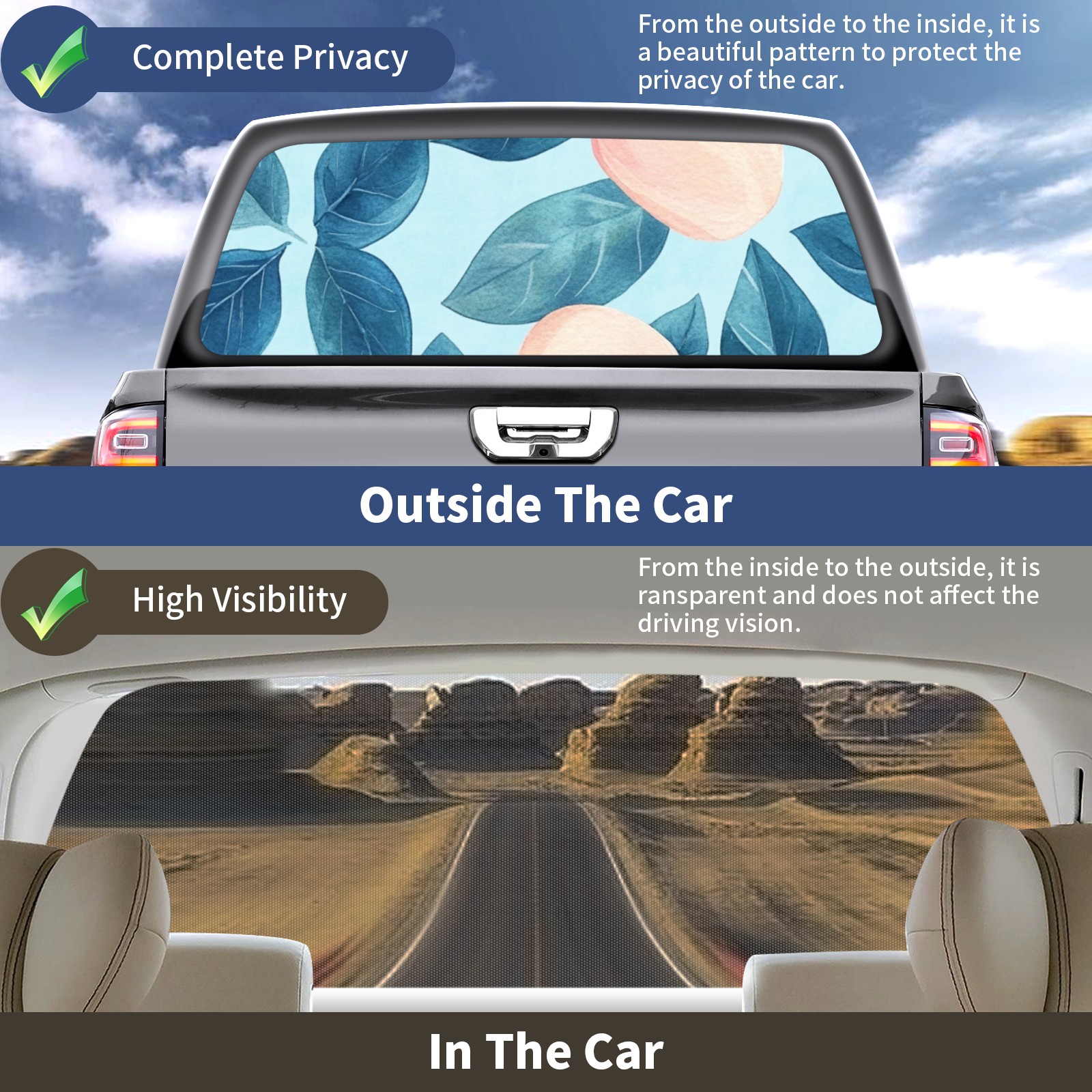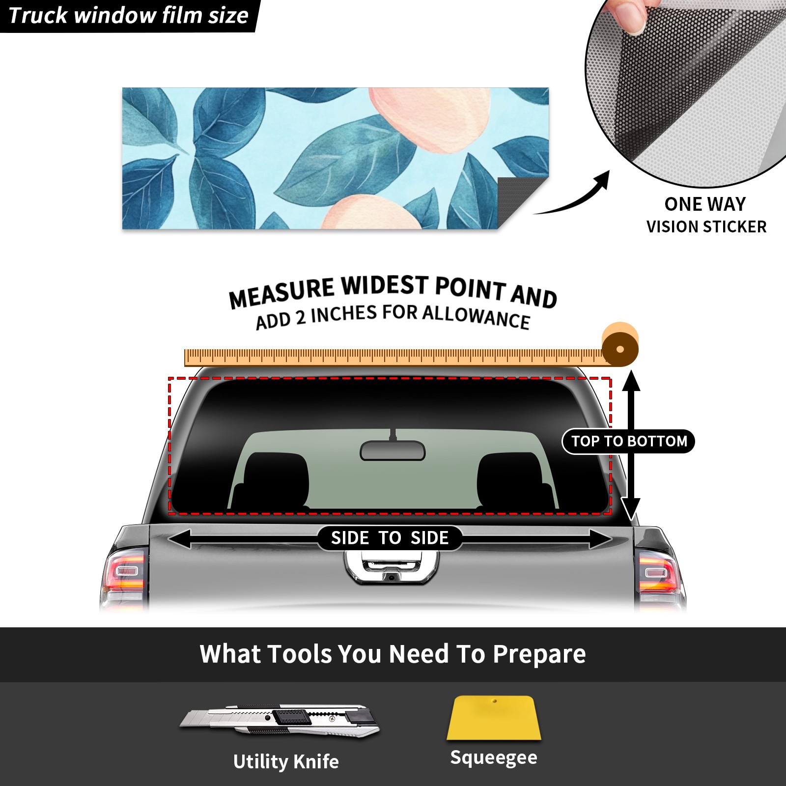 • ●<b>Truck Rear Window Graphics Decals Pickup Trucks Back Window Film Stickers 66" x 22" Perforated Vinyl Wrap Stickers Decorations for Car Rear Window.</b><br> <br> <b>Features :</b><br> - Size of the rear window decals for trucks is 66x22 Inches (168x56cm).<br> - High quality perforated vinyl window film, one way vision sticker.<br> - Perforated is see through from the inside but not from outside.<br> - Clear printing, waterproof and continued.<br> - The car back window graphics stickers fits most truck and makes your vehicle more beautiful.<br> <br> <b>【Installation Instructions】</b><br> <b>1. CLEAN SURFACE - </b>Clean the rear window thoroughly and make sure the surface clean.<br> <b>2. STICK THE DECALS - </b>Tear off the paper on the back and stick the decal on the window.<br> <b>3. SCRAPE OFF AIR BUBBLES - </b>Use a squeegee or other card to scrape off the excess air bubbles.<br> <b>4. TRIM THE EXCESS -</b> Use a knife to cut off the excess stickers of the window, finally complete.<br> 1. Please measure the size before purchasing, back window graphics decal for truck can be cut to your desired size.<br> 2.The graphics stickers for truck back window is a great gift for yourself also can as a birthday / halloween / christmas gift for your friends and family.<br> <b>Decorate Your Pickup Truck With Rear Window Decal Today!</b>