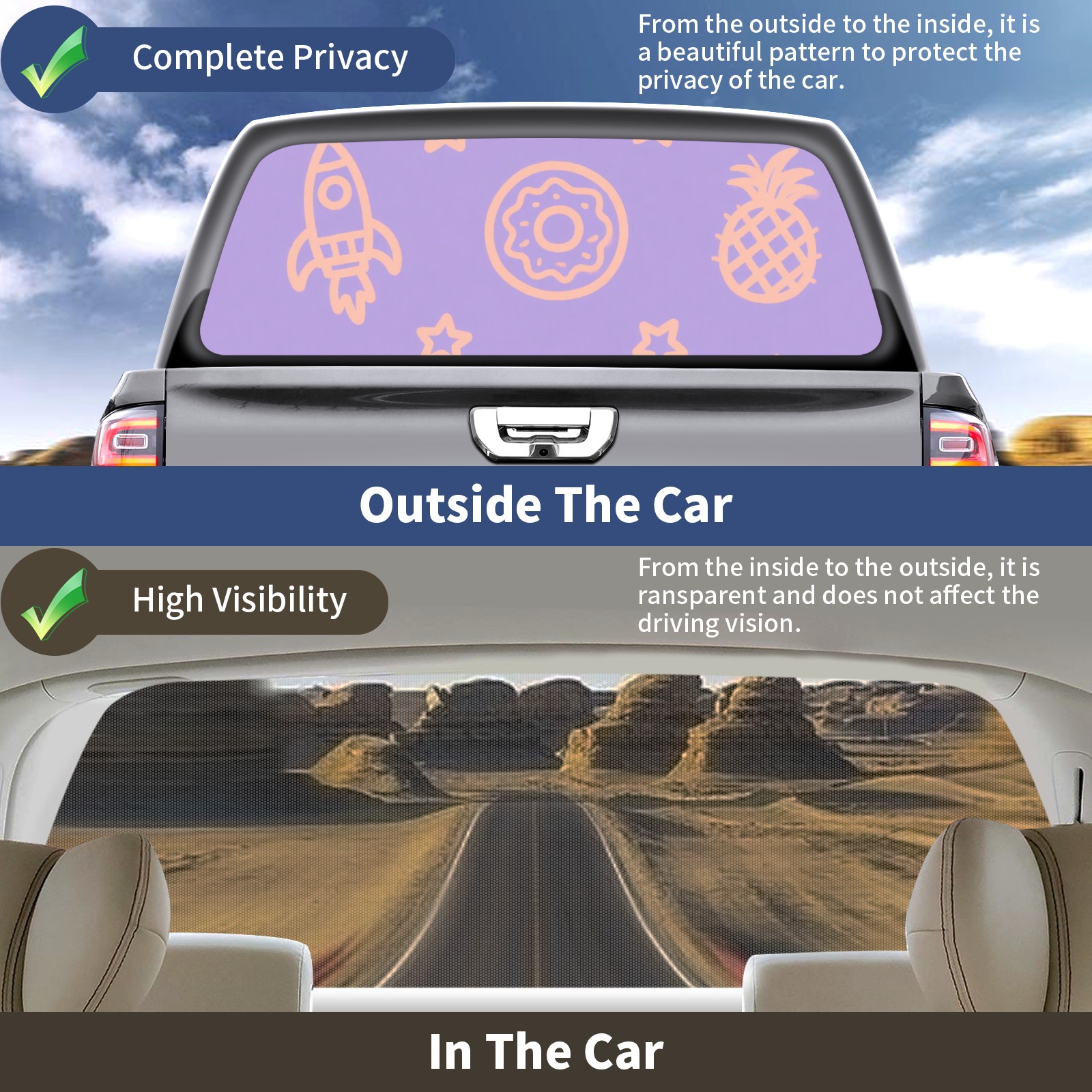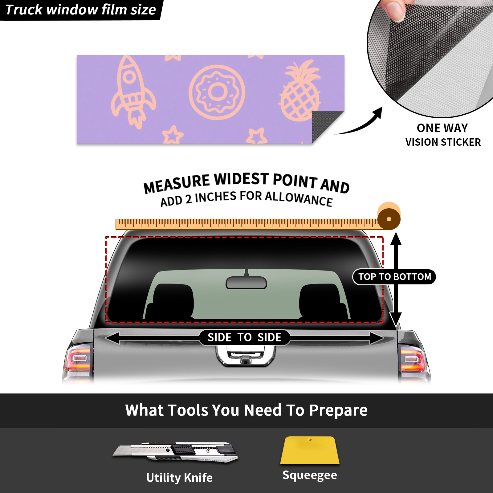 • ●<b>Truck Rear Window Graphics Decals Pickup Trucks Back Window Film Stickers 66" x 22" Perforated Vinyl Wrap Stickers Decorations for Car Rear Window.</b><br> <br> <b>Features :</b><br> - Size of the rear window decals for trucks is 66x22 Inches (168x56cm).<br> - High quality perforated vinyl window film, one way vision sticker.<br> - Perforated is see through from the inside but not from outside.<br> - Clear printing, waterproof and continued.<br> - The car back window graphics stickers fits most truck and makes your vehicle more beautiful.<br> <br> <b>【Installation Instructions】</b><br> <b>1. CLEAN SURFACE - </b>Clean the rear window thoroughly and make sure the surface clean.<br> <b>2. STICK THE DECALS - </b>Tear off the paper on the back and stick the decal on the window.<br> <b>3. SCRAPE OFF AIR BUBBLES - </b>Use a squeegee or other card to scrape off the excess air bubbles.<br> <b>4. TRIM THE EXCESS -</b> Use a knife to cut off the excess stickers of the window, finally complete.<br> 1. Please measure the size before purchasing, back window graphics decal for truck can be cut to your desired size.<br> 2.The graphics stickers for truck back window is a great gift for yourself also can as a birthday / halloween / christmas gift for your friends and family.<br> <b>Decorate Your Pickup Truck With Rear Window Decal Today!</b>