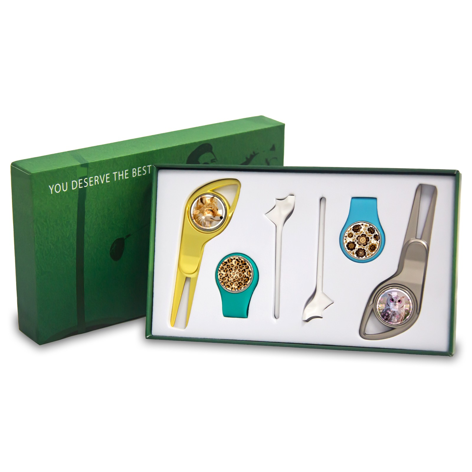 <p>The all-purpose gift box created for golf lovers is now available! It is packed in a reinforced paper box with a high-quality texture and is not easy to deform. The moment you open the gift box, you will see its exquisite style. It contains 2 green forks,2 hat clips, 2 tacks and 4 magnetic glass markers. From course repair to equipment embellishment, to precise marking, this set of golf essential artifacts is a secret weapon to improve your performance on the field. </p> <p>Whether it is a birthday, Father's Day, or other special moments, this gift box is a perfect gift for golfers of all experience levels, helping them to swing confidently on the course and win. The intimate design suitable for both men and women makes it a popular choice among golf enthusiasts. Its compact and portable features make it easy to accompany you to the golf course, driving range, or to various outdoor swing holy places, making every shot full of ritual and professionalism!</p>