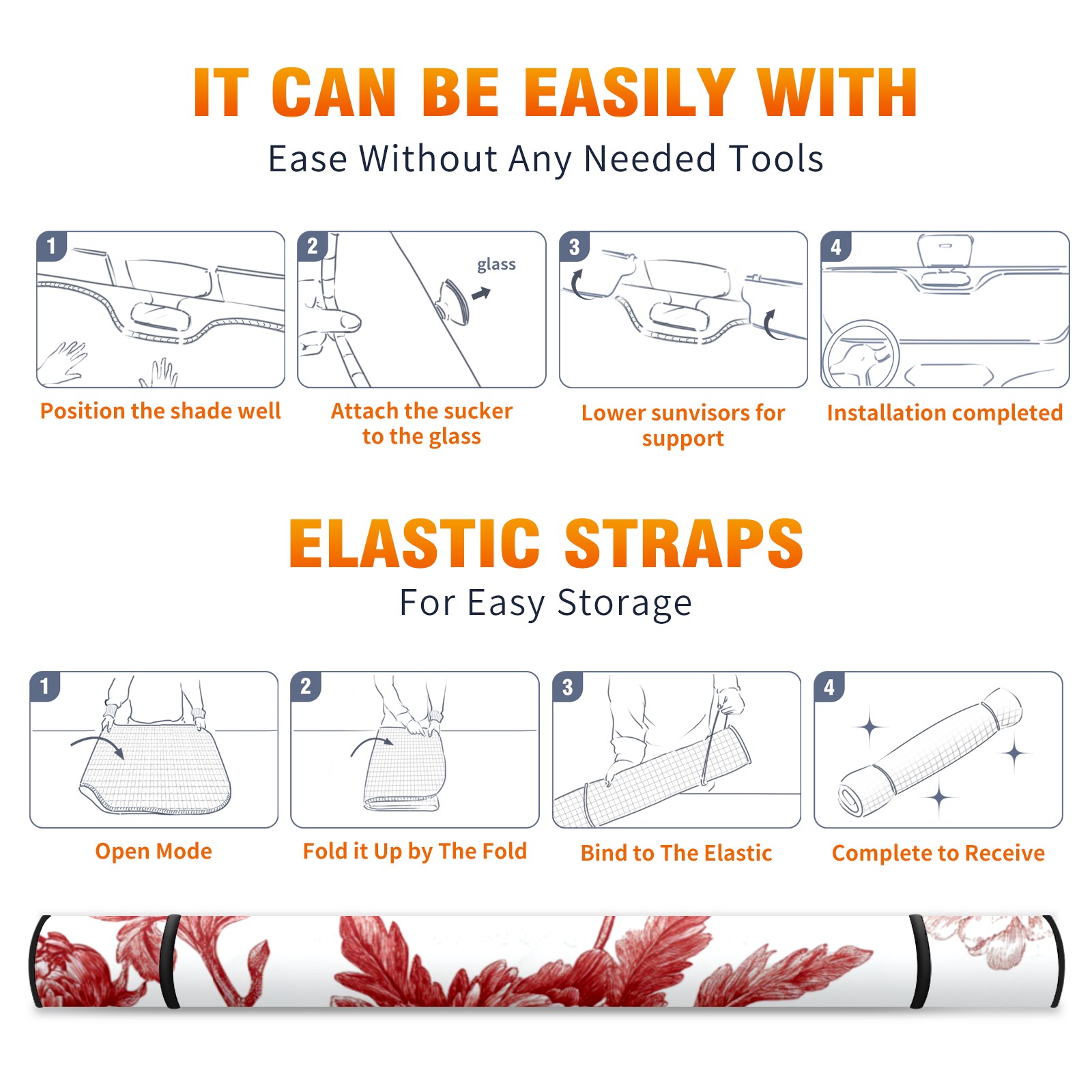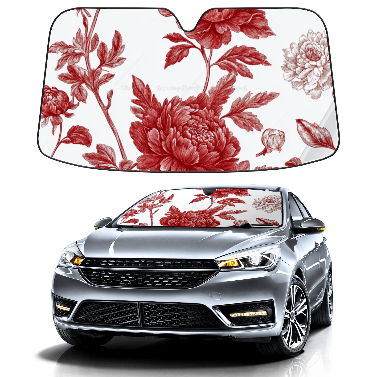 Red Flowe3 Car Sun Shade UV Protection Foldable Sunshade for Windshield Heat Insulation Portable Sun Shield for Car Interior Protection Automotive Window Protector