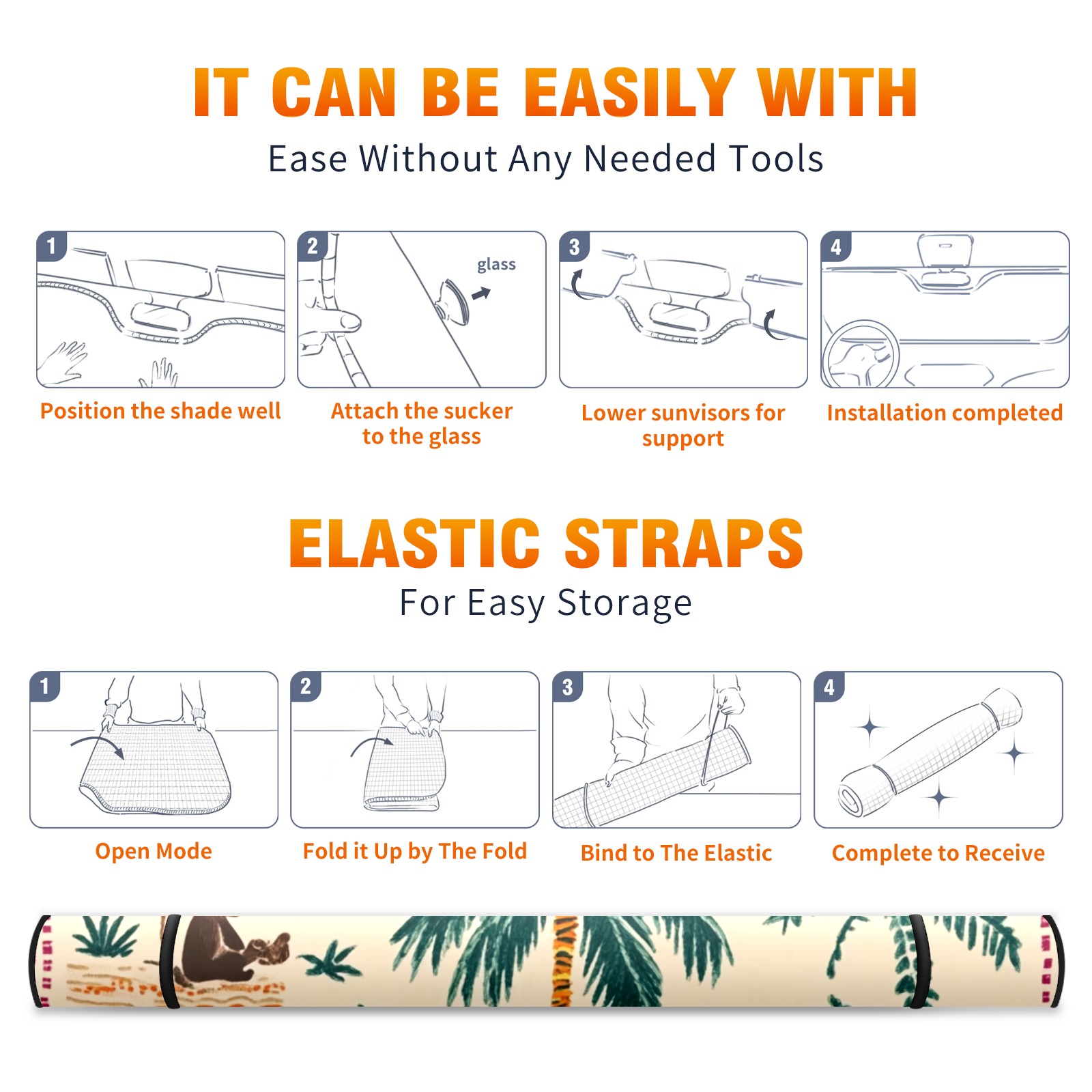• <p><b>Foldable Premium Car Windshield Sunshade is your great solution to reduce your car’s interior temperature dramatically! This is definitely a must-have item for your summer travel!</b></p><p><b>【Precision Fit, Stylish Protection】</b></p><p>55"x30" (140x76cm) universal size with 3cm flexible margins fits curved windshields of most sedans/SUVs.</p><p><b>【Blocking Uv Rays &amp; Heat Insulation】</b></p><p>Our vehicle sunshade provides effective UV, sun, and summer heat protection, preventing leather fading and plastic cracking to keep your car interior pristine.</p><p><b>【Zero-Mark Installation &amp; Space-Saving】</b></p><p>Equipped with dual scratch-free silicone suction cups + adjustable straps: Medical-grade silicone cups hold firmly yet remove cleanly. Folds to A3 size (42x30cm x &lt;2cm thick), tucks discreetly into glove compartments or door pockets.&nbsp;</p>