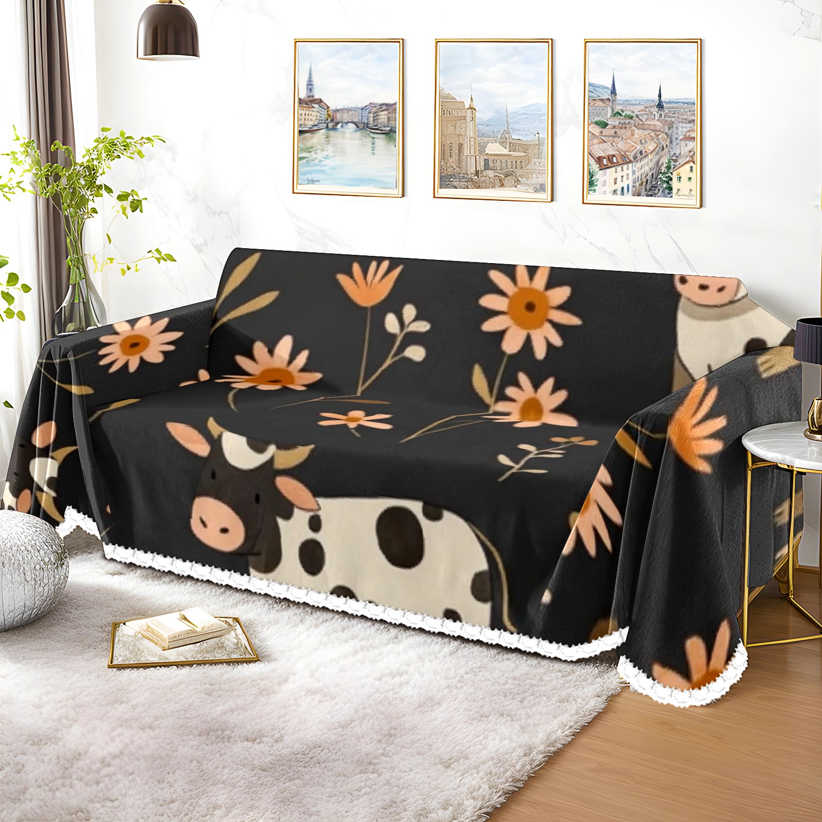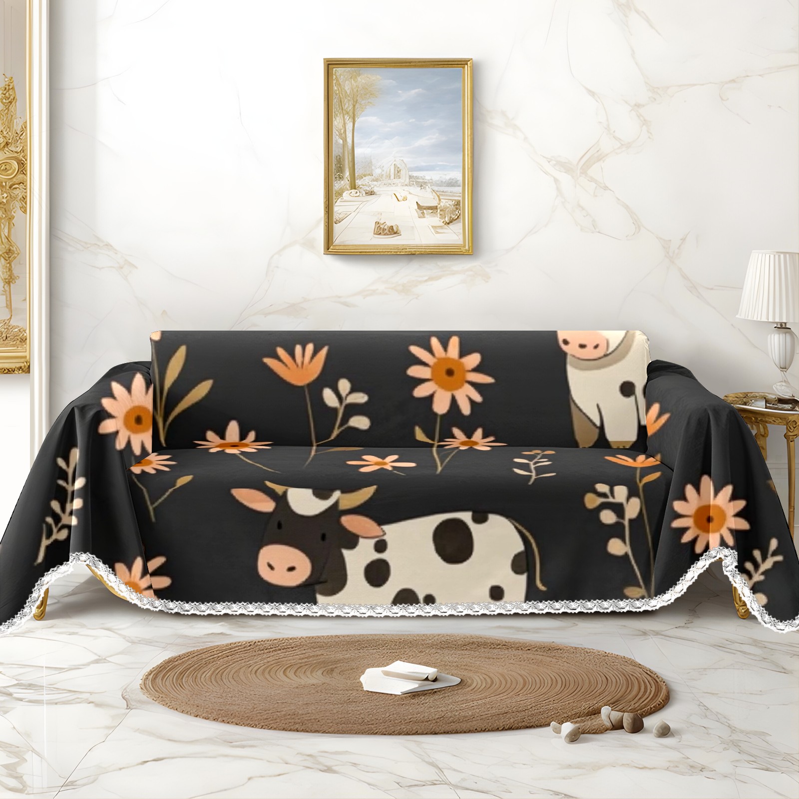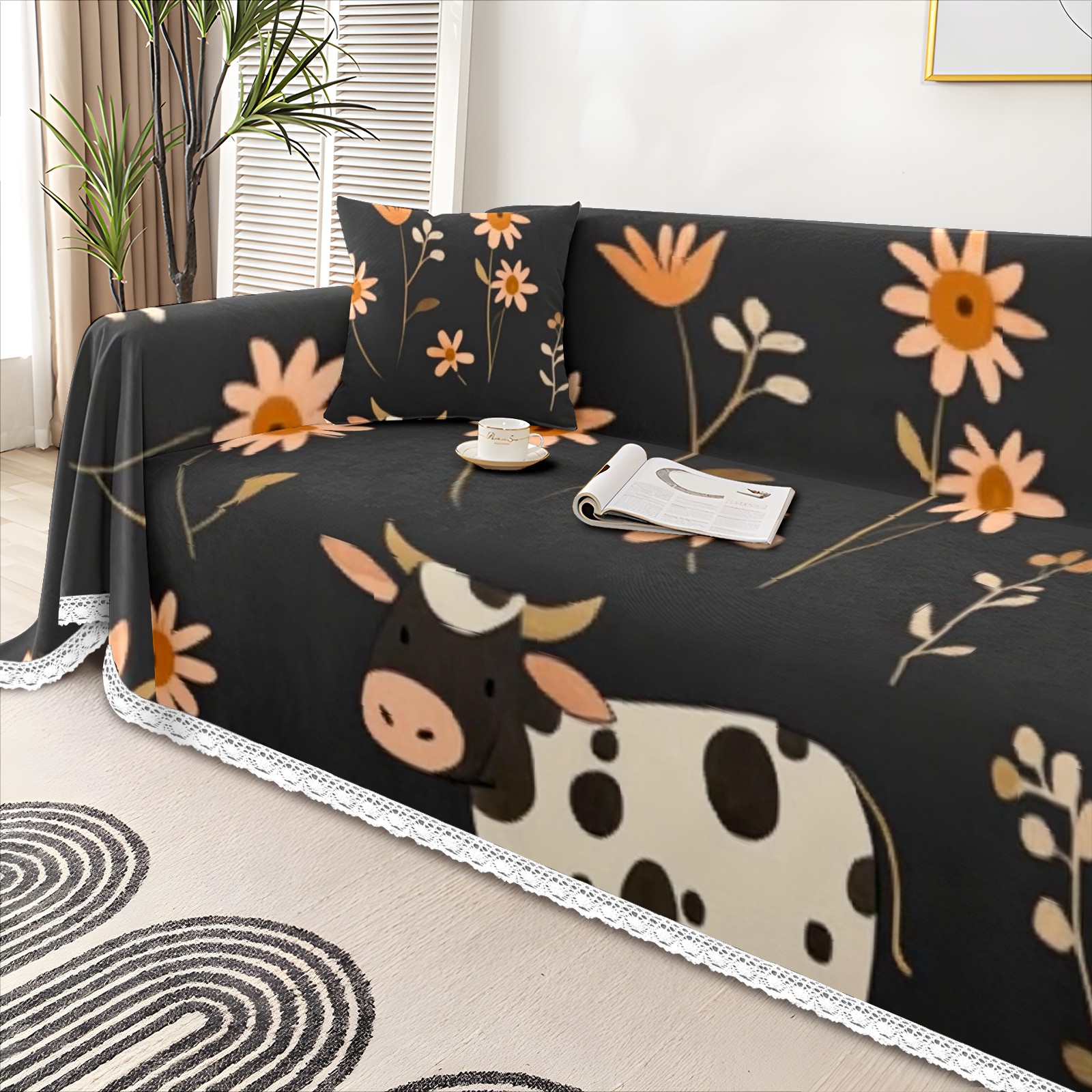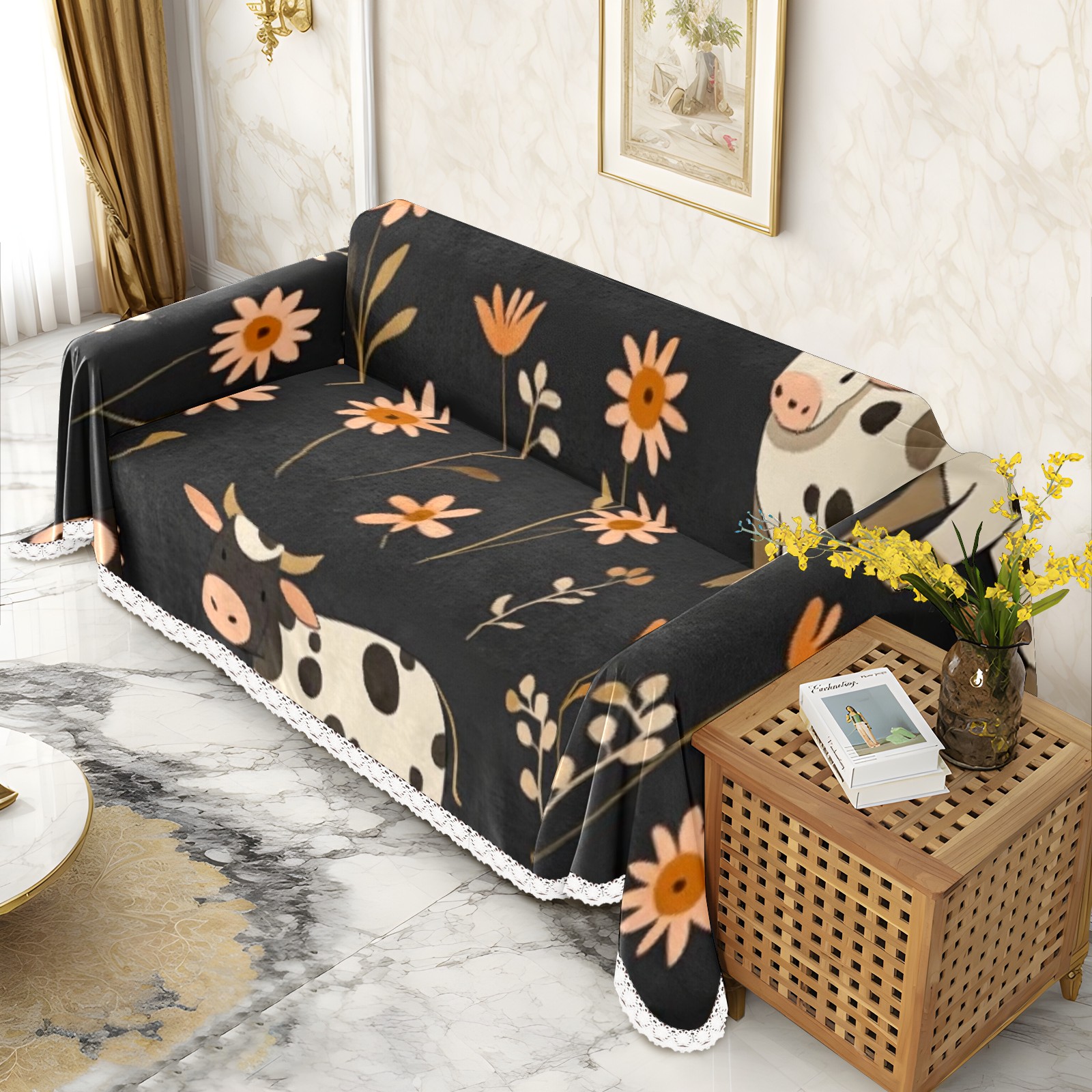 Cows And Flowers Sofa Cover-Soft Poly-Cotton Blend, Machine Washable Couch Protector for Home Decor - 71x91 in Couch Covers