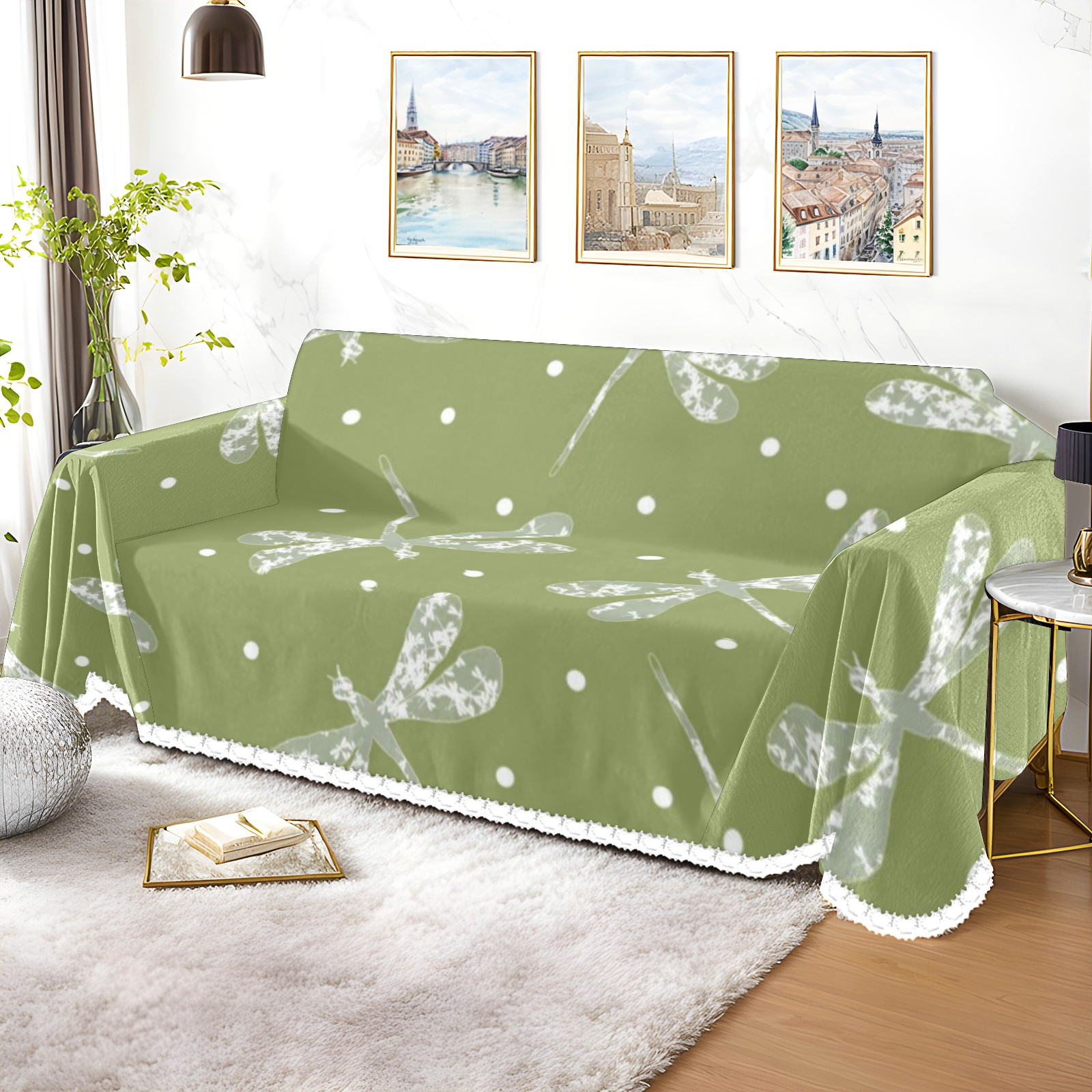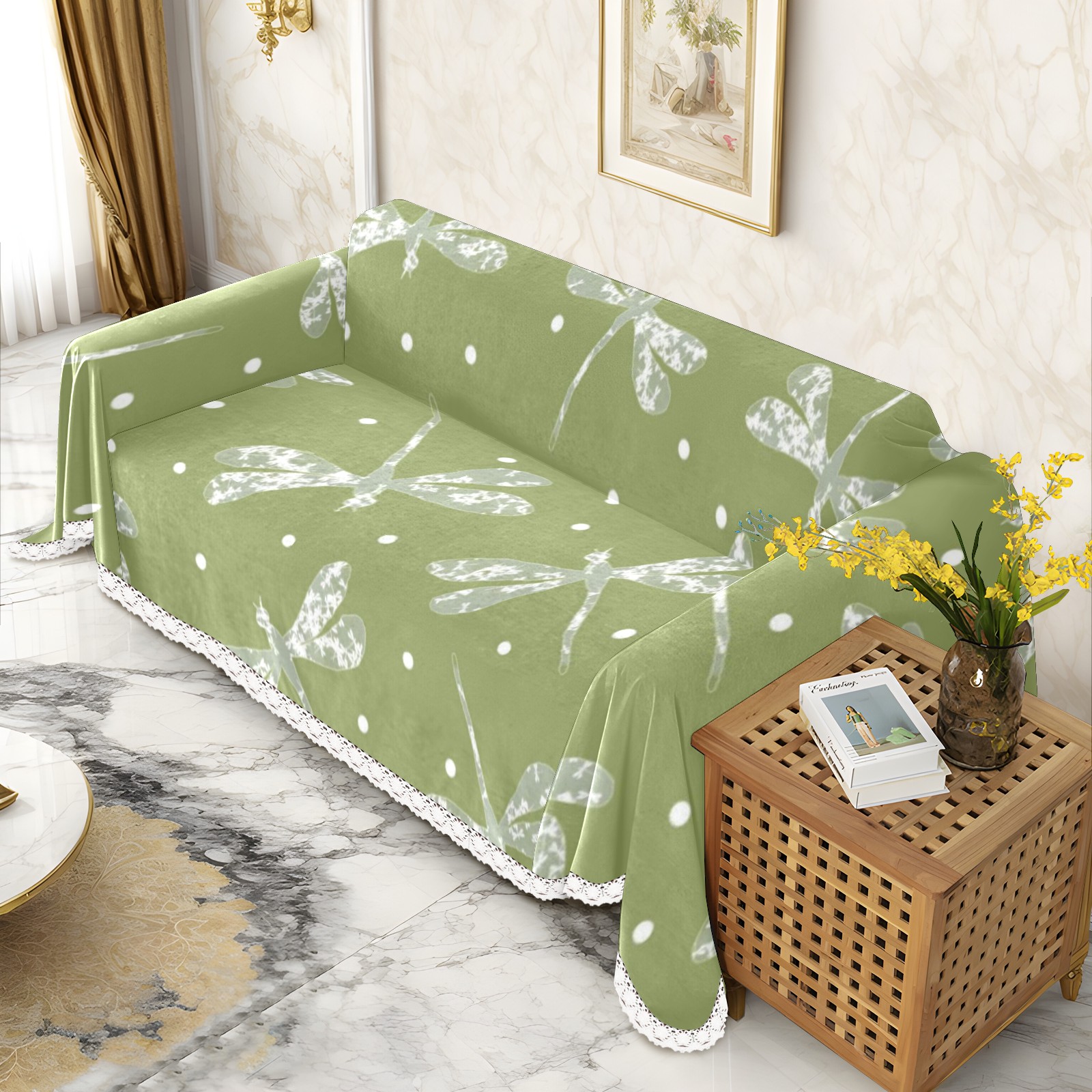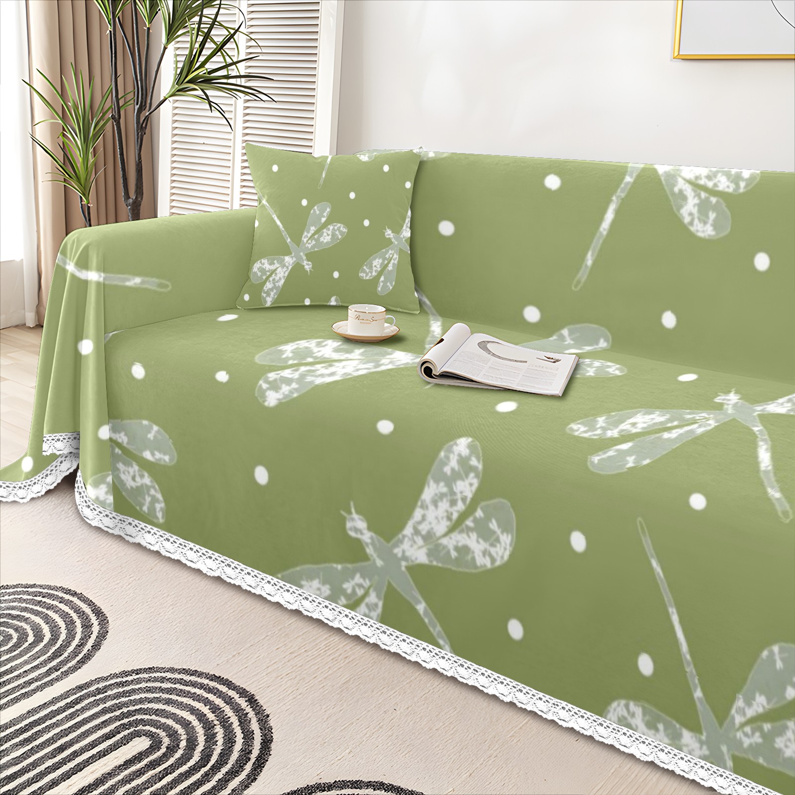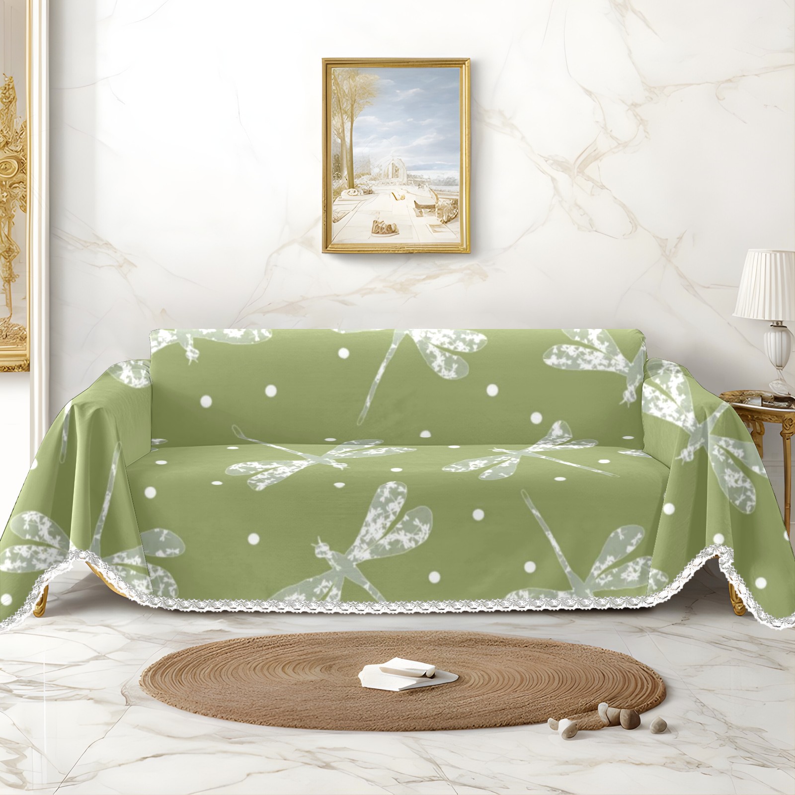 Green White Dots And Dragonflies Sofa Cover-Soft Poly-Cotton Blend, Machine Washable Couch Protector for Home Decor - 71x91 in Couch Covers
