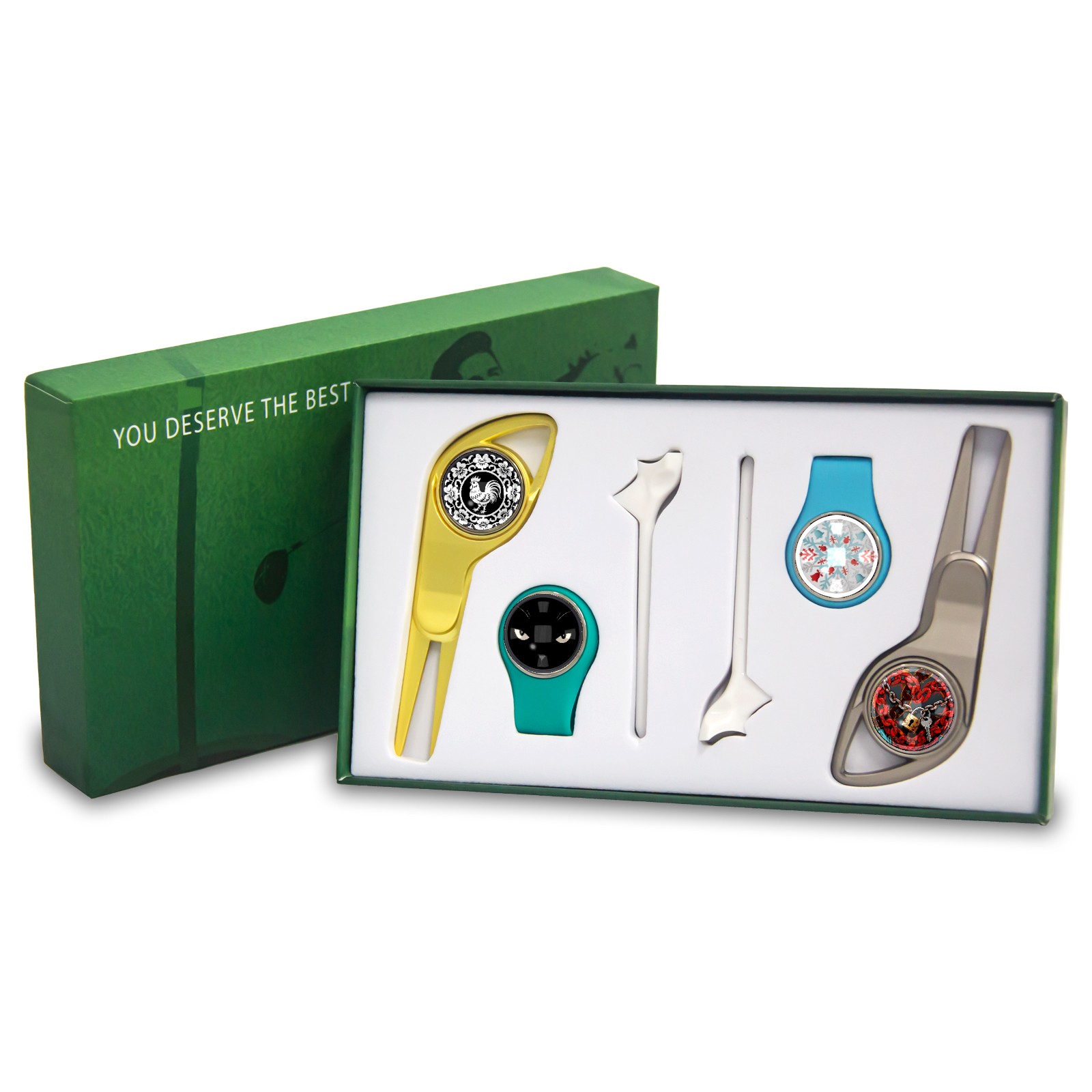 <p>The all-purpose gift box created for golf lovers is now available! It is packed in a reinforced paper box with a high-quality texture and is not easy to deform. The moment you open the gift box, you will see its exquisite style. It contains 2 green forks,2 hat clips, 2 tacks and 4 magnetic glass markers. From course repair to equipment embellishment, to precise marking, this set of golf essential artifacts is a secret weapon to improve your performance on the field. </p> <p>Whether it is a birthday, Father's Day, or other special moments, this gift box is a perfect gift for golfers of all experience levels, helping them to swing confidently on the course and win. The intimate design suitable for both men and women makes it a popular choice among golf enthusiasts. Its compact and portable features make it easy to accompany you to the golf course, driving range, or to various outdoor swing holy places, making every shot full of ritual and professionalism!</p>