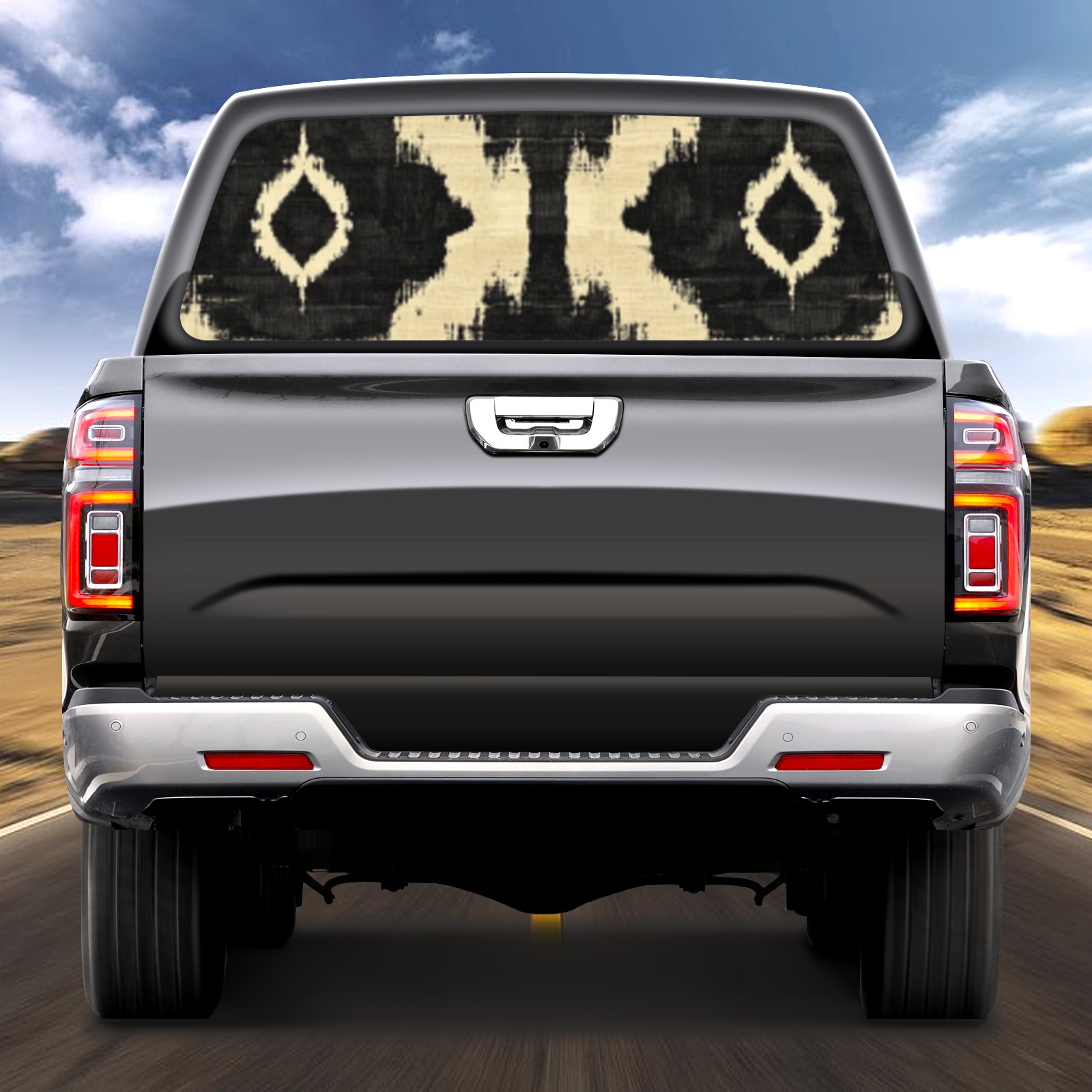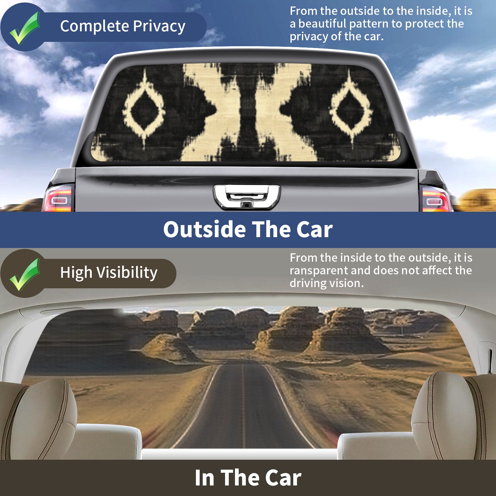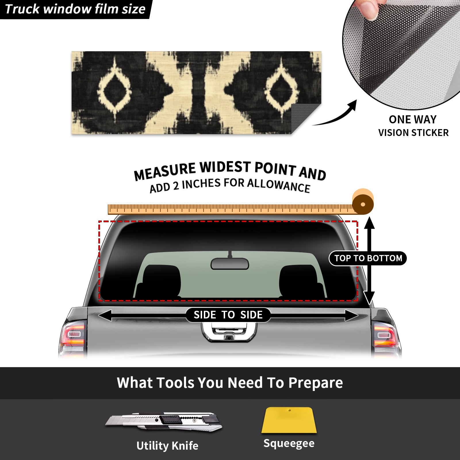 • ●<b>Truck Rear Window Graphics Decals Pickup Trucks Back Window Film Stickers 66" x 22" Perforated Vinyl Wrap Stickers Decorations for Car Rear Window.</b><br> <br> <b>Features :</b><br> - Size of the rear window decals for trucks is 66x22 Inches (168x56cm).<br> - High quality perforated vinyl window film, one way vision sticker.<br> - Perforated is see through from the inside but not from outside.<br> - Clear printing, waterproof and continued.<br> - The car back window graphics stickers fits most truck and makes your vehicle more beautiful.<br> <br> <b>【Installation Instructions】</b><br> <b>1. CLEAN SURFACE - </b>Clean the rear window thoroughly and make sure the surface clean.<br> <b>2. STICK THE DECALS - </b>Tear off the paper on the back and stick the decal on the window.<br> <b>3. SCRAPE OFF AIR BUBBLES - </b>Use a squeegee or other card to scrape off the excess air bubbles.<br> <b>4. TRIM THE EXCESS -</b> Use a knife to cut off the excess stickers of the window, finally complete.<br> 1. Please measure the size before purchasing, back window graphics decal for truck can be cut to your desired size.<br> 2.The graphics stickers for truck back window is a great gift for yourself also can as a birthday / halloween / christmas gift for your friends and family.<br> <b>Decorate Your Pickup Truck With Rear Window Decal Today!</b>