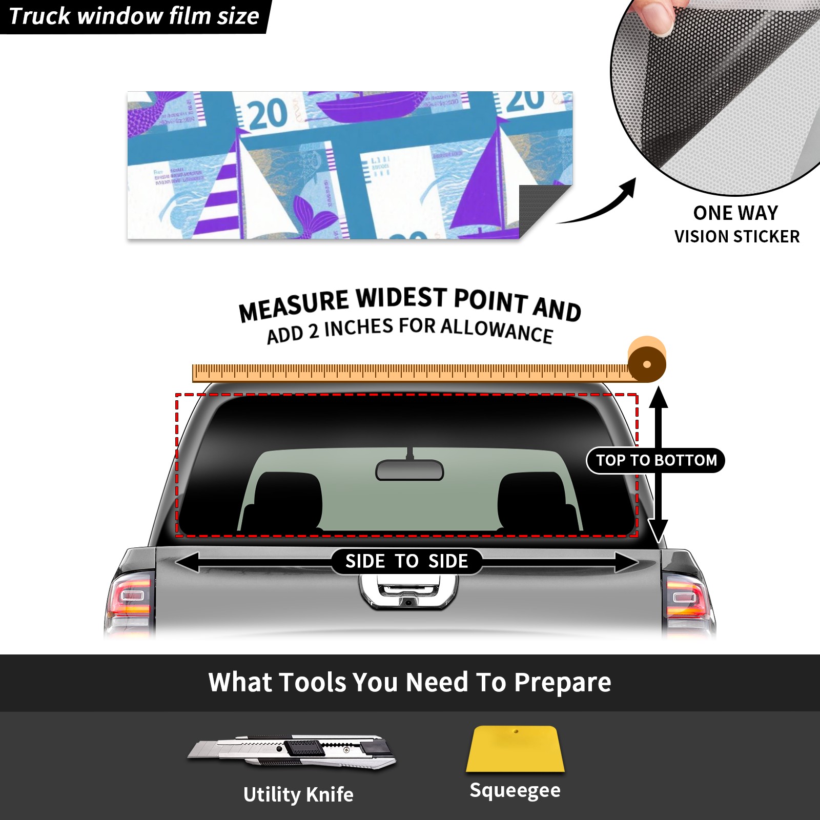 • ●<b>Truck Rear Window Graphics Decals Pickup Trucks Back Window Film Stickers 66" x 22" Perforated Vinyl Wrap Stickers Decorations for Car Rear Window.</b><br> <br> <b>Features :</b><br> - Size of the rear window decals for trucks is 66x22 Inches (168x56cm).<br> - High quality perforated vinyl window film, one way vision sticker.<br> - Perforated is see through from the inside but not from outside.<br> - Clear printing, waterproof and continued.<br> - The car back window graphics stickers fits most truck and makes your vehicle more beautiful.<br> <br> <b>【Installation Instructions】</b><br> <b>1. CLEAN SURFACE - </b>Clean the rear window thoroughly and make sure the surface clean.<br> <b>2. STICK THE DECALS - </b>Tear off the paper on the back and stick the decal on the window.<br> <b>3. SCRAPE OFF AIR BUBBLES - </b>Use a squeegee or other card to scrape off the excess air bubbles.<br> <b>4. TRIM THE EXCESS -</b> Use a knife to cut off the excess stickers of the window, finally complete.<br> 1. Please measure the size before purchasing, back window graphics decal for truck can be cut to your desired size.<br> 2.The graphics stickers for truck back window is a great gift for yourself also can as a birthday / halloween / christmas gift for your friends and family.<br> <b>Decorate Your Pickup Truck With Rear Window Decal Today!</b>