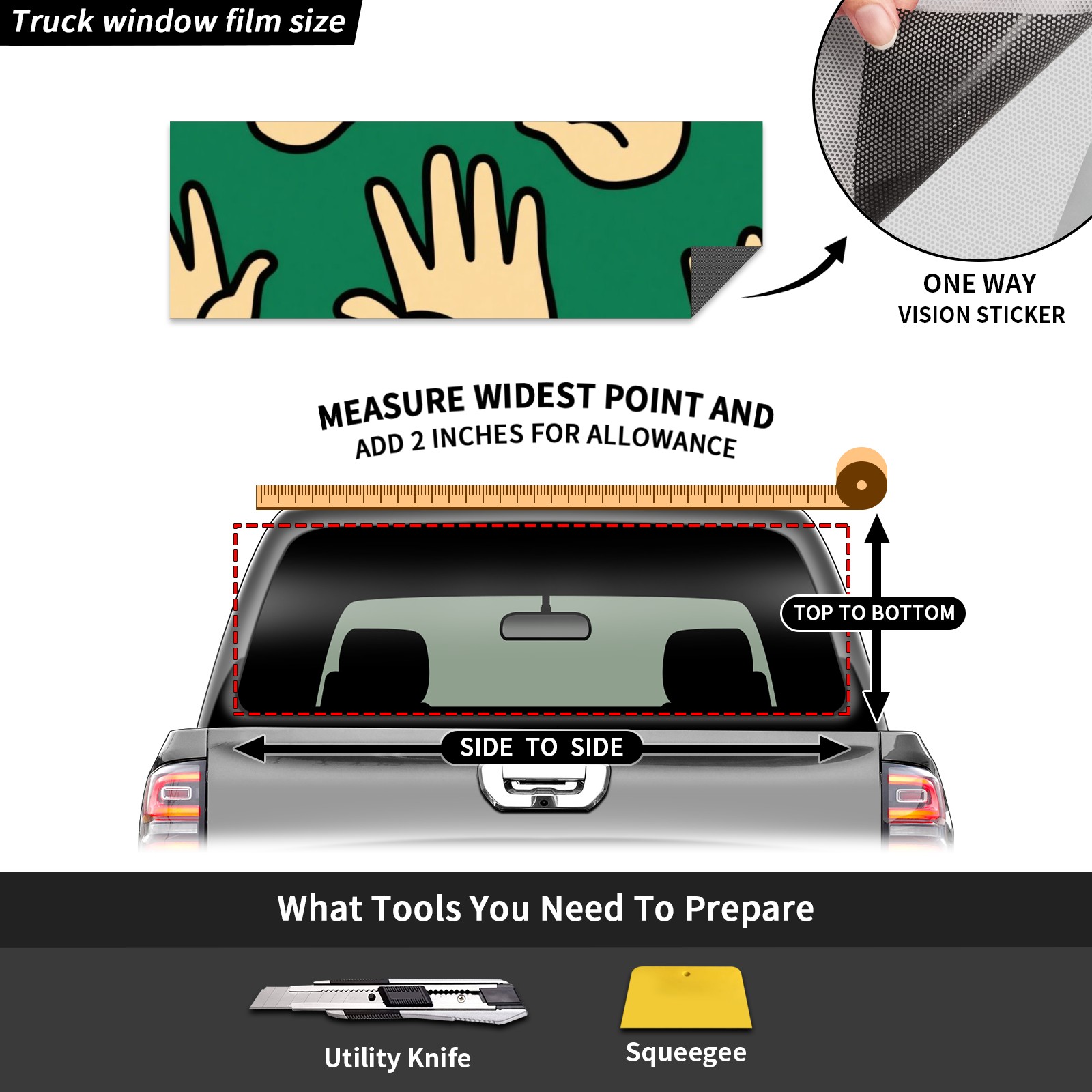 ●<b>Truck Rear Window Graphics Decals Pickup Trucks Back Window Film Stickers 66" x 22" Perforated Vinyl Wrap Stickers Decorations for Car Rear Window.</b><br> <br> <b>Features :</b><br> - Size of the rear window decals for trucks is 66x22 Inches (168x56cm).<br> - High quality perforated vinyl window film, one way vision sticker.<br> - Perforated is see through from the inside but not from outside.<br> - Clear printing, waterproof and continued.<br> - The car back window graphics stickers fits most truck and makes your vehicle more beautiful.<br> <br> <b>【Installation Instructions】</b><br> <b>1. CLEAN SURFACE - </b>Clean the rear window thoroughly and make sure the surface clean.<br> <b>2. STICK THE DECALS - </b>Tear off the paper on the back and stick the decal on the window.<br> <b>3. SCRAPE OFF AIR BUBBLES - </b>Use a squeegee or other card to scrape off the excess air bubbles.<br> <b>4. TRIM THE EXCESS -</b> Use a knife to cut off the excess stickers of the window, finally complete.<br> 1. Please measure the size before purchasing, back window graphics decal for truck can be cut to your desired size.<br> 2.The graphics stickers for truck back window is a great gift for yourself also can as a birthday / halloween / christmas gift for your friends and family.<br> <b>Decorate Your Pickup Truck With Rear Window Decal Today!</b>