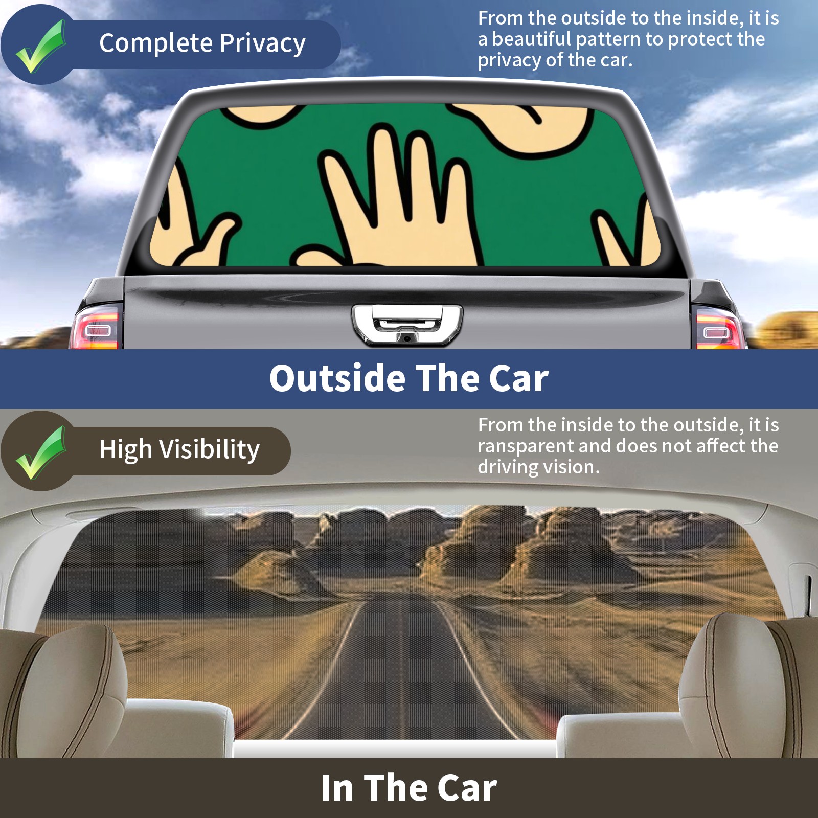 • ●<b>Truck Rear Window Graphics Decals Pickup Trucks Back Window Film Stickers 66" x 22" Perforated Vinyl Wrap Stickers Decorations for Car Rear Window.</b><br> <br> <b>Features :</b><br> - Size of the rear window decals for trucks is 66x22 Inches (168x56cm).<br> - High quality perforated vinyl window film, one way vision sticker.<br> - Perforated is see through from the inside but not from outside.<br> - Clear printing, waterproof and continued.<br> - The car back window graphics stickers fits most truck and makes your vehicle more beautiful.<br> <br> <b>【Installation Instructions】</b><br> <b>1. CLEAN SURFACE - </b>Clean the rear window thoroughly and make sure the surface clean.<br> <b>2. STICK THE DECALS - </b>Tear off the paper on the back and stick the decal on the window.<br> <b>3. SCRAPE OFF AIR BUBBLES - </b>Use a squeegee or other card to scrape off the excess air bubbles.<br> <b>4. TRIM THE EXCESS -</b> Use a knife to cut off the excess stickers of the window, finally complete.<br> 1. Please measure the size before purchasing, back window graphics decal for truck can be cut to your desired size.<br> 2.The graphics stickers for truck back window is a great gift for yourself also can as a birthday / halloween / christmas gift for your friends and family.<br> <b>Decorate Your Pickup Truck With Rear Window Decal Today!</b>