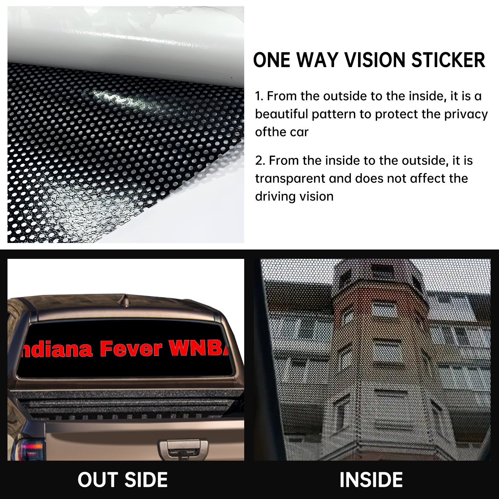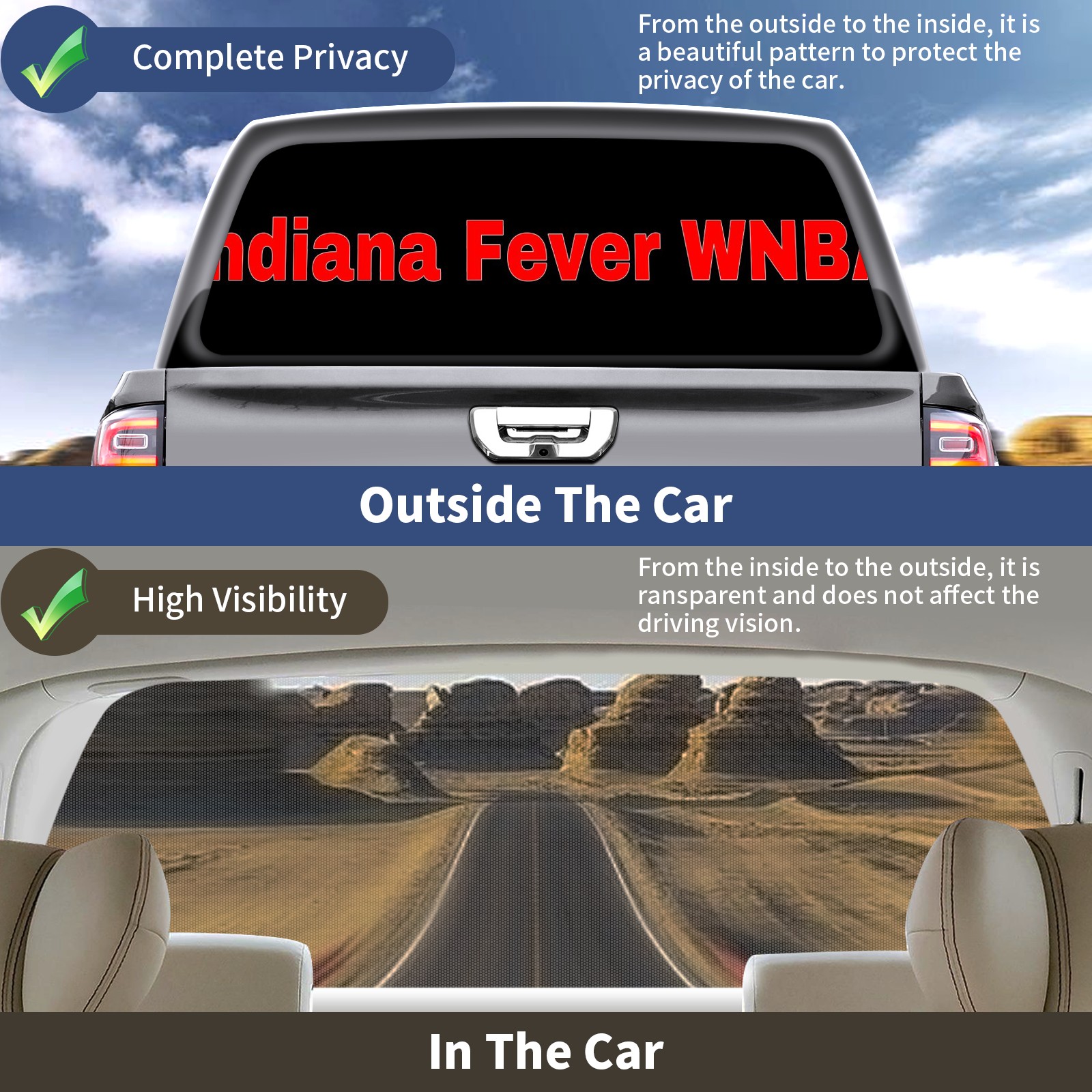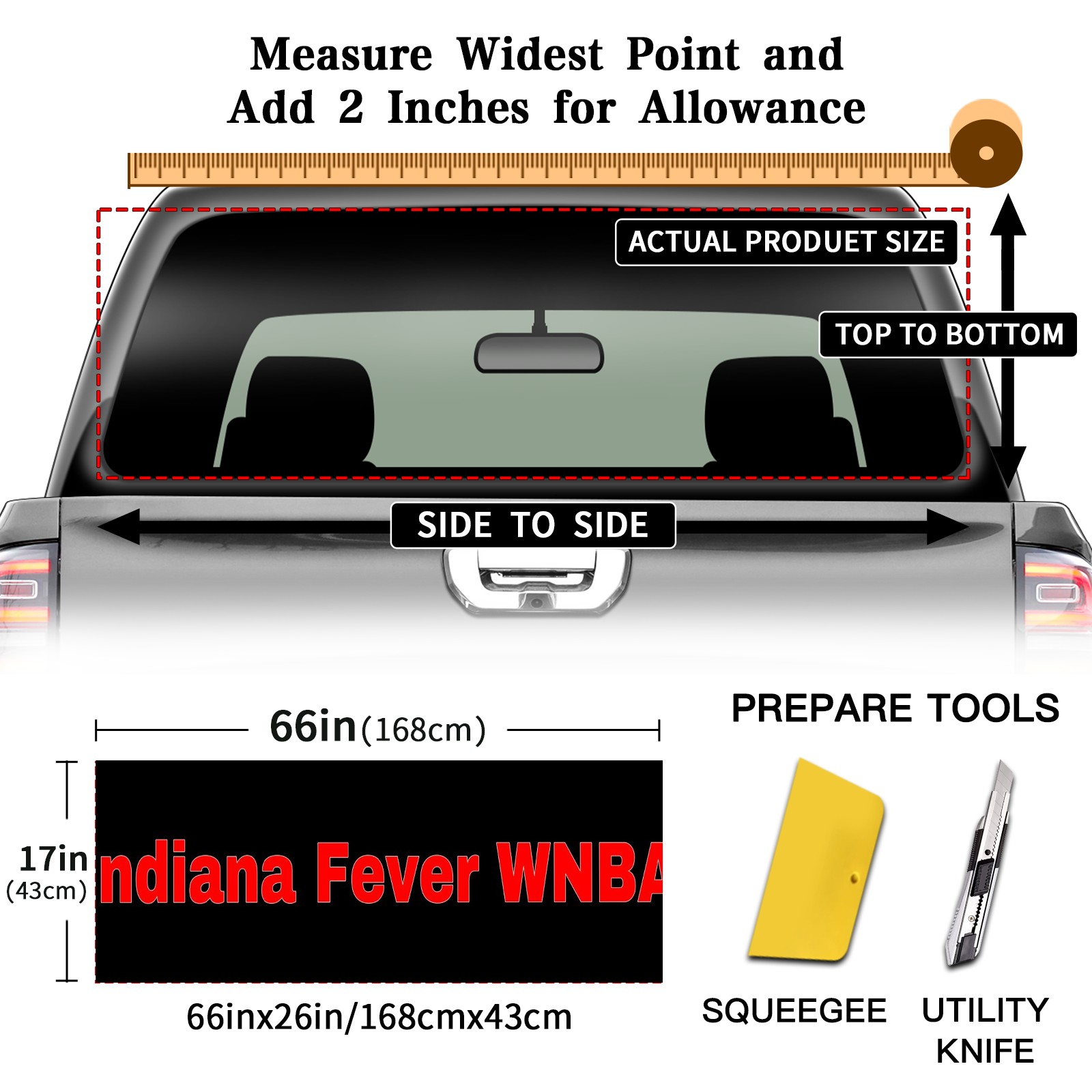 <p><strong>Truck Rear Window Graphics Decals Pickup Trucks Back Window Film Stickers 66" x 22" Perforated Vinyl Wrap Stickers Decorations for Car Rear Window</strong></p><p><strong><br /></strong></p><p><strong>Features :</strong></p><p>- Size of the rear window decals for trucks is 66x22 Inches (168x56cm).</p><p>- High quality perforated vinyl window film, one way vision sticker.</p><p>- Perforated is see through from the inside but not from outside.</p><p>- Clear printing, waterproof and durable.</p><p>- The car back window graphics stickers fits most truck and makes your vehicle more beautiful.&nbsp;</p><p><br /></p><p><strong>【Installation Instructions】</strong></p><p><strong>1. CLEAN SURFACE -</strong> Clean the rear window thoroughly and make sure the surface clean.</p><p><strong>2. STICK THE DECALS -</strong> Tear off the paper on the back and stick the decal on the window.</p><p><strong>3. SCRAPE OFF AIR BUBBLES -</strong> Use a squeegee or other card to scrape off the excess air bubbles.</p><p><strong>4. TRIM THE EXCESS -</strong> Use a knife to cut off the excess stickers of the window, finally complete.</p><p><br /></p><p>1. Please measure the size before purchasing, back window graphics decal for truck can be cut to your desired size.</p><p>2.The graphics stickers for truck back window is a great gift for yourself also can as a birthday / halloween / christmas gift for your friends and family.</p>