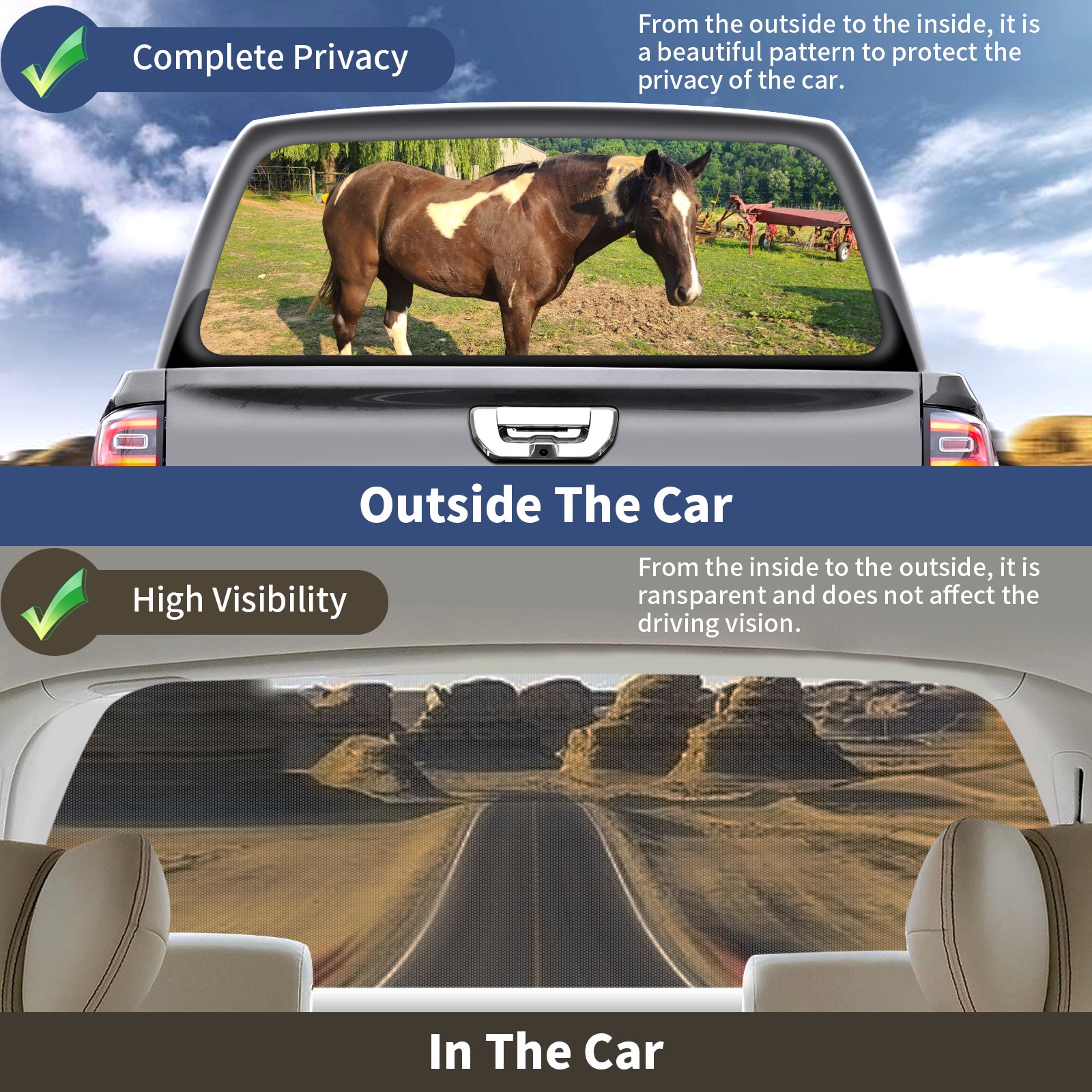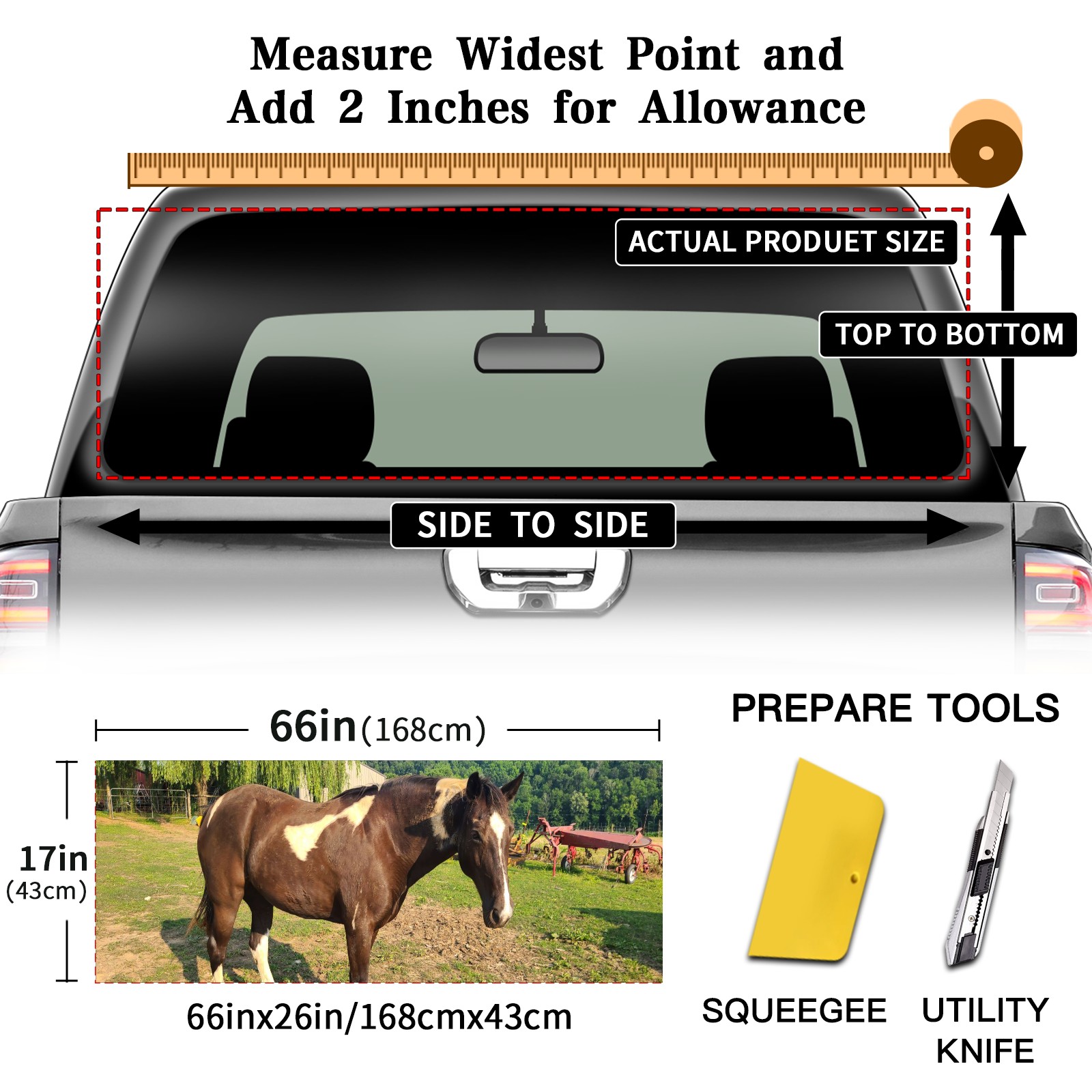 <p><strong>Truck Rear Window Graphics Decals Pickup Trucks Back Window Film Stickers 66" x 22" Perforated Vinyl Wrap Stickers Decorations for Car Rear Window</strong></p><p><strong><br /></strong></p><p><strong>Features :</strong></p><p>- Size of the rear window decals for trucks is 66x22 Inches (168x56cm).</p><p>- High quality perforated vinyl window film, one way vision sticker.</p><p>- Perforated is see through from the inside but not from outside.</p><p>- Clear printing, waterproof and durable.</p><p>- The car back window graphics stickers fits most truck and makes your vehicle more beautiful.&nbsp;</p><p><br /></p><p><strong>【Installation Instructions】</strong></p><p><strong>1. CLEAN SURFACE -</strong> Clean the rear window thoroughly and make sure the surface clean.</p><p><strong>2. STICK THE DECALS -</strong> Tear off the paper on the back and stick the decal on the window.</p><p><strong>3. SCRAPE OFF AIR BUBBLES -</strong> Use a squeegee or other card to scrape off the excess air bubbles.</p><p><strong>4. TRIM THE EXCESS -</strong> Use a knife to cut off the excess stickers of the window, finally complete.</p><p><br /></p><p>1. Please measure the size before purchasing, back window graphics decal for truck can be cut to your desired size.</p><p>2.The graphics stickers for truck back window is a great gift for yourself also can as a birthday / halloween / christmas gift for your friends and family.</p>