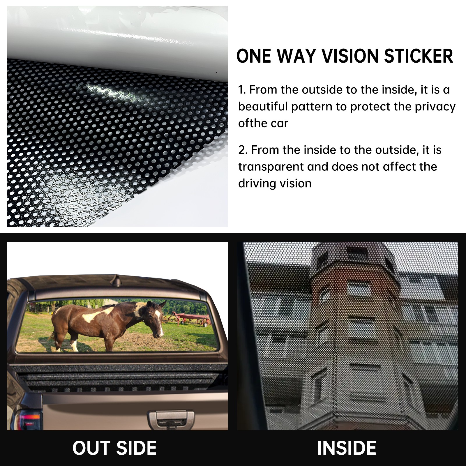 • <p><strong>Truck Rear Window Graphics Decals Pickup Trucks Back Window Film Stickers 66" x 22" Perforated Vinyl Wrap Stickers Decorations for Car Rear Window</strong></p><p><strong><br /></strong></p><p><strong>Features :</strong></p><p>- Size of the rear window decals for trucks is 66x22 Inches (168x56cm).</p><p>- High quality perforated vinyl window film, one way vision sticker.</p><p>- Perforated is see through from the inside but not from outside.</p><p>- Clear printing, waterproof and durable.</p><p>- The car back window graphics stickers fits most truck and makes your vehicle more beautiful.&nbsp;</p><p><br /></p><p><strong>【Installation Instructions】</strong></p><p><strong>1. CLEAN SURFACE -</strong> Clean the rear window thoroughly and make sure the surface clean.</p><p><strong>2. STICK THE DECALS -</strong> Tear off the paper on the back and stick the decal on the window.</p><p><strong>3. SCRAPE OFF AIR BUBBLES -</strong> Use a squeegee or other card to scrape off the excess air bubbles.</p><p><strong>4. TRIM THE EXCESS -</strong> Use a knife to cut off the excess stickers of the window, finally complete.</p><p><br /></p><p>1. Please measure the size before purchasing, back window graphics decal for truck can be cut to your desired size.</p><p>2.The graphics stickers for truck back window is a great gift for yourself also can as a birthday / halloween / christmas gift for your friends and family.</p>
