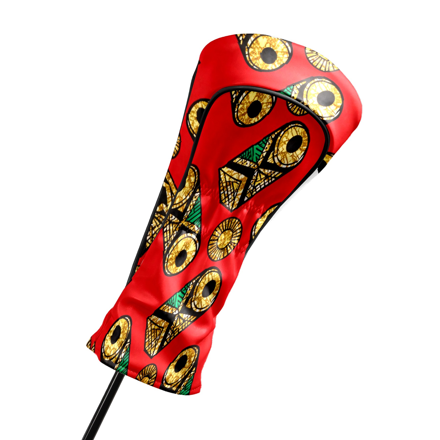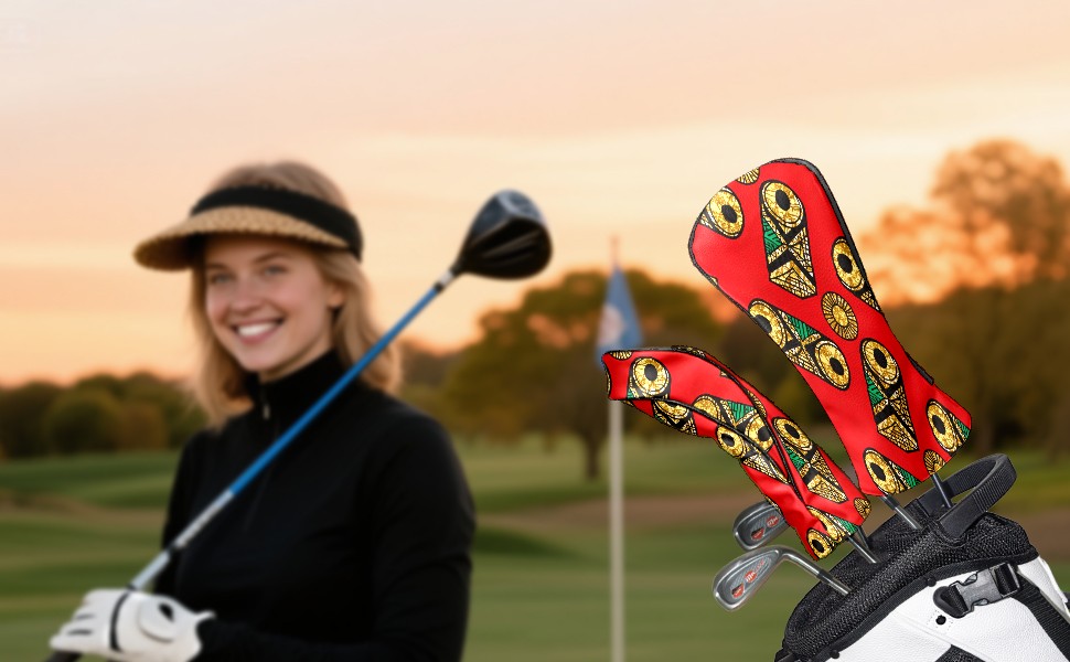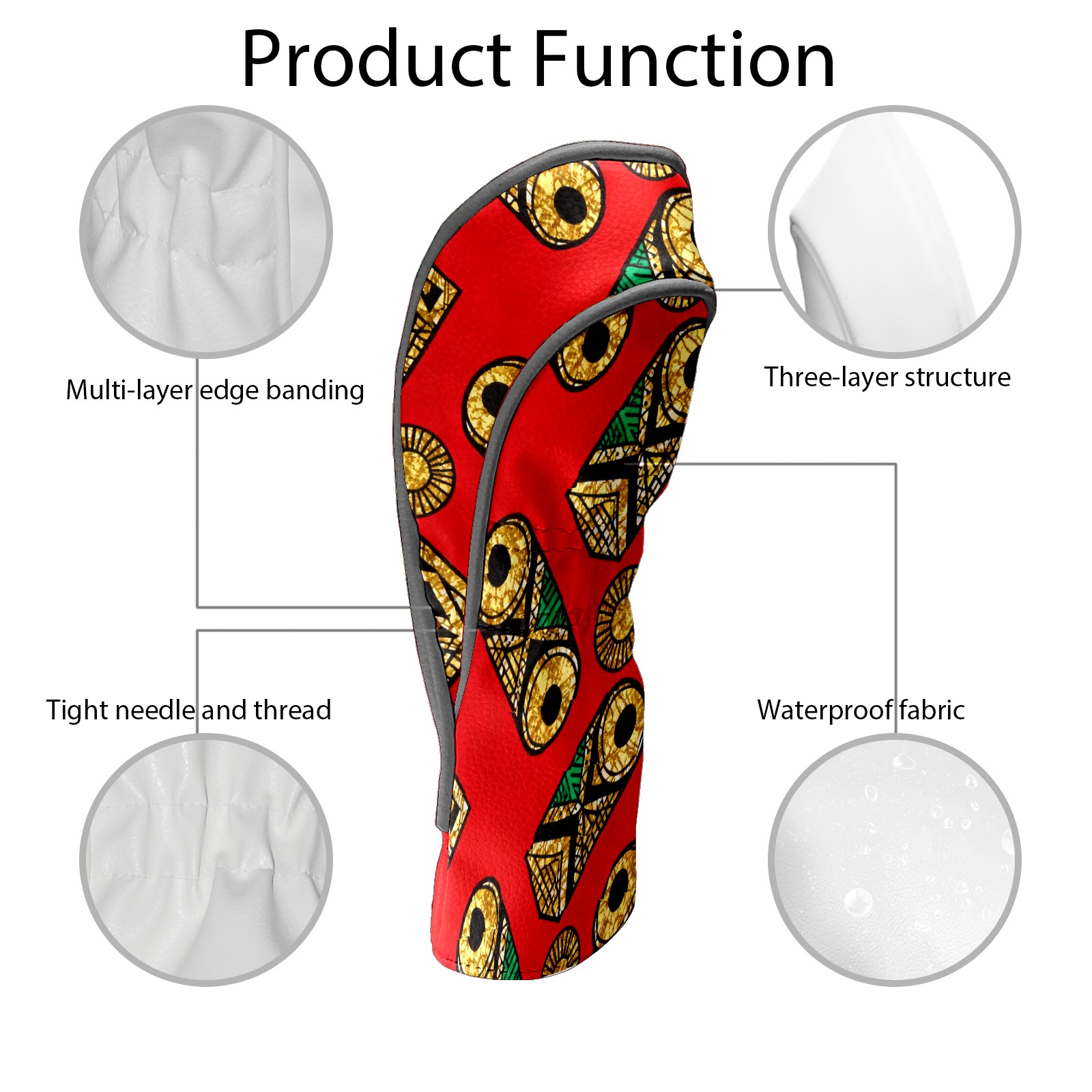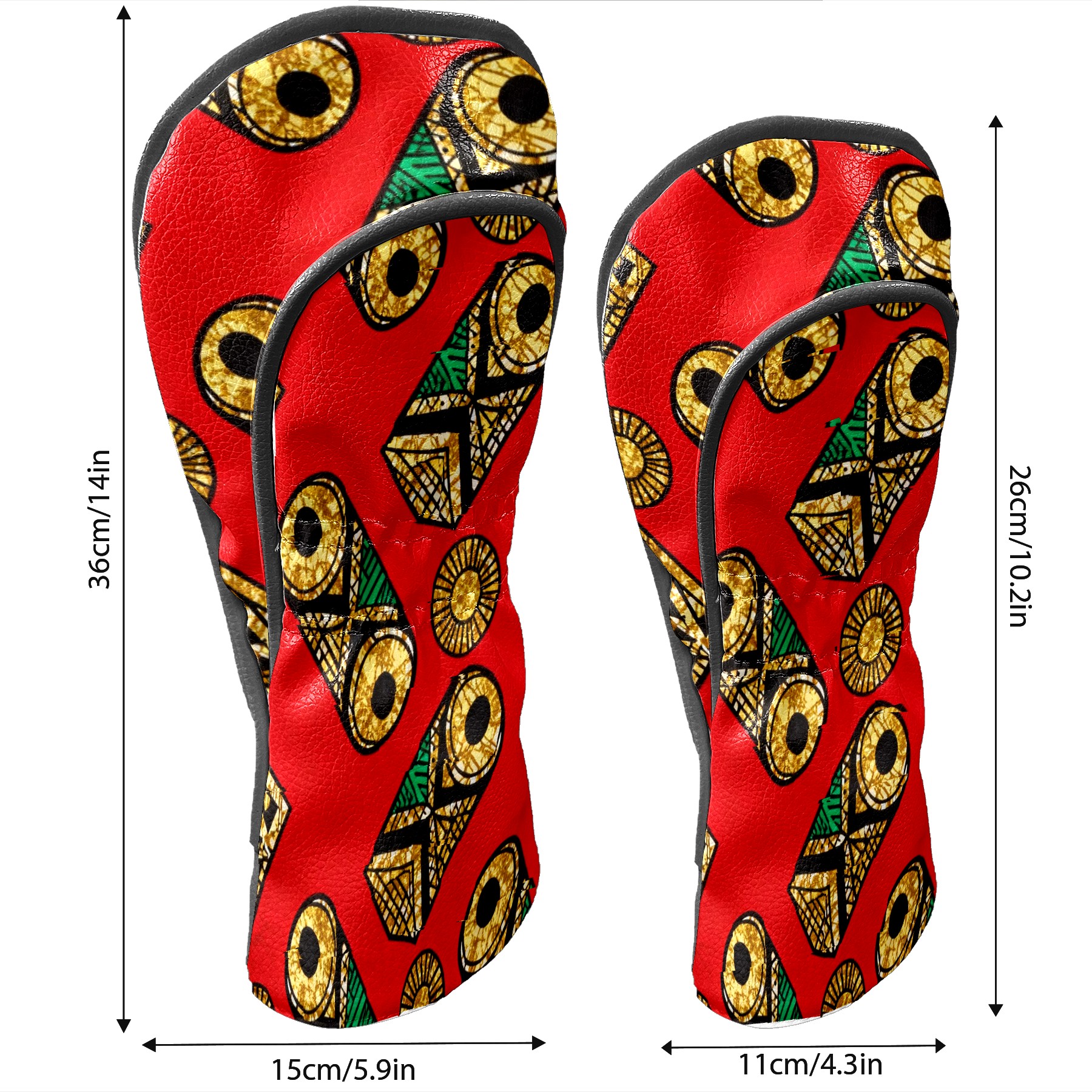 Golf Club Covers, Red GeometricOrnament Premium PU Leather Driver Hybrid Putter Head Covers with Velvet Lining, Waterproof Golf Gifts for Men Women