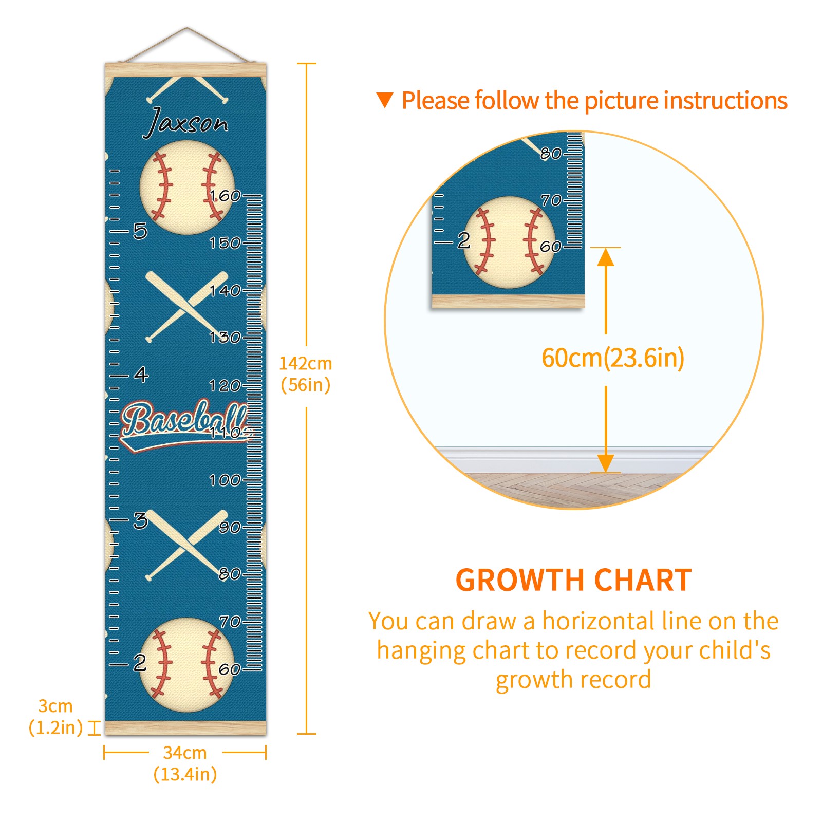<p><b>Features:</b></p> <p>Rope for Hanging</p> <p>Material: Linen + Wood</p> <p>Dimensions: 13.4x56 inches</p> <p>Package Included: 1 * Baby Growth Chart</p> <p><b>Baby height growth chart can be used anywhere</b></p> <p>Ideal for kids nursery decoration, kids bedroom, interior walls or windows, playroom, living room, homedecoration.Add name and make the growth chart special!</p> <p><b>Easy to fold and carry</b></p> <p>With rope at the top of the growth chart, it is easy to install and remove.You can fold it and unfold any time any where.</p> <p><b>Perfect Gift Idea for Kids</b></p> <p>Environmental and non-toxic for kids use, it must be a perfect gift for baby, kids, girls, and boys.This is a best choice for your friend who have kids or baby as a popular gift.</p> <p><b>Easy to read</b></p> <p>Measurement accrate with 2 scales, Centimeters and feet. The letters are big enough, very easy to read.</p> <p><b>60cm(23.6inch) Over Ground Design</b></p> <p>Not only can protect from dust and other damage, but also will not interfere in floor cleaning.</p>