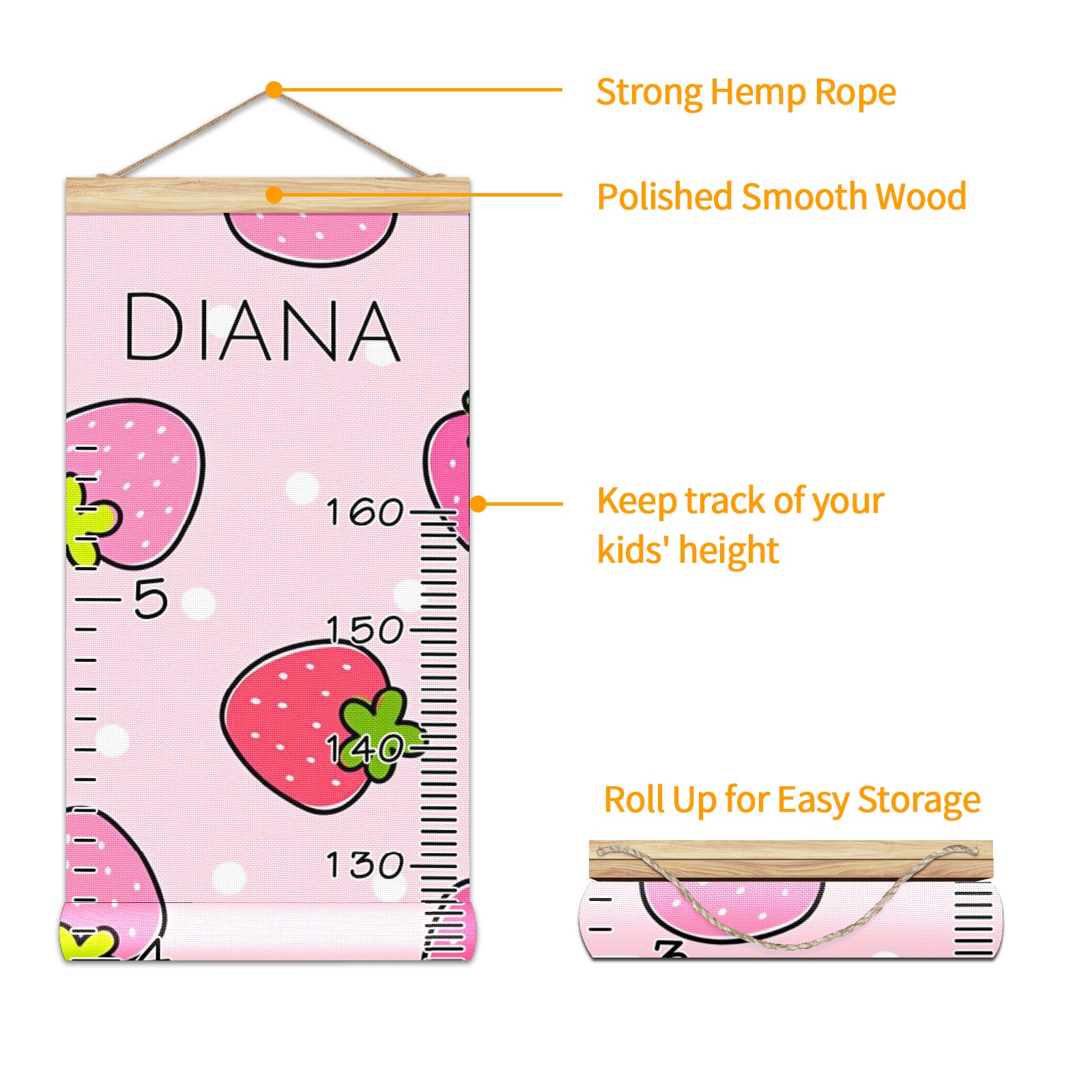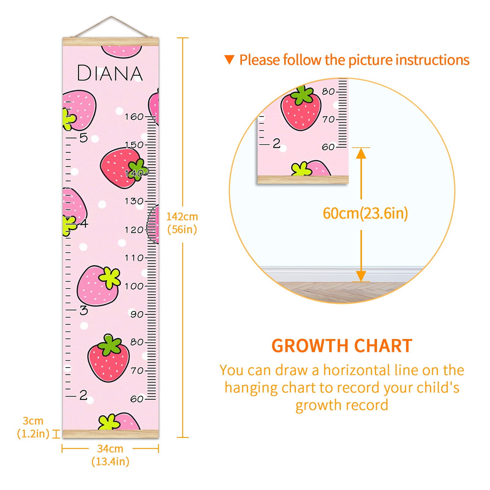<p><b>Features:</b></p> <p>Rope for Hanging</p> <p>Material: Linen + Wood</p> <p>Dimensions: 13.4x56 inches</p> <p>Package Included: 1 * Baby Growth Chart</p> <p><b>Baby height growth chart can be used anywhere</b></p> <p>Ideal for kids nursery decoration, kids bedroom, interior walls or windows, playroom, living room, homedecoration.Add name and make the growth chart special!</p> <p><b>Easy to fold and carry</b></p> <p>With rope at the top of the growth chart, it is easy to install and remove.You can fold it and unfold any time any where.</p> <p><b>Perfect Gift Idea for Kids</b></p> <p>Environmental and non-toxic for kids use, it must be a perfect gift for baby, kids, girls, and boys.This is a best choice for your friend who have kids or baby as a popular gift.</p> <p><b>Easy to read</b></p> <p>Measurement accrate with 2 scales, Centimeters and feet. The letters are big enough, very easy to read.</p> <p><b>60cm(23.6inch) Over Ground Design</b></p> <p>Not only can protect from dust and other damage, but also will not interfere in floor cleaning.</p>