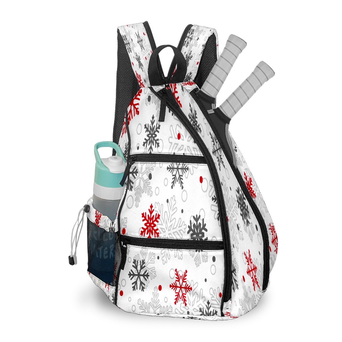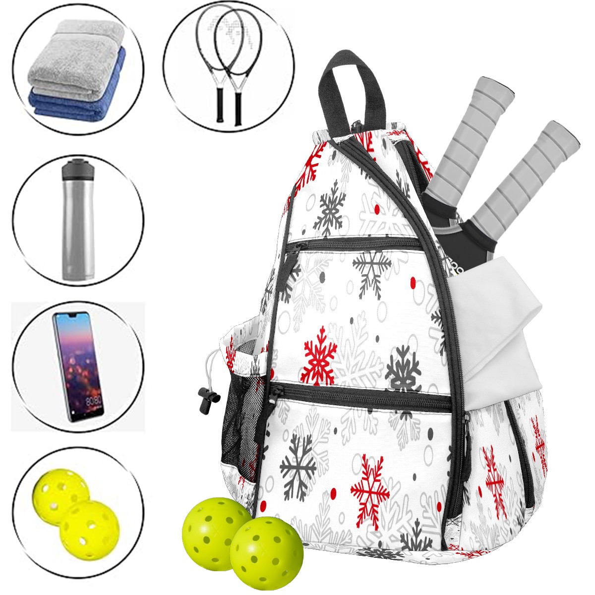 Pickleball Sling Bag for Women and Men - Backpack with Nylon Fabric - Woven Strap - Mesh Pocket - Fence Hook - Crossbody Red And Gray Snowflake