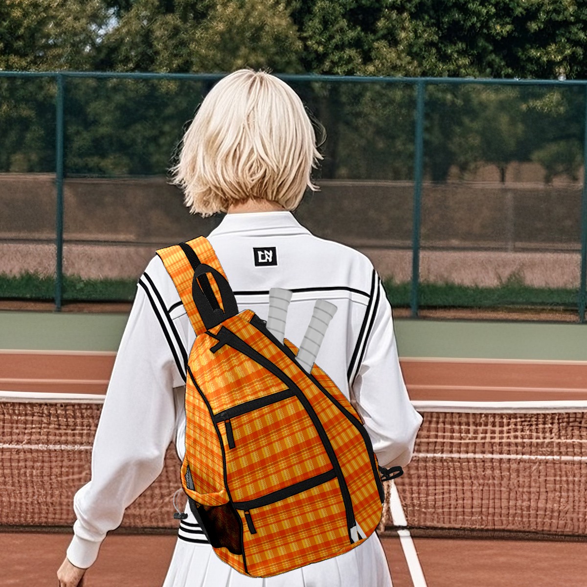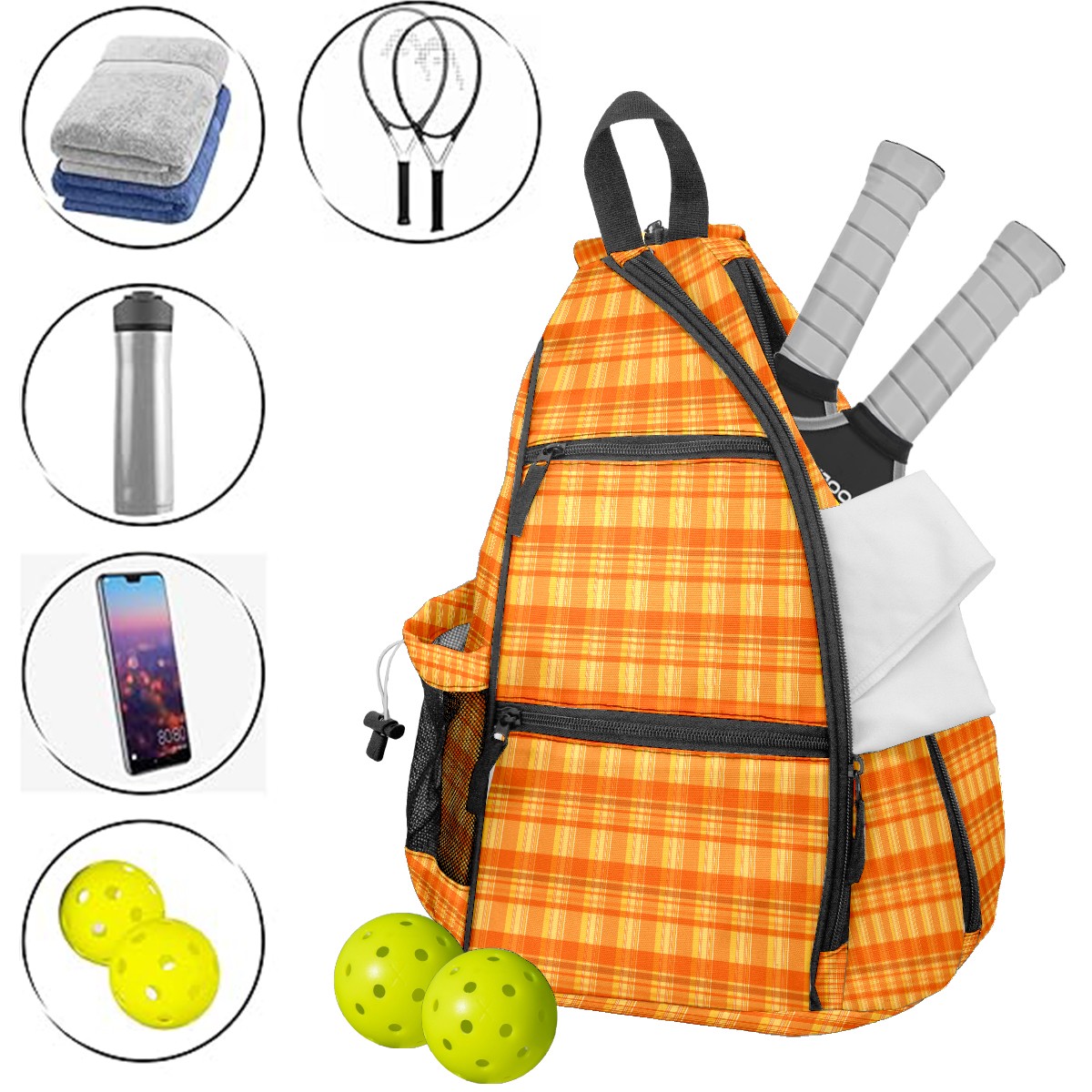 Pickleball Sling Bag for Women and Men - Backpack with Nylon Fabric - Woven Strap - Mesh Pocket - Fence Hook - Crossbody Orange Plaid Squares