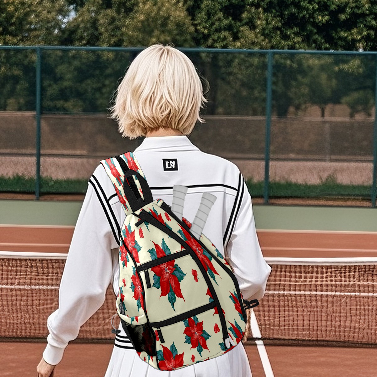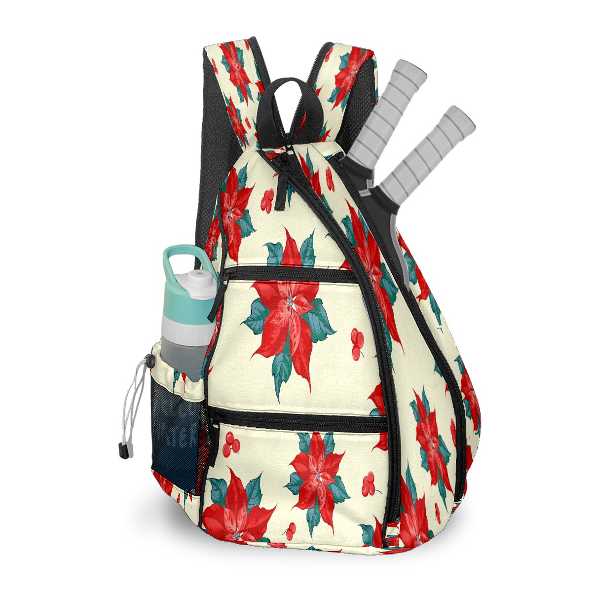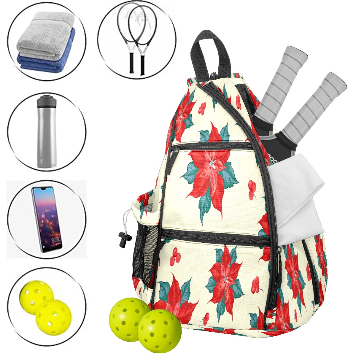 Pickleball Sling Bag for Women and Men - Backpack with Nylon Fabric - Woven Strap - Mesh Pocket - Fence Hook - Crossbody Merry Xmas Poinsettia Flower Pattern