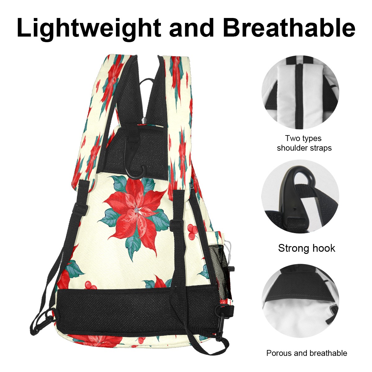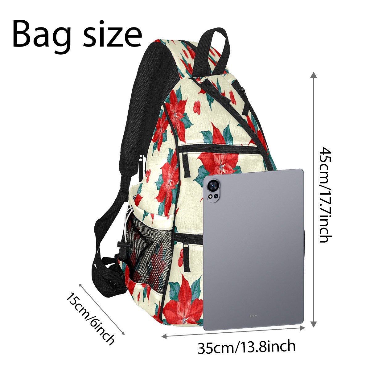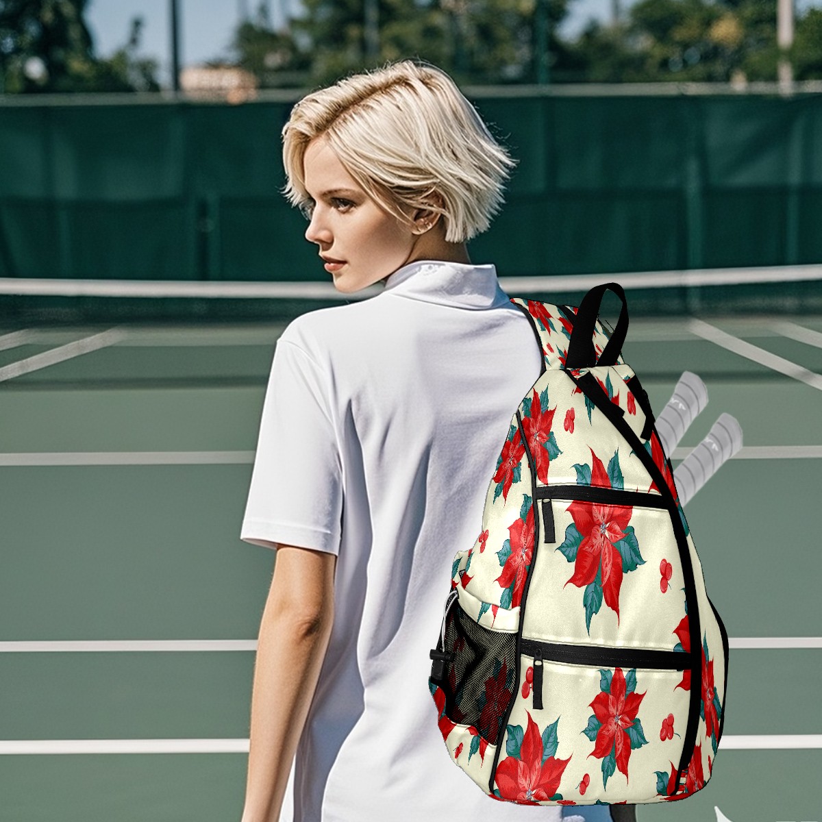 Pickleball Sling Bag for Women and Men - Backpack with Nylon Fabric - Woven Strap - Mesh Pocket - Fence Hook - Crossbody Merry Xmas Poinsettia Flower Pattern