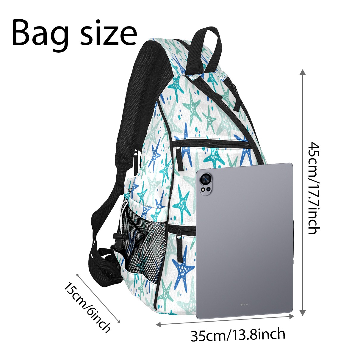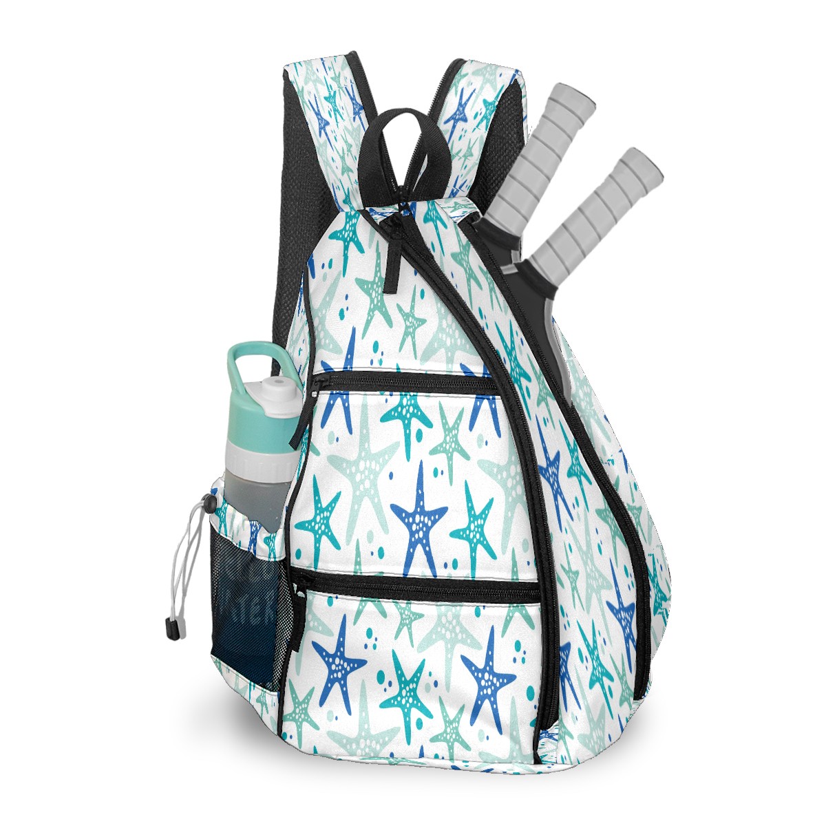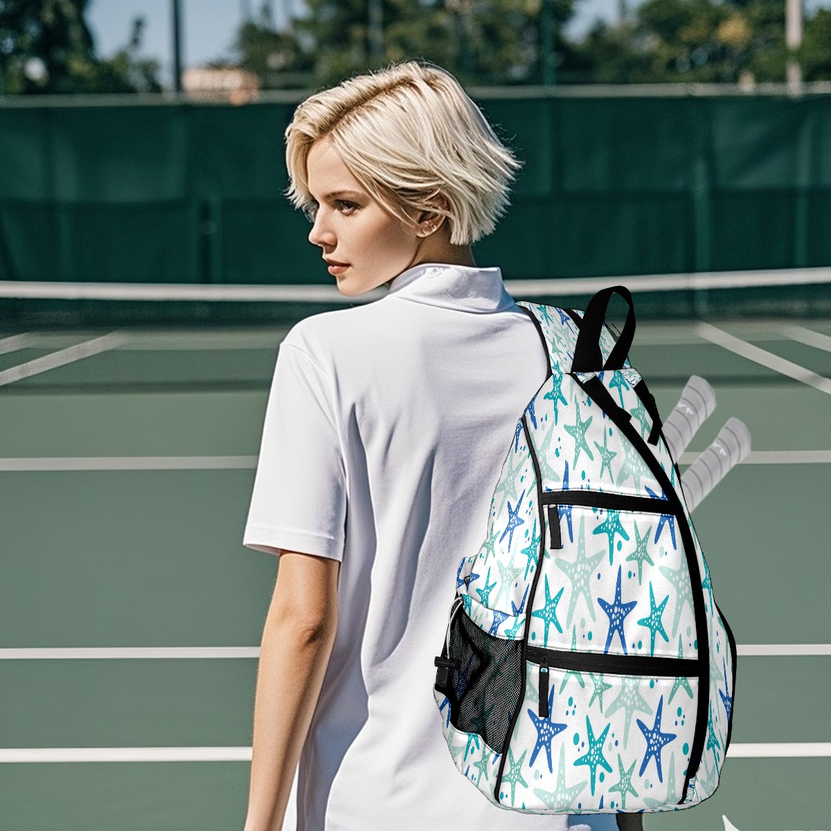 Pickleball Sling Bag for Women and Men - Backpack with Nylon Fabric - Woven Strap - Mesh Pocket - Fence Hook - Crossbody Blue Green Sea Starfishes Pattern