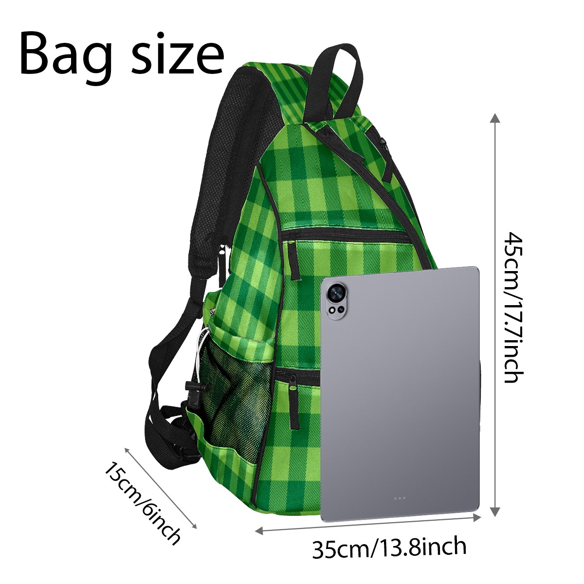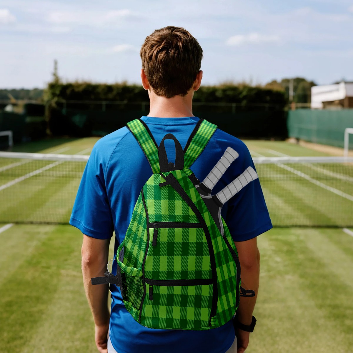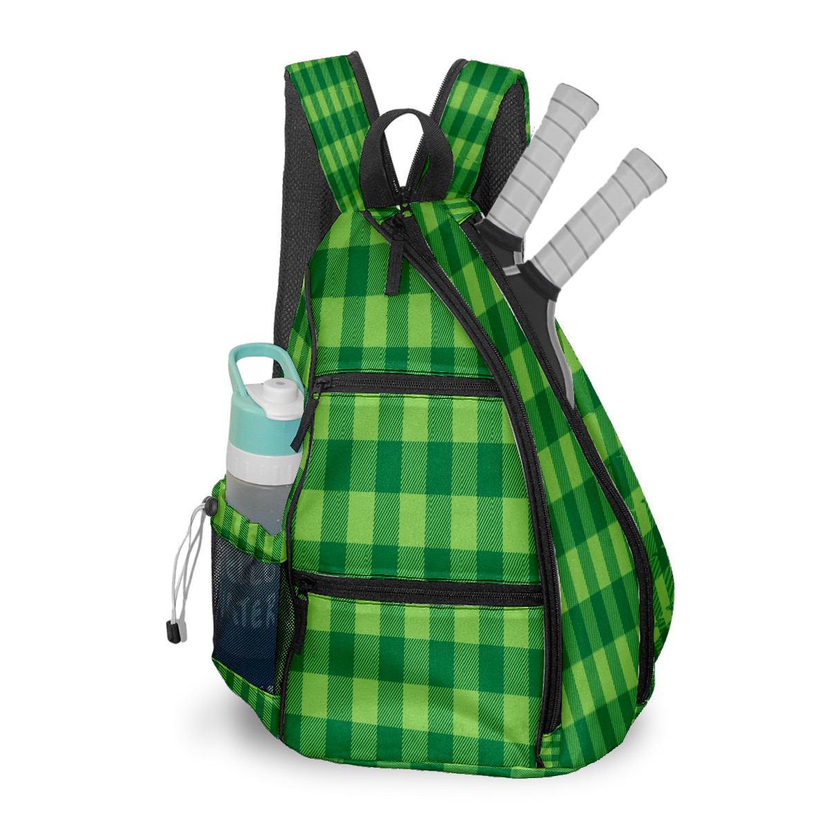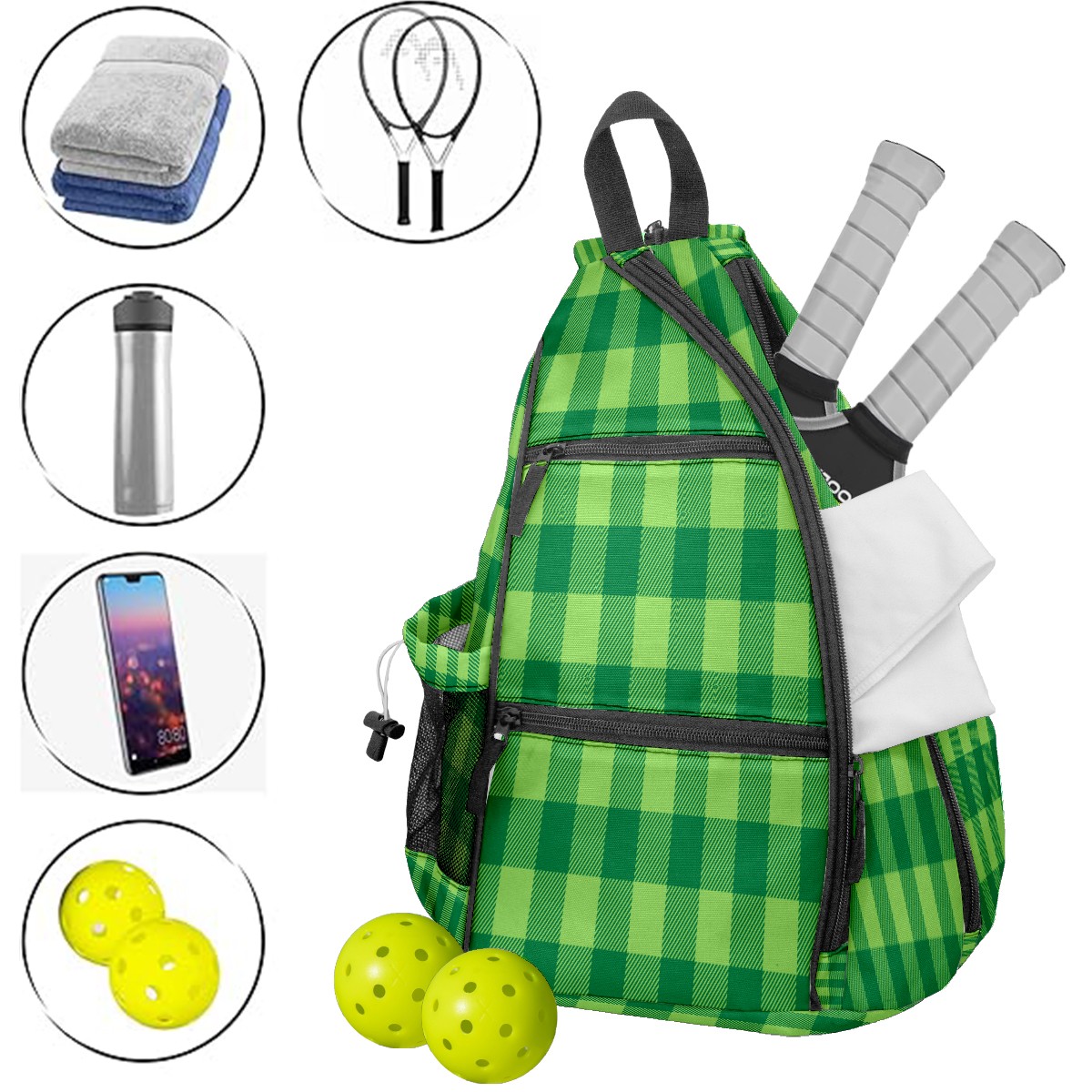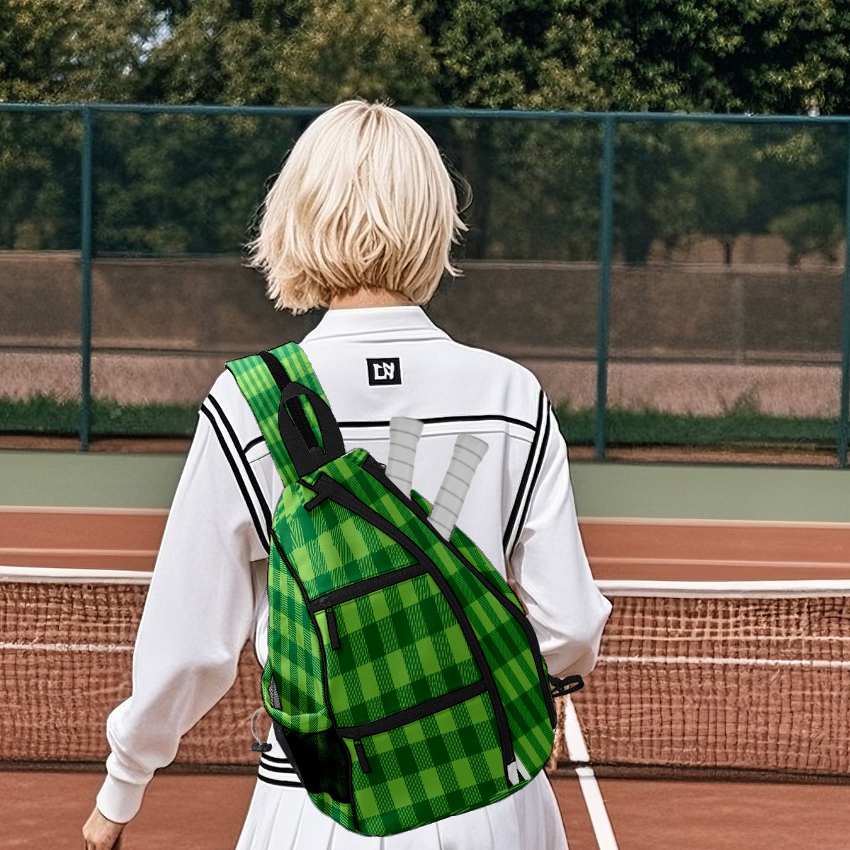 Pickleball Sling Bag for Women and Men - Backpack with Nylon Fabric - Woven Strap - Mesh Pocket - Fence Hook - Crossbody Green Tartan Pattern