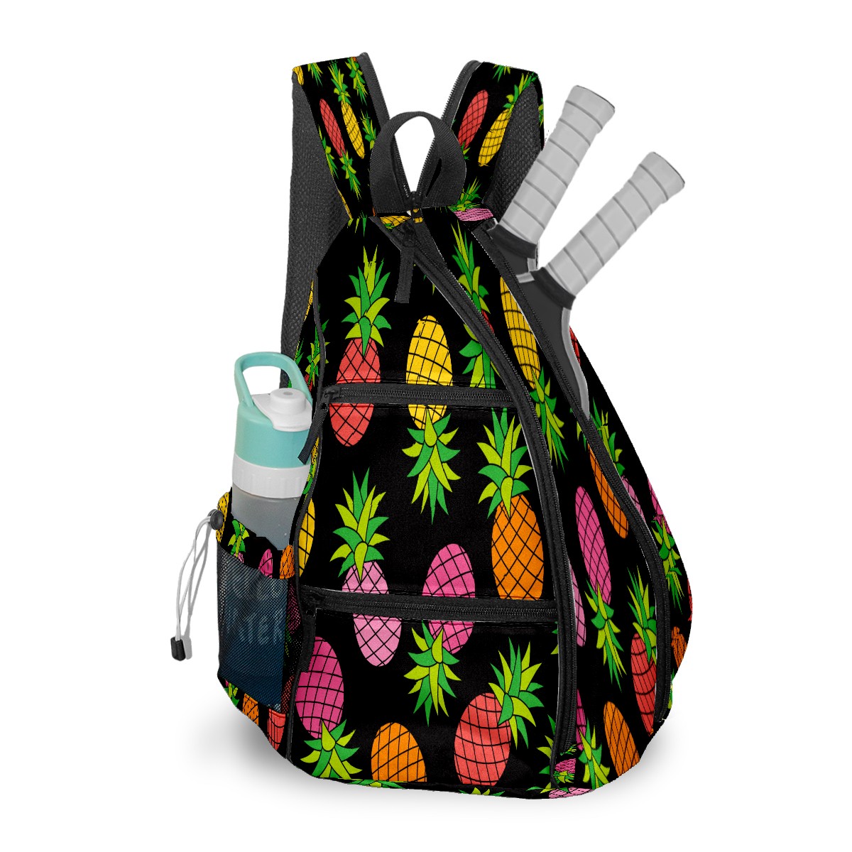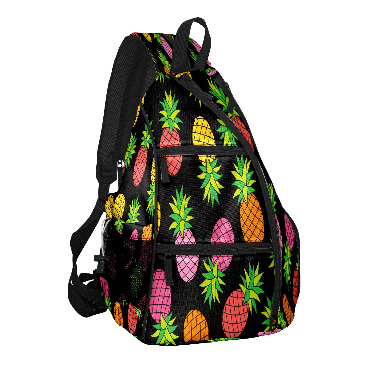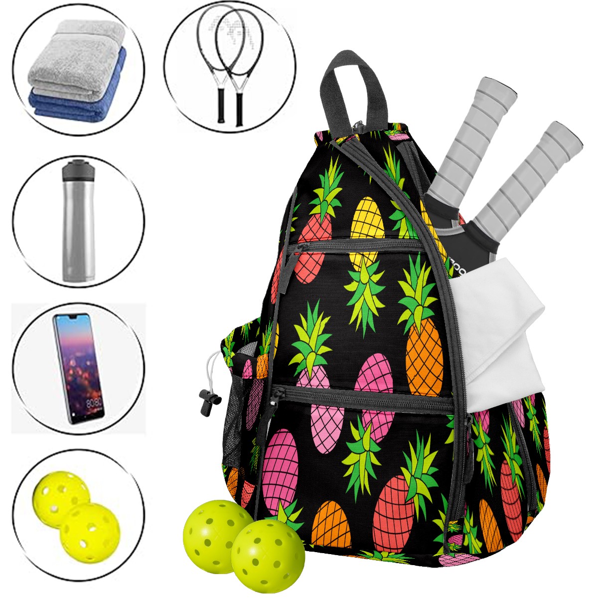 Pickleball Sling Bag for Women and Men - Backpack with Nylon Fabric - Woven Strap - Mesh Pocket - Fence Hook - Crossbody Pink Yellow Coral Pineapple Black