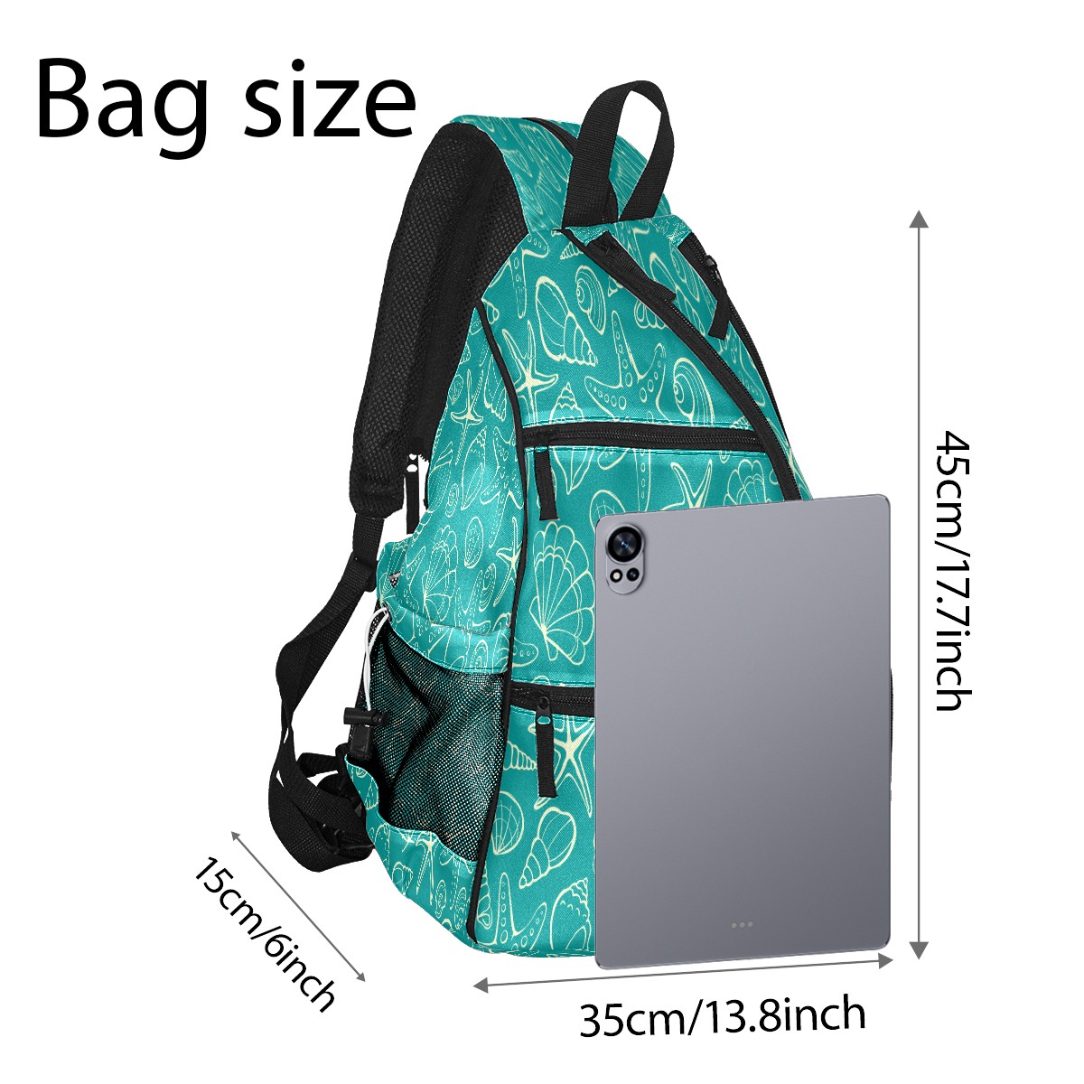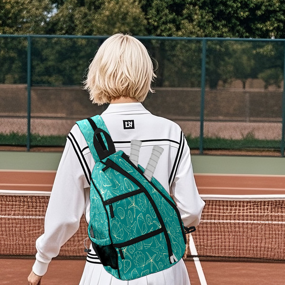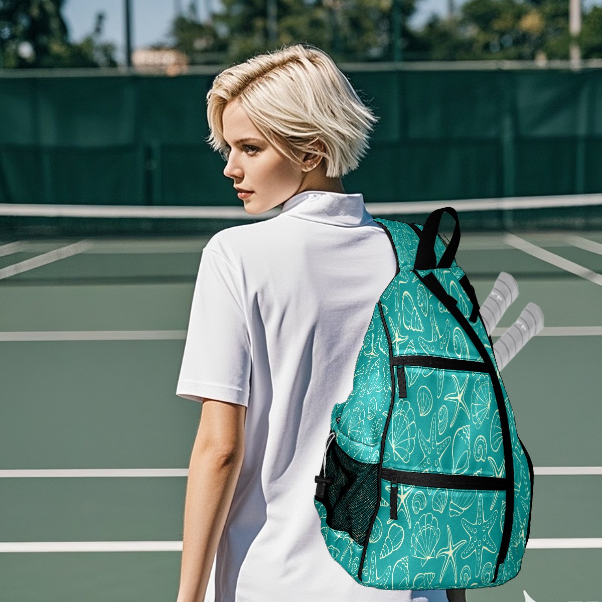 Pickleball Sling Bag for Women and Men - Backpack with Nylon Fabric - Woven Strap - Mesh Pocket - Fence Hook - Crossbody Starfish Conch Shell Pattern