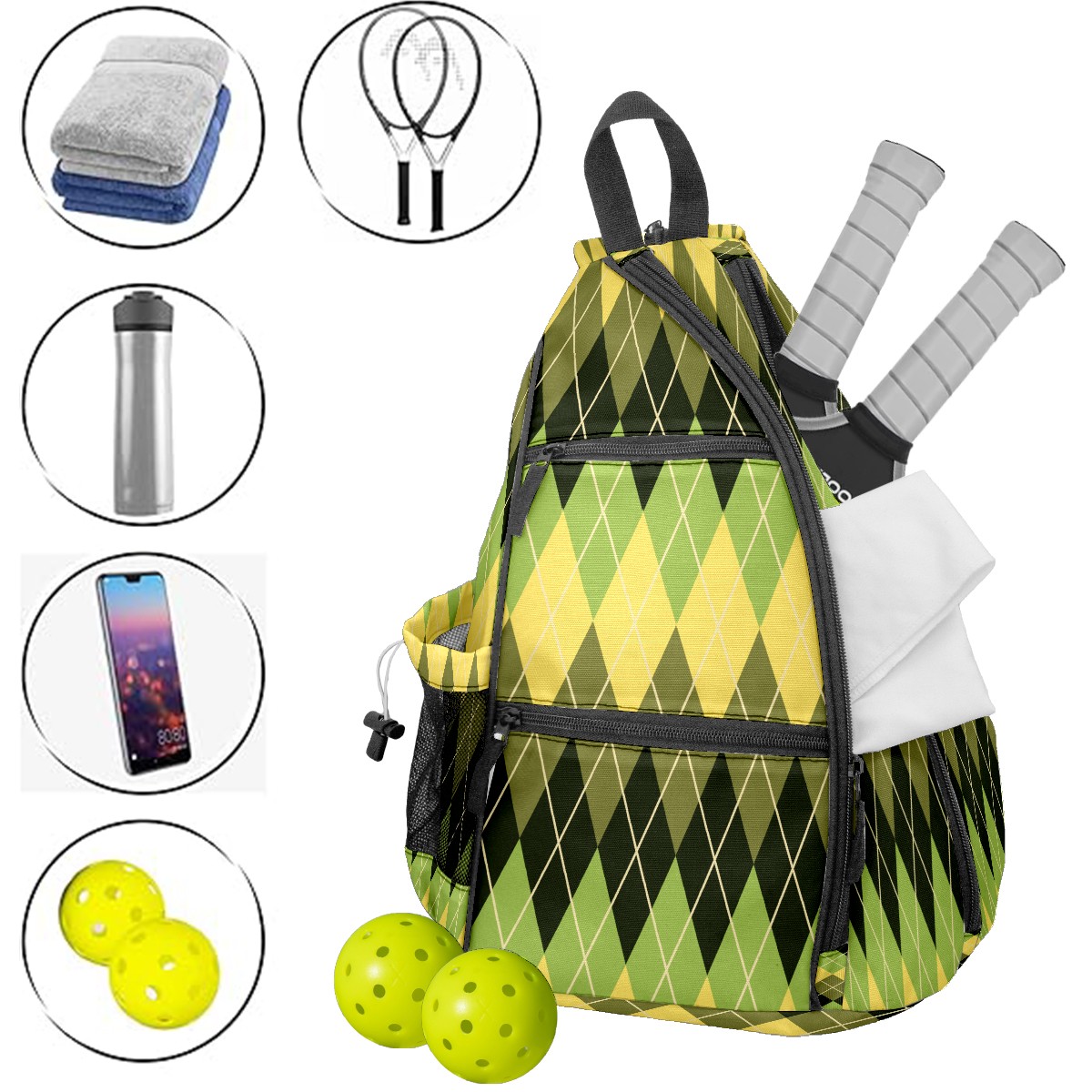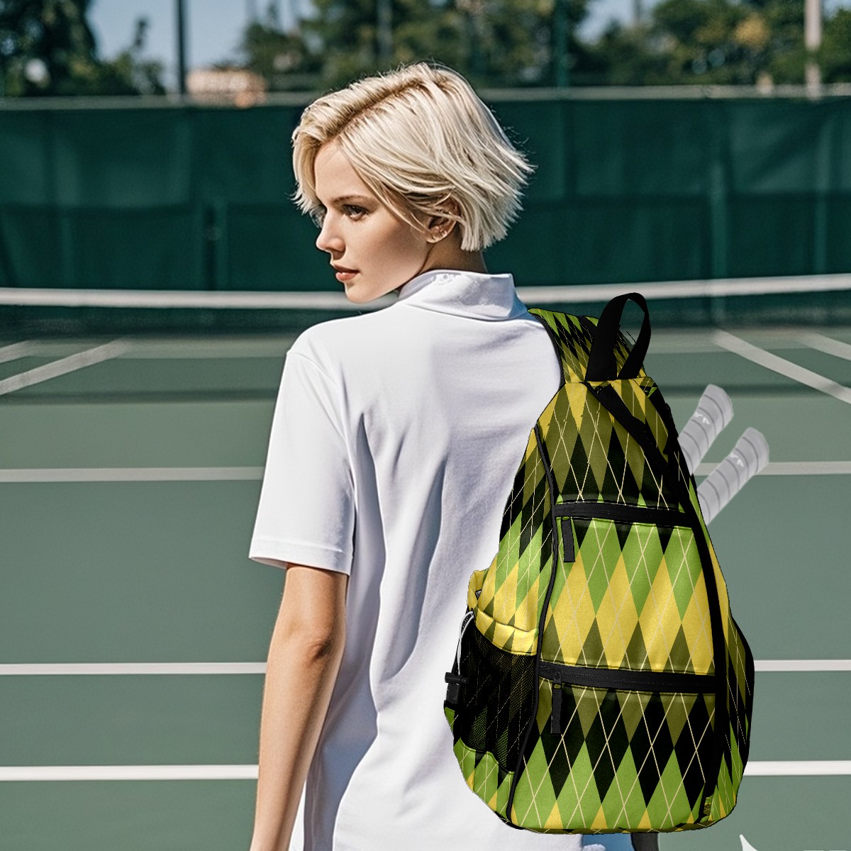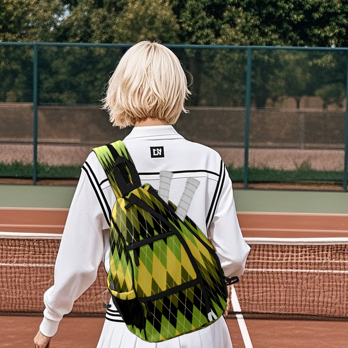 Pickleball Sling Bag for Women and Men - Backpack with Nylon Fabric - Woven Strap - Mesh Pocket - Fence Hook - Crossbody Geometric Argyle Pattern