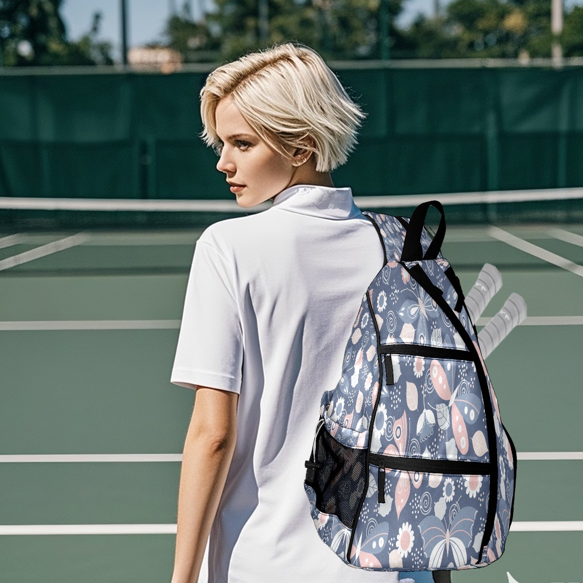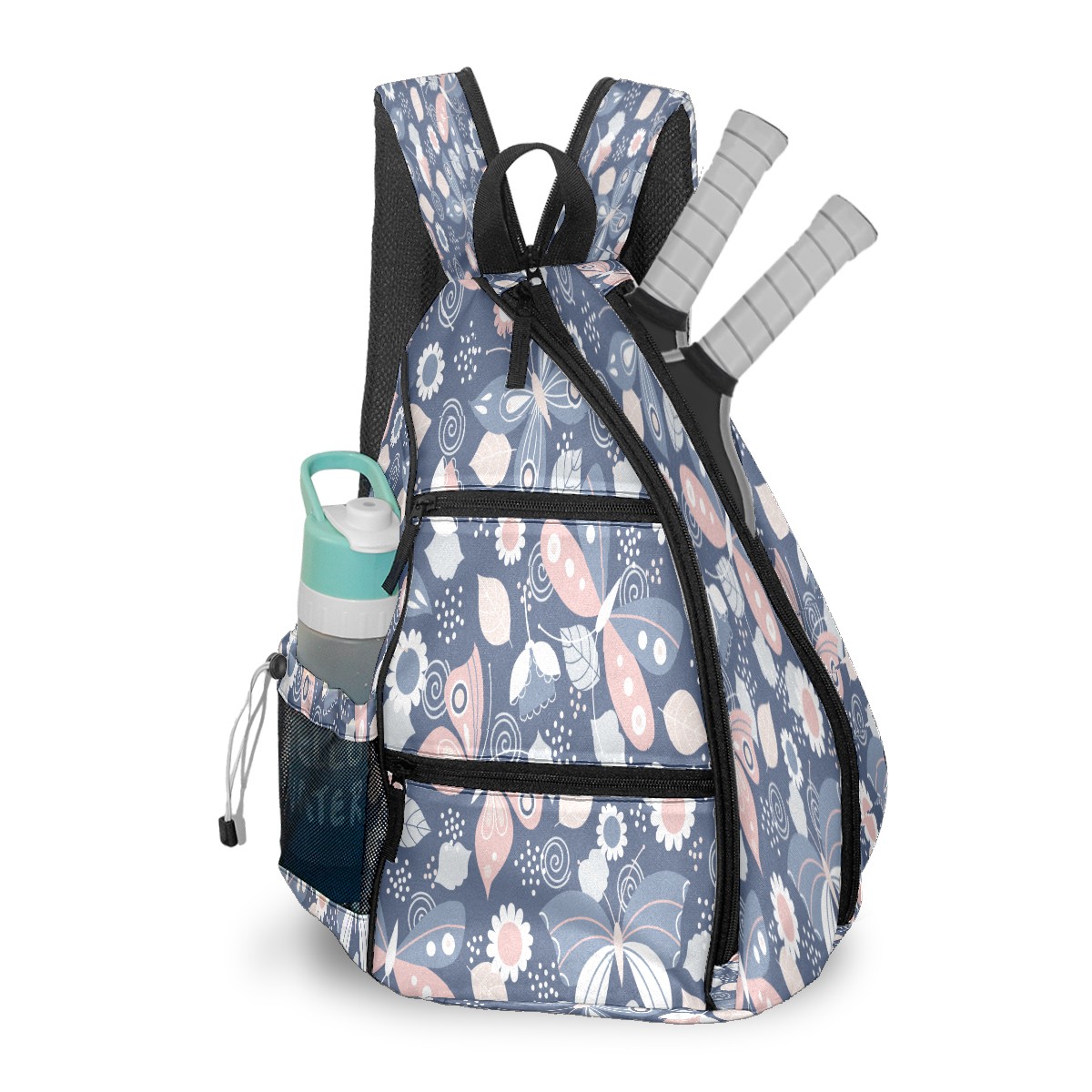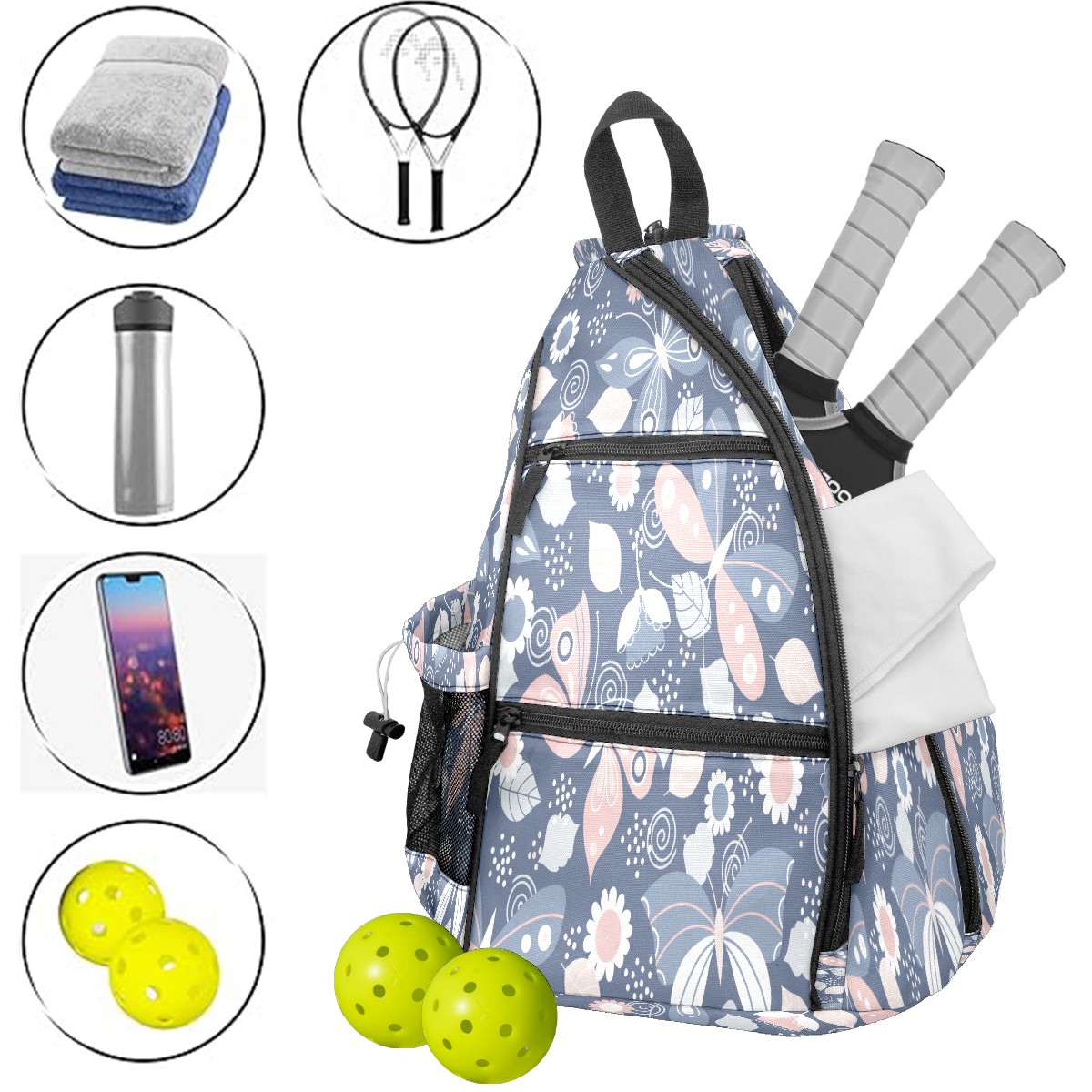 Pickleball Sling Bag for Women and Men - Backpack with Nylon Fabric - Woven Strap - Mesh Pocket - Fence Hook - Crossbody Butterfly Printing