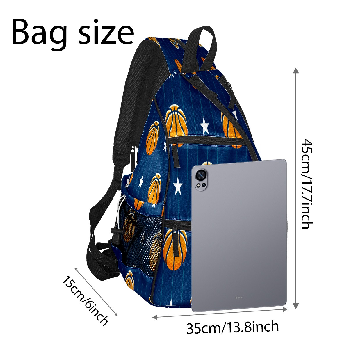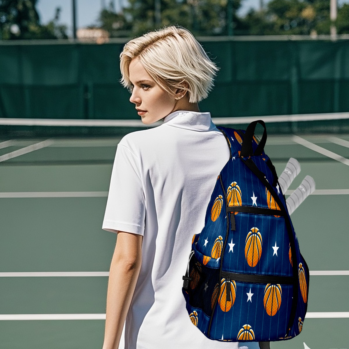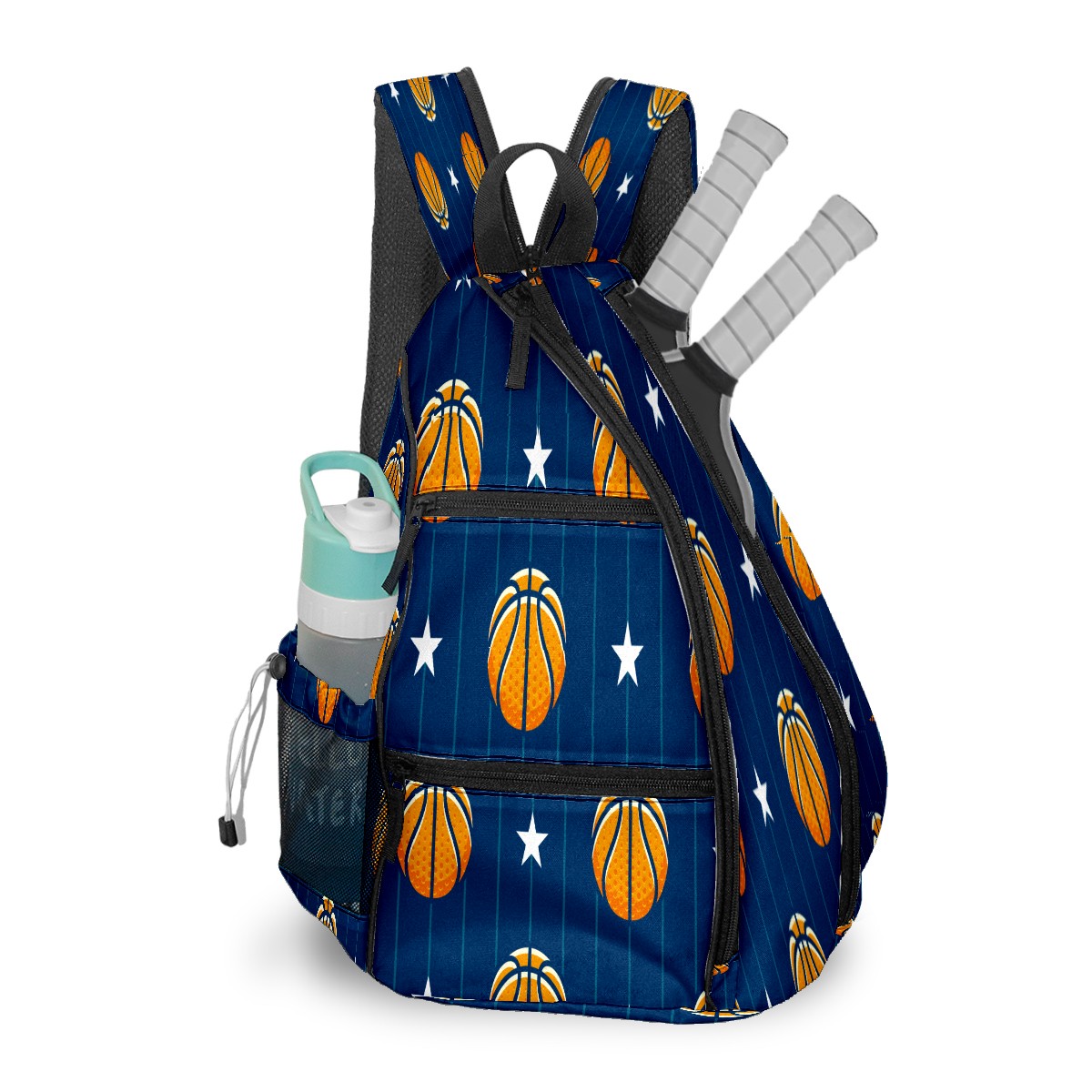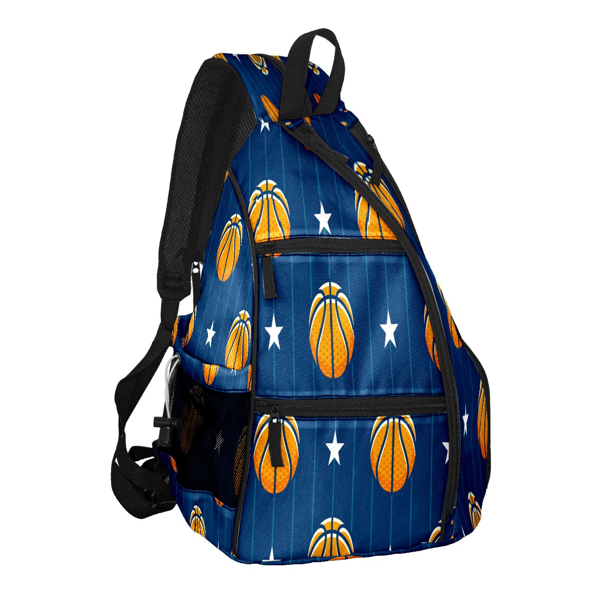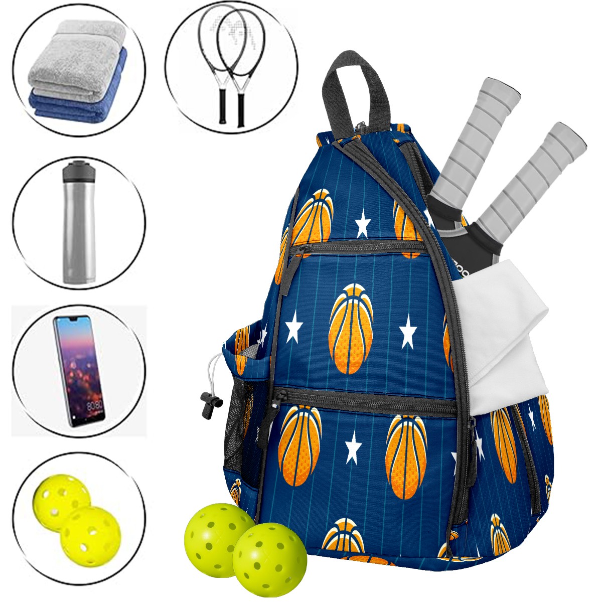 Pickleball Sling Bag for Women and Men - Backpack with Nylon Fabric - Woven Strap - Mesh Pocket - Fence Hook - Crossbody Basketball Stars Pattern Blue Stripe