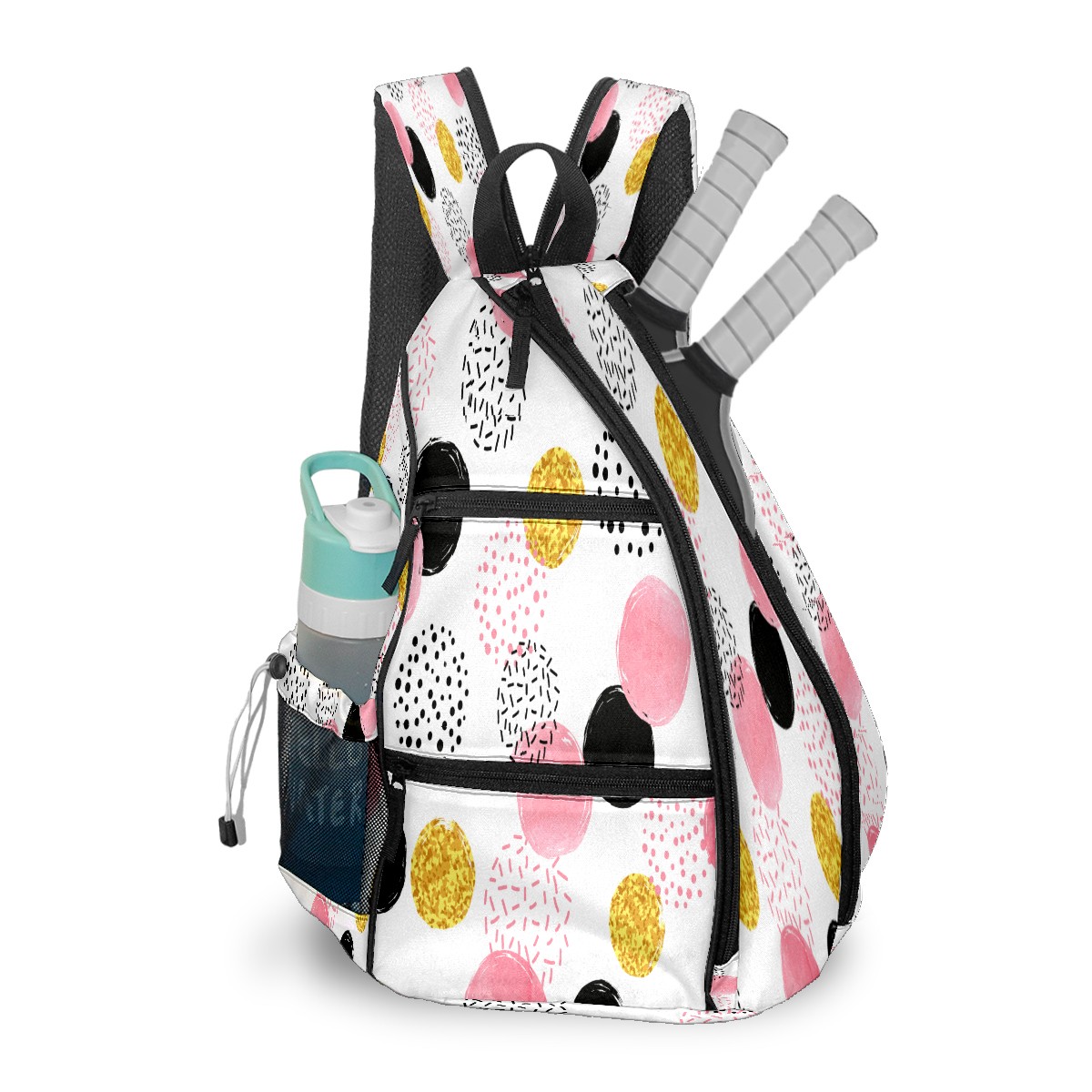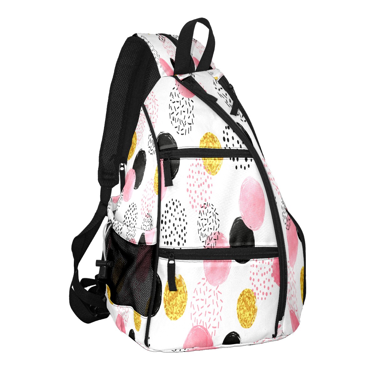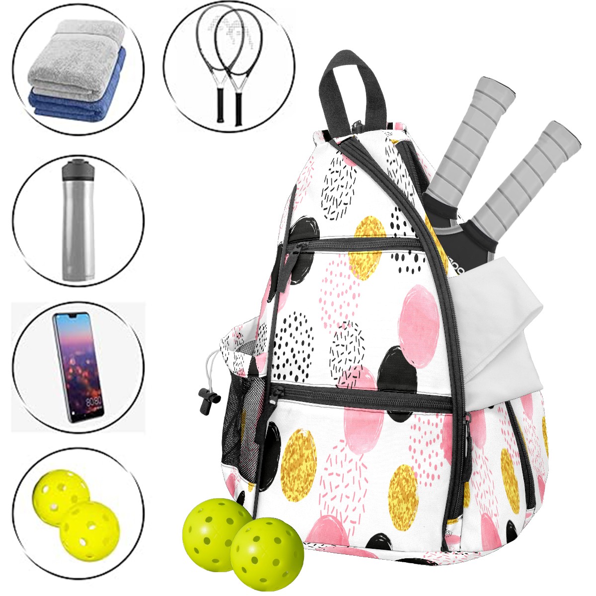 Pickleball Sling Bag for Women and Men - Backpack with Nylon Fabric - Woven Strap - Mesh Pocket - Fence Hook - Crossbody Pink Black Golden Dotted Pattern