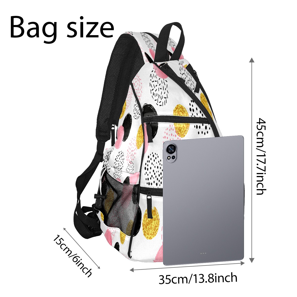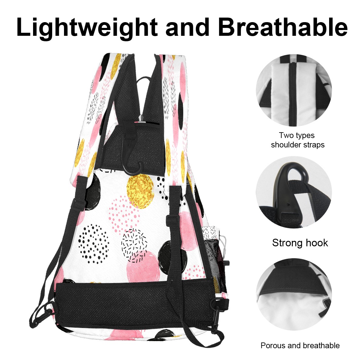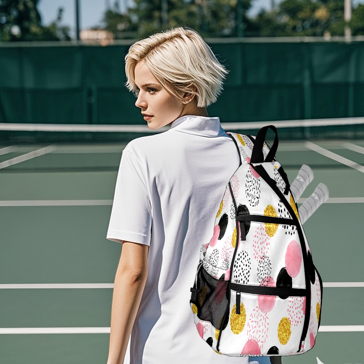 Pickleball Sling Bag for Women and Men - Backpack with Nylon Fabric - Woven Strap - Mesh Pocket - Fence Hook - Crossbody Pink Black Golden Dotted Pattern