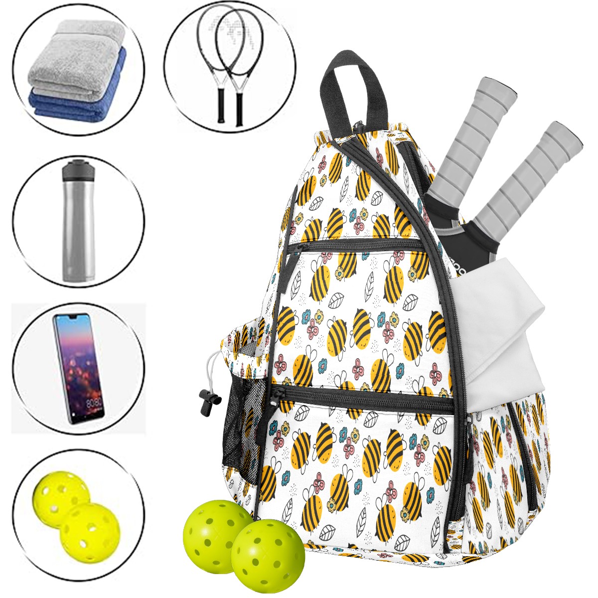 Pickleball Sling Bag for Women and Men - Backpack with Nylon Fabric - Woven Strap - Mesh Pocket - Fence Hook - Crossbody Cute Little Bee Pattern-01