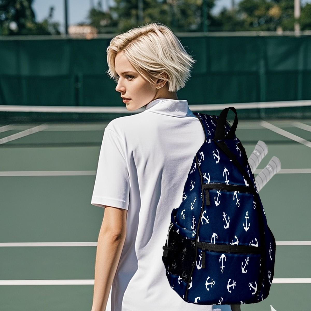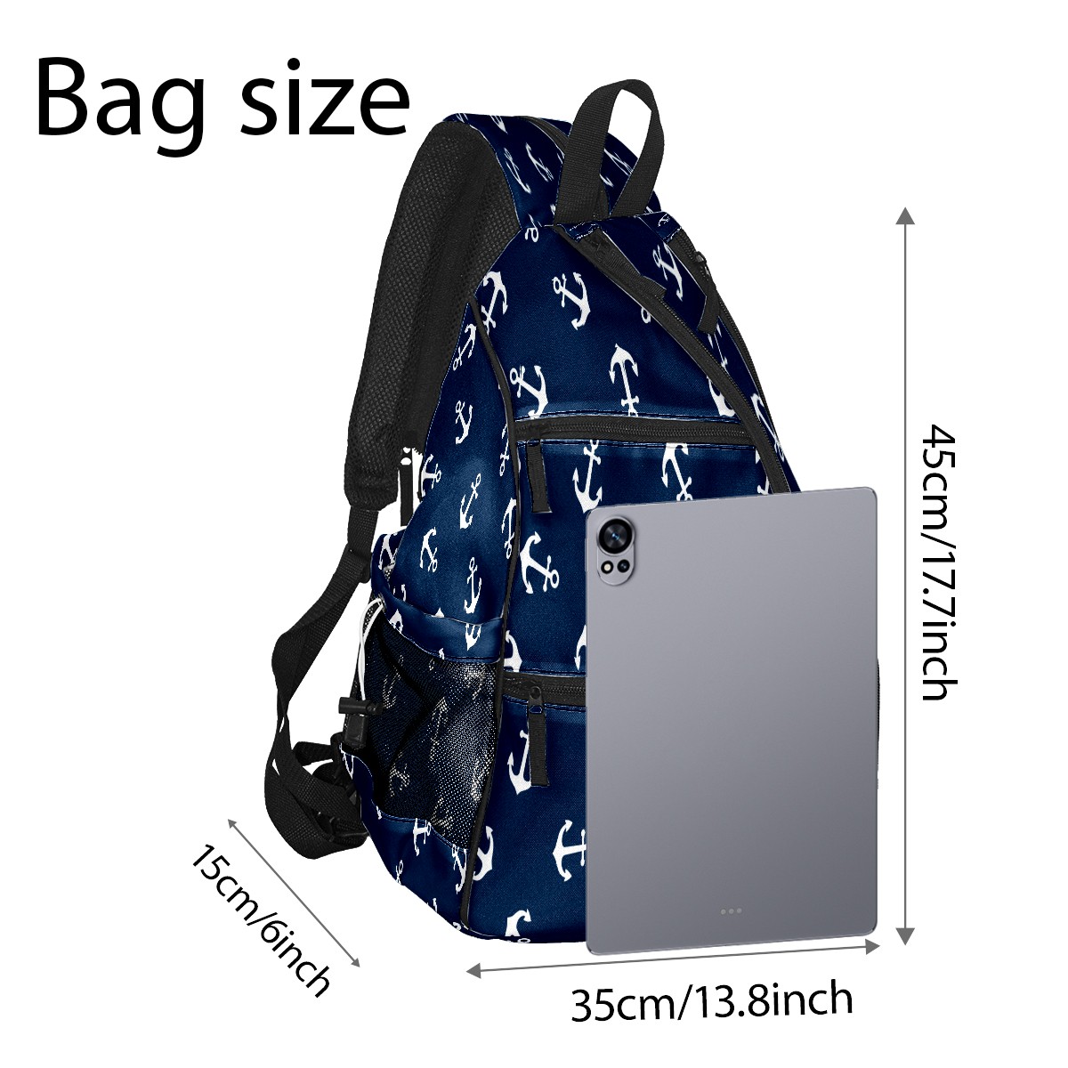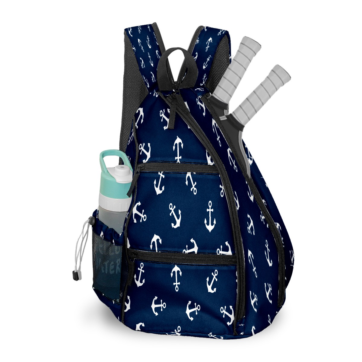 Pickleball Sling Bag for Women and Men - Backpack with Nylon Fabric - Woven Strap - Mesh Pocket - Fence Hook - Crossbody White Ship Anchors Navy