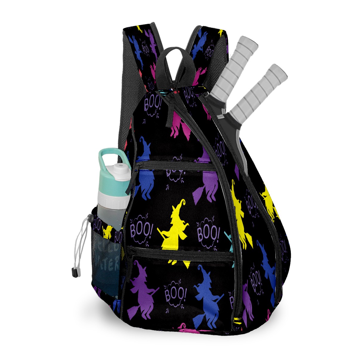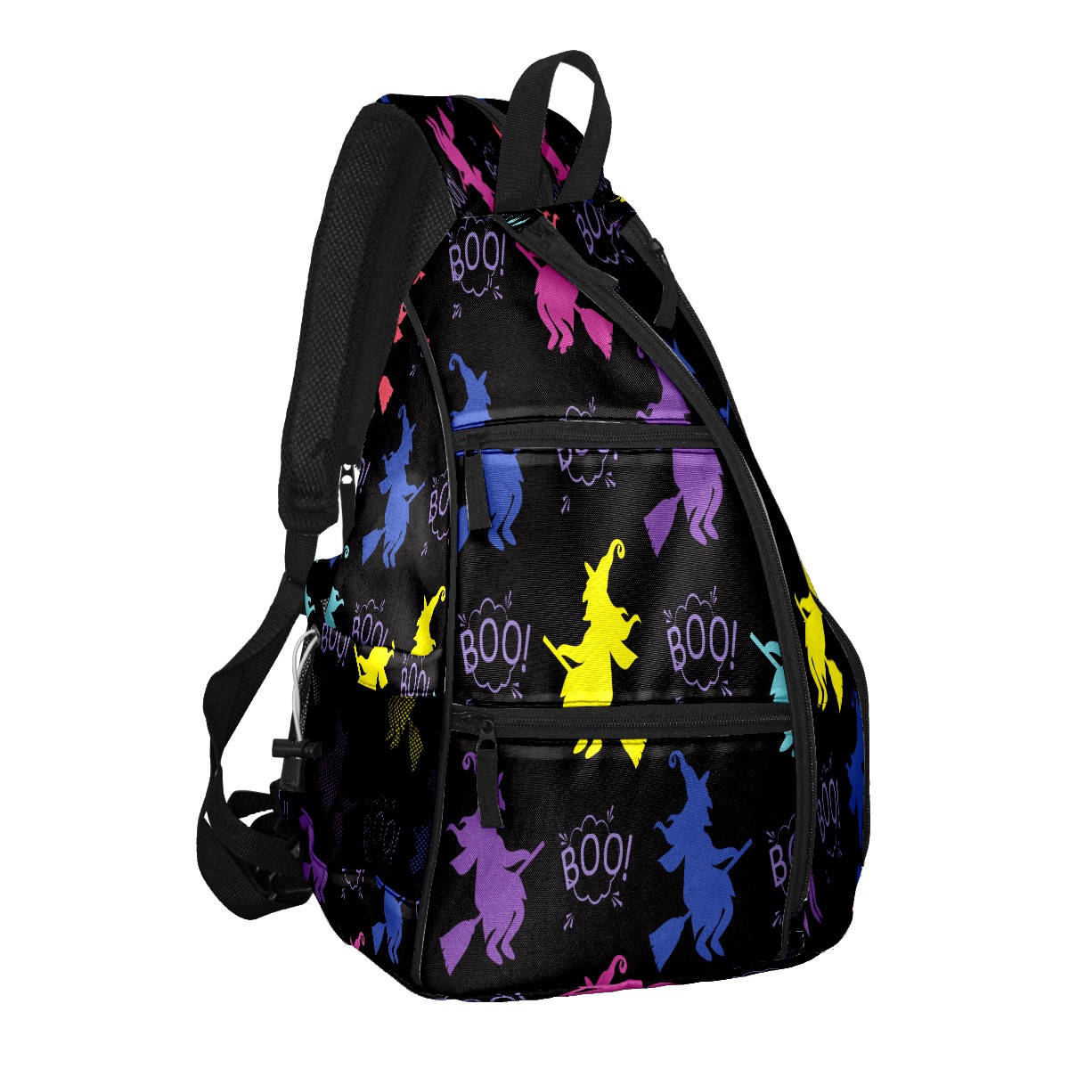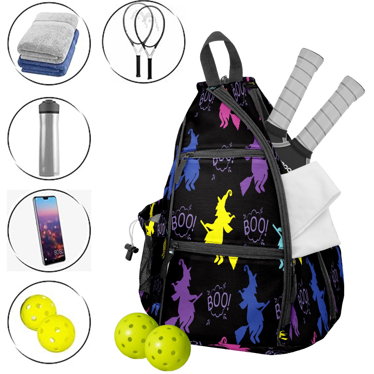 Pickleball Sling Bag for Women and Men - Backpack with Nylon Fabric - Woven Strap - Mesh Pocket - Fence Hook - Crossbody Halloween Colorful Witch Broom Boo Pattern