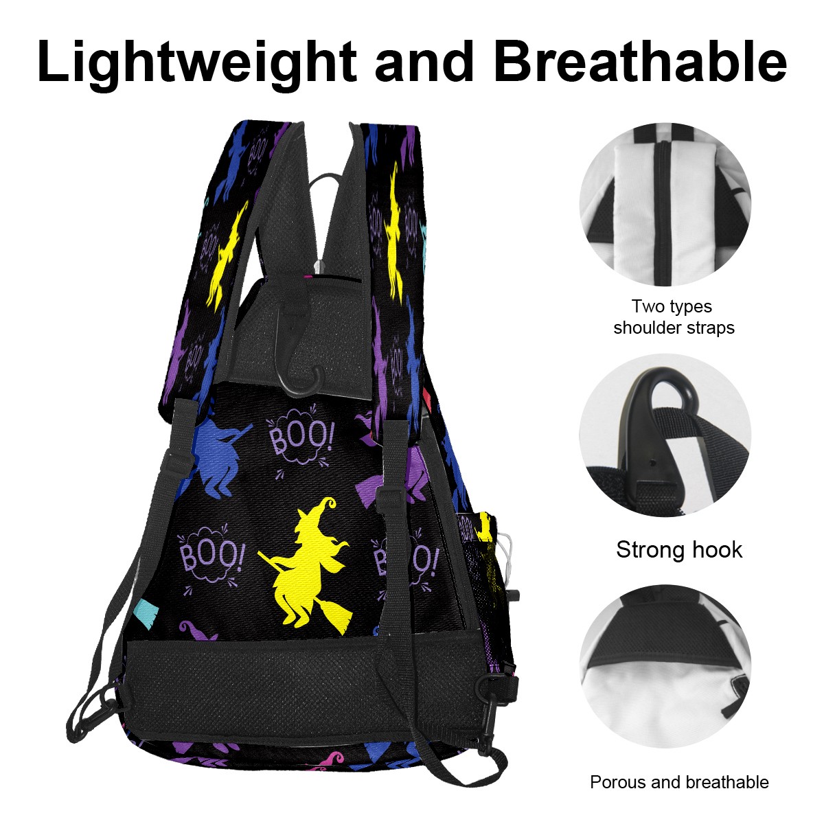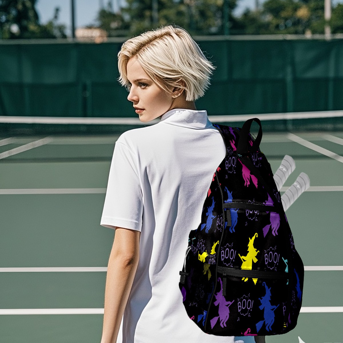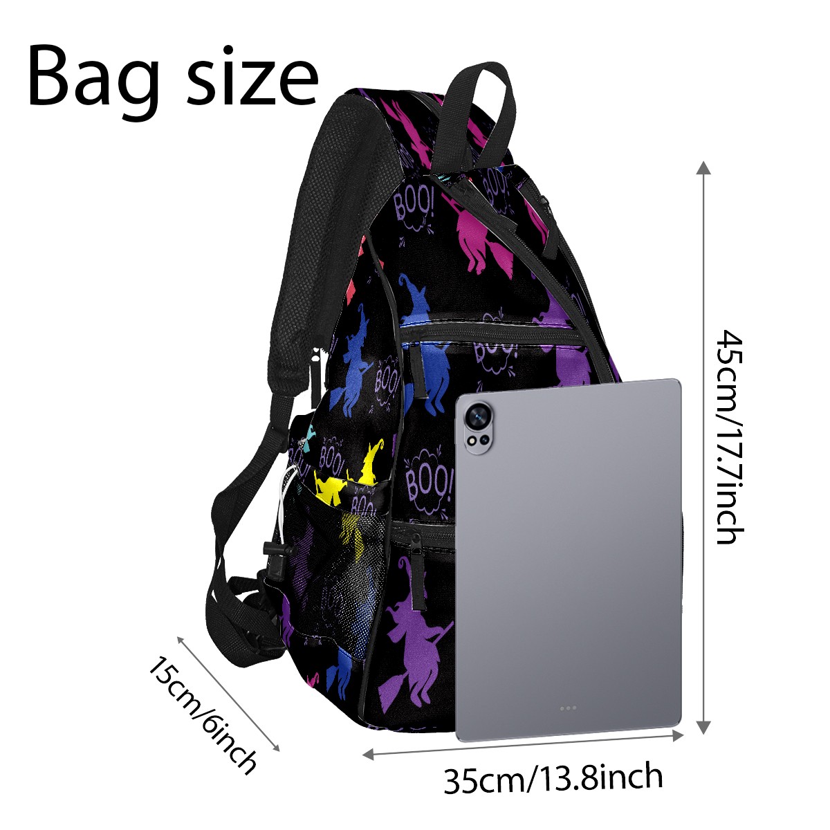 Pickleball Sling Bag for Women and Men - Backpack with Nylon Fabric - Woven Strap - Mesh Pocket - Fence Hook - Crossbody Halloween Colorful Witch Broom Boo Pattern
