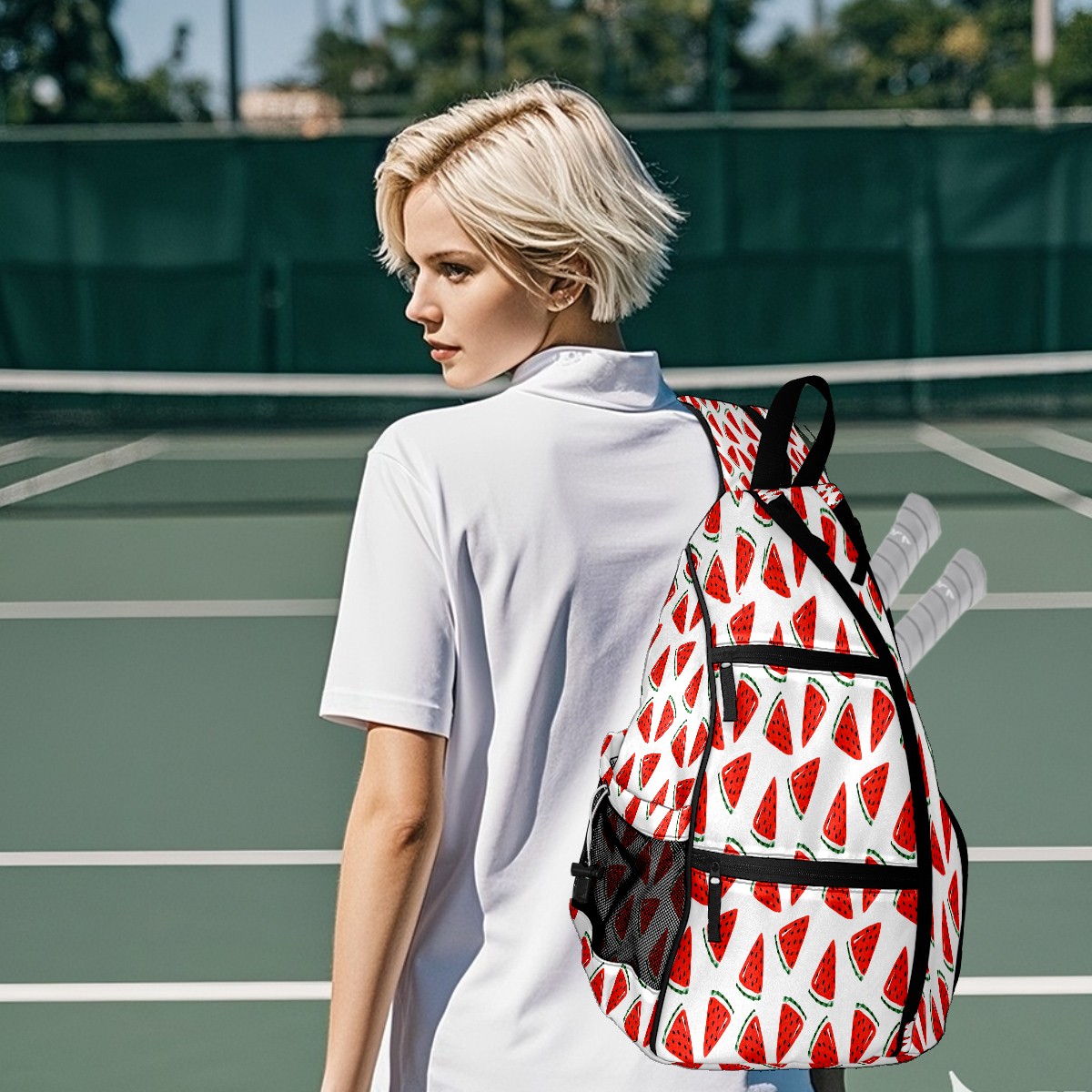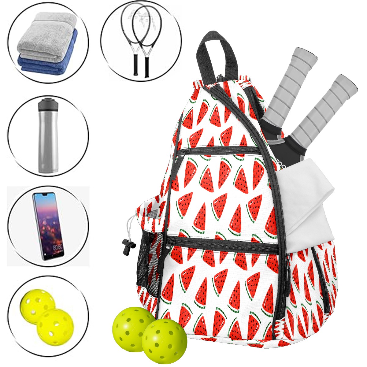 Pickleball Sling Bag for Women and Men - Backpack with Nylon Fabric - Woven Strap - Mesh Pocket - Fence Hook - Crossbody Summer Fruit Red Watermelon Pattern