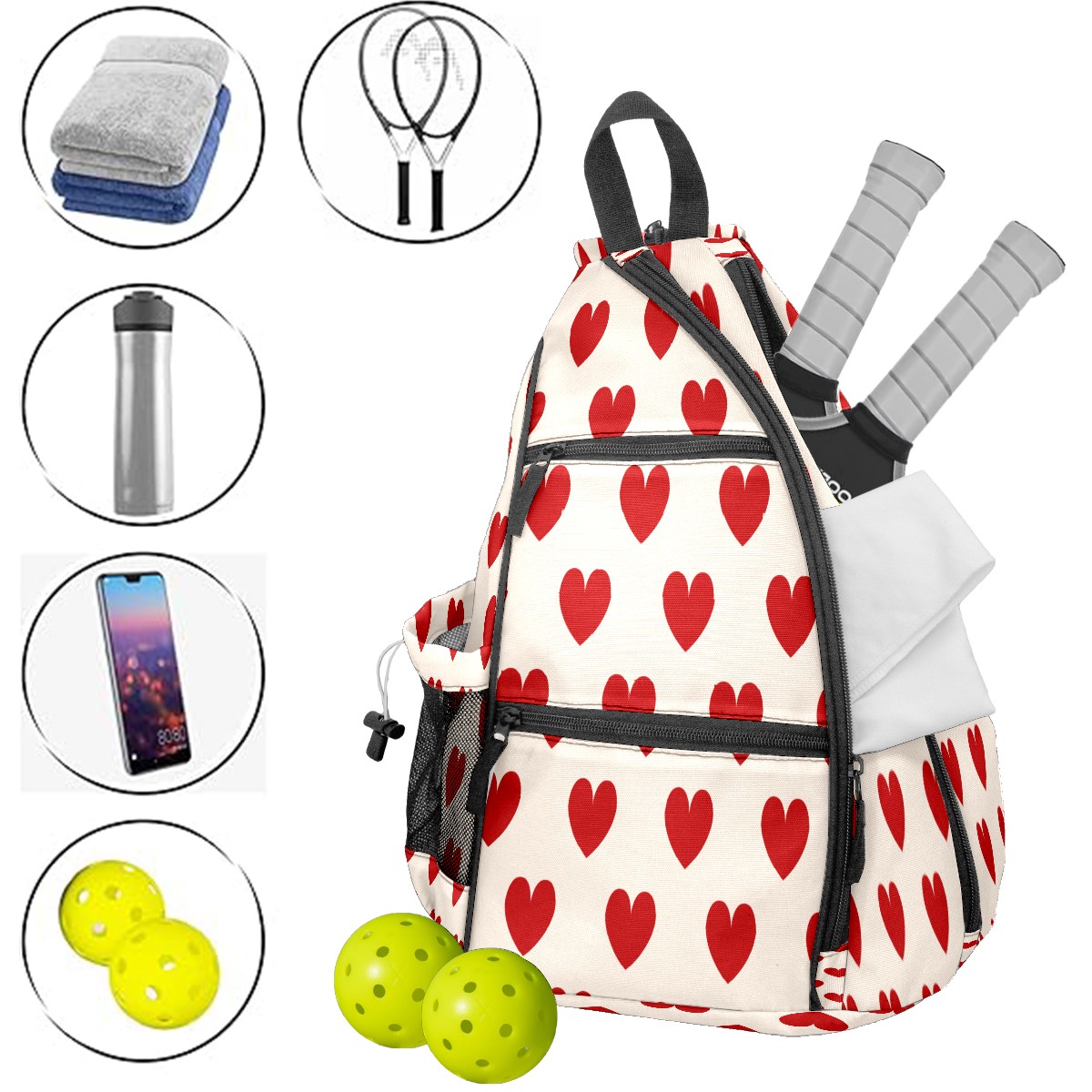 Pickleball Sling Bag for Women and Men - Backpack with Nylon Fabric - Woven Strap - Mesh Pocket - Fence Hook - Crossbody Retro Red White Heart Love Pattern