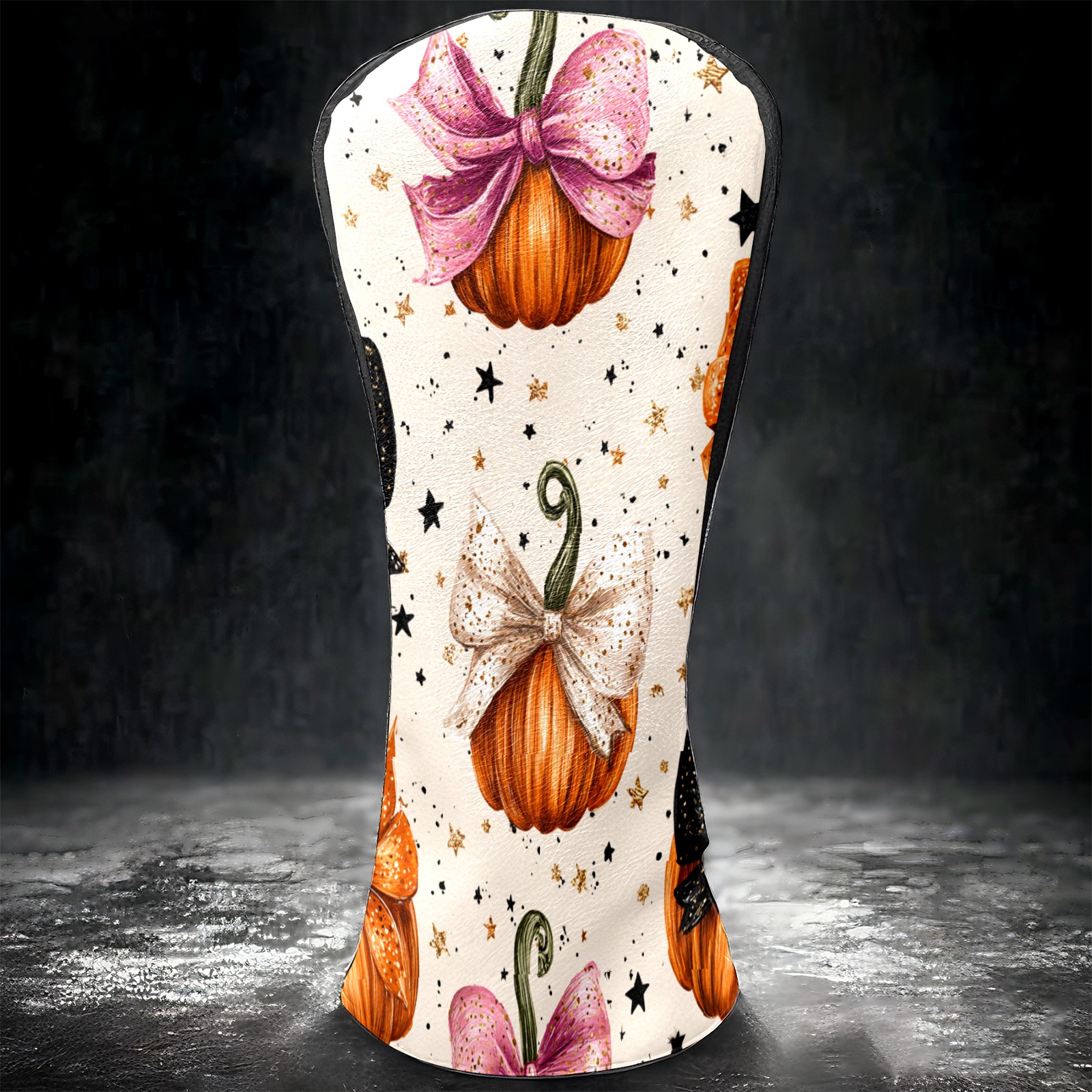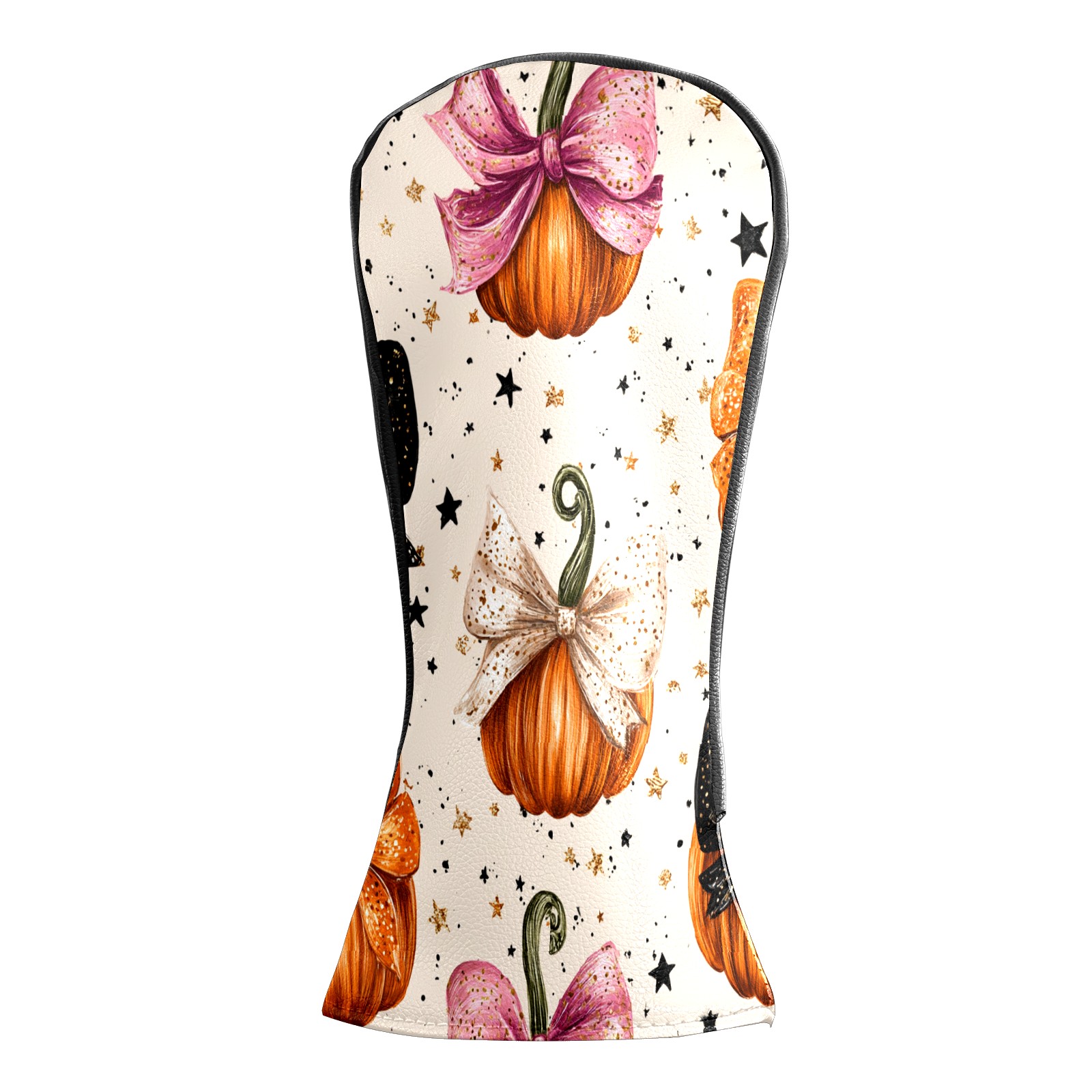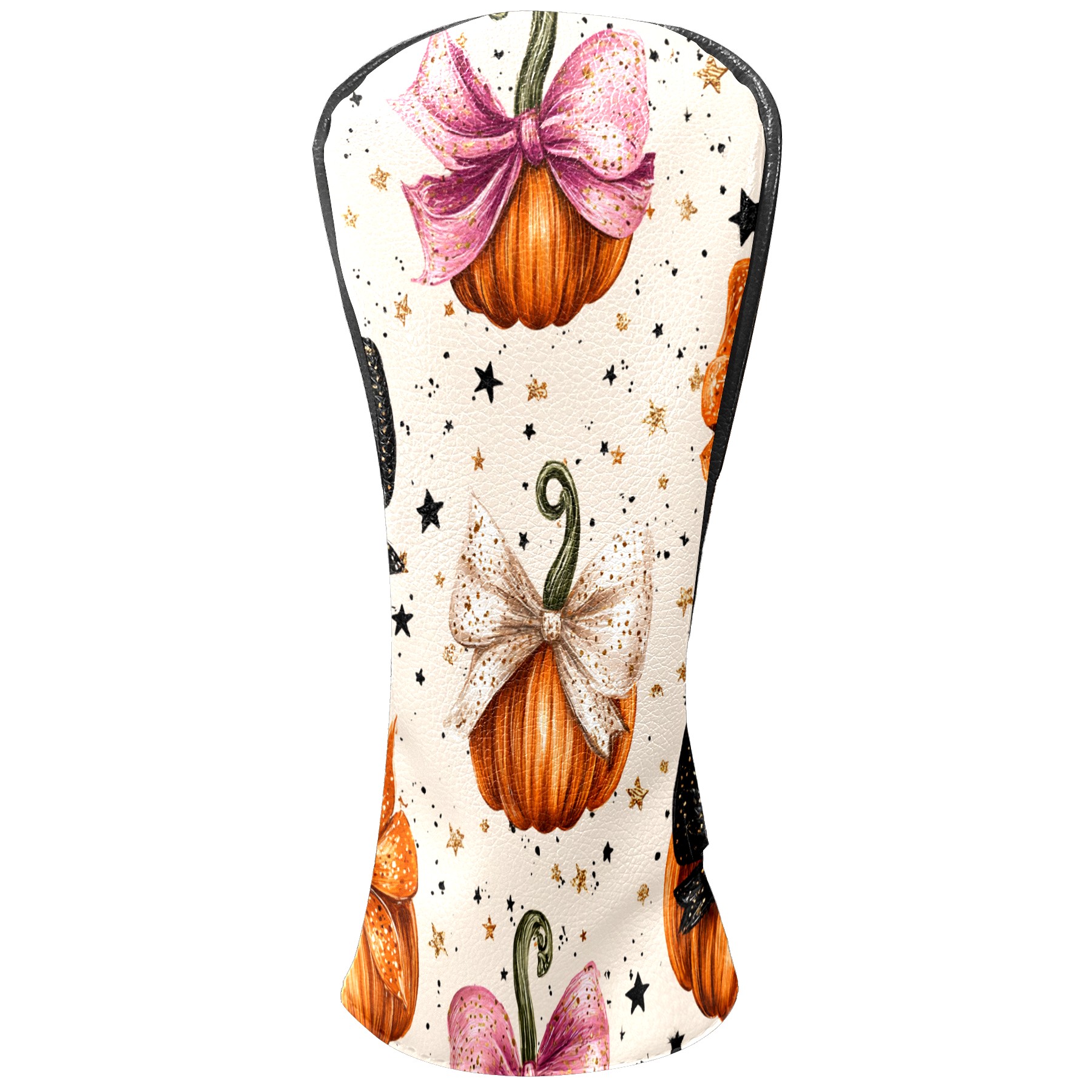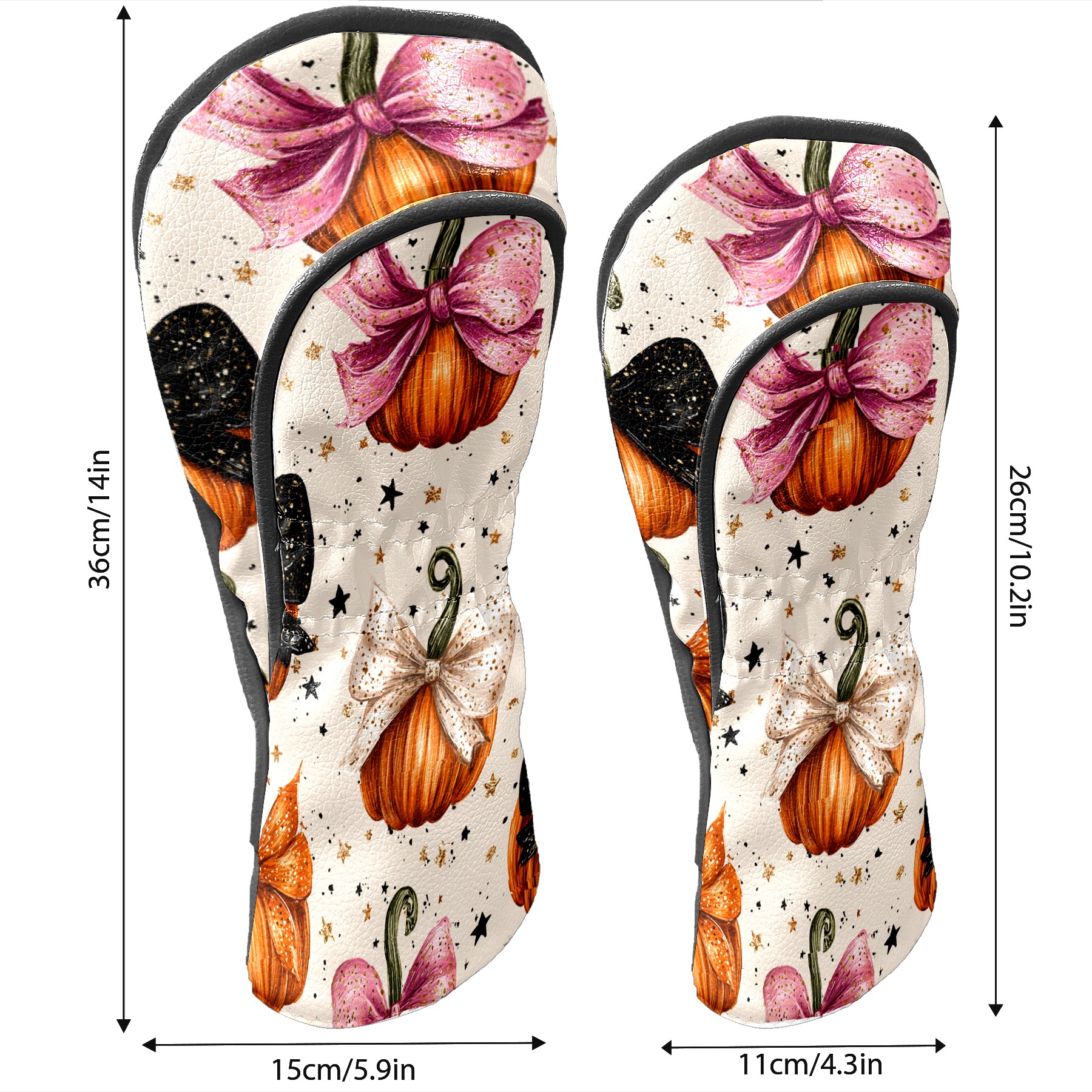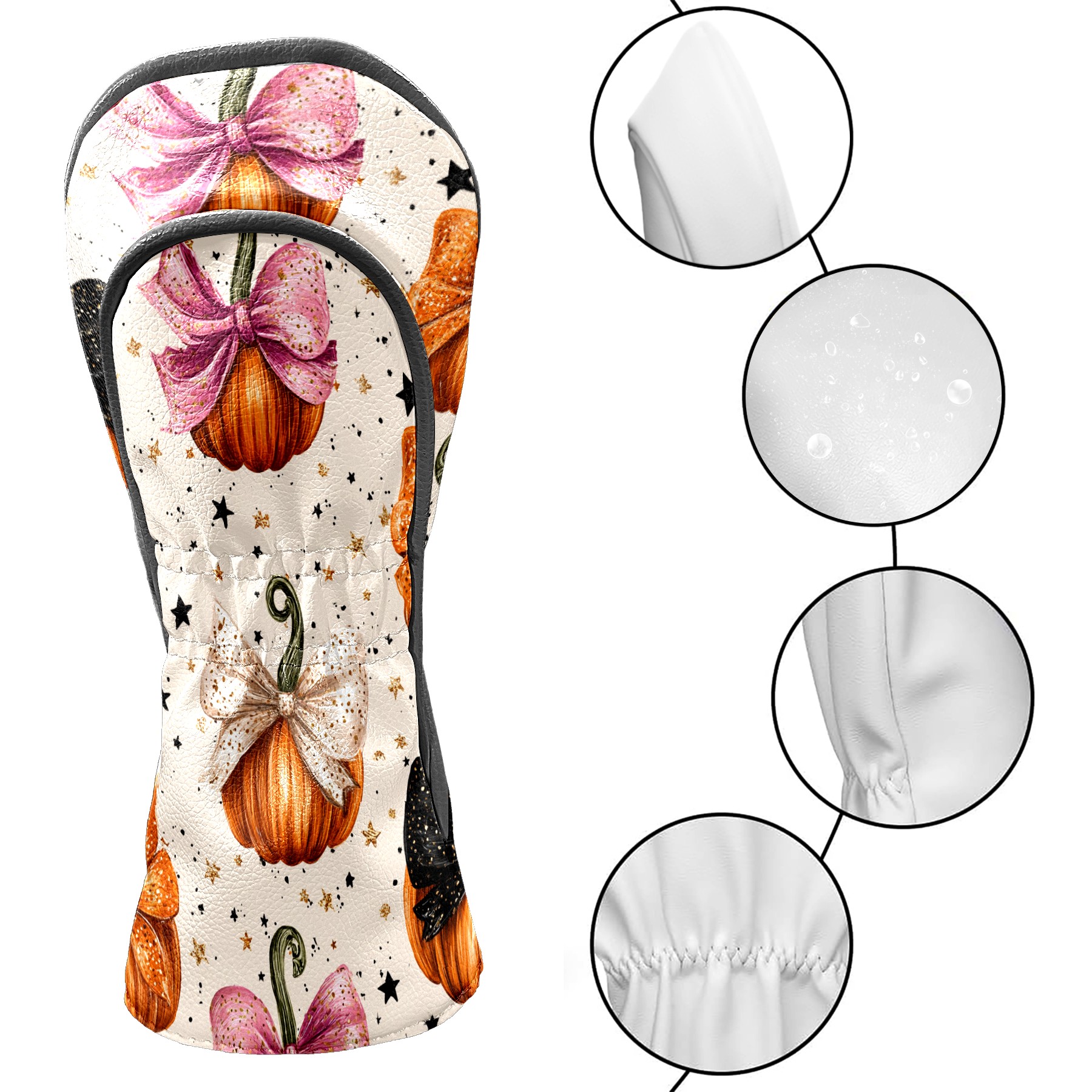 Golf Club Covers, Orange PumpkinBow Premium PU Leather Driver Hybrid Putter Head Covers with Velvet Lining, Waterproof Golf Gifts for Men Women