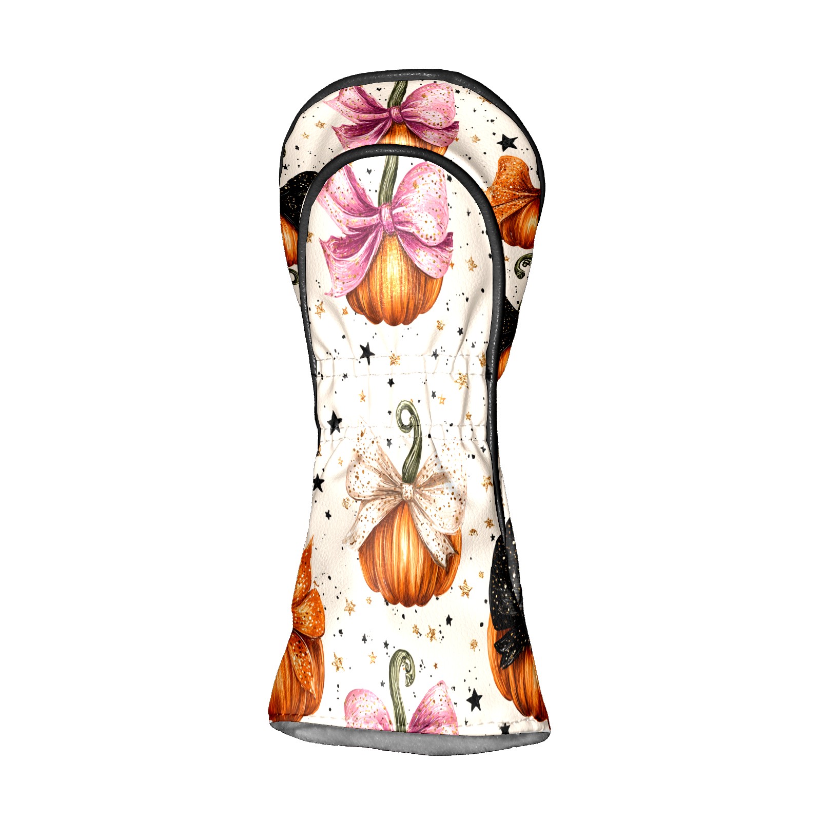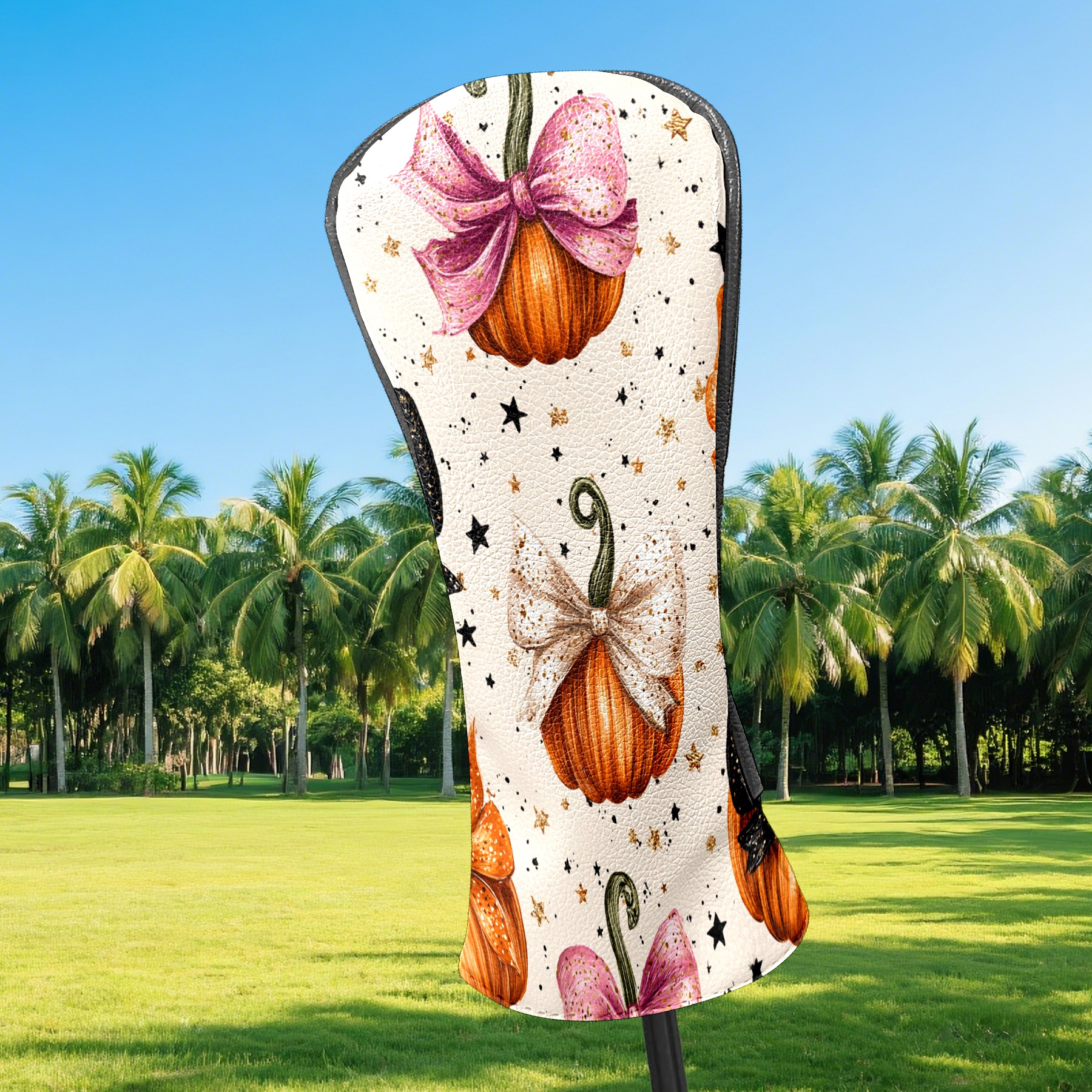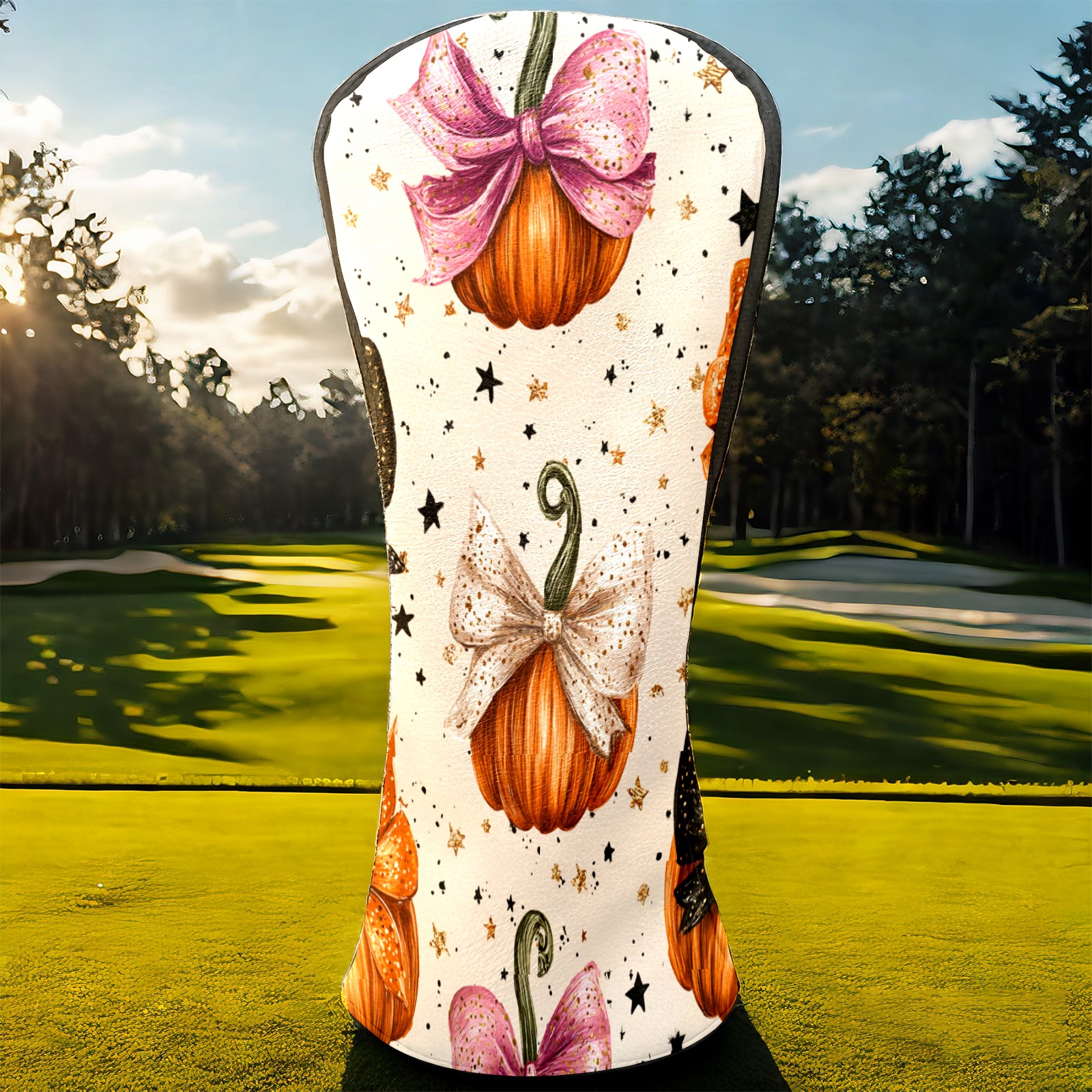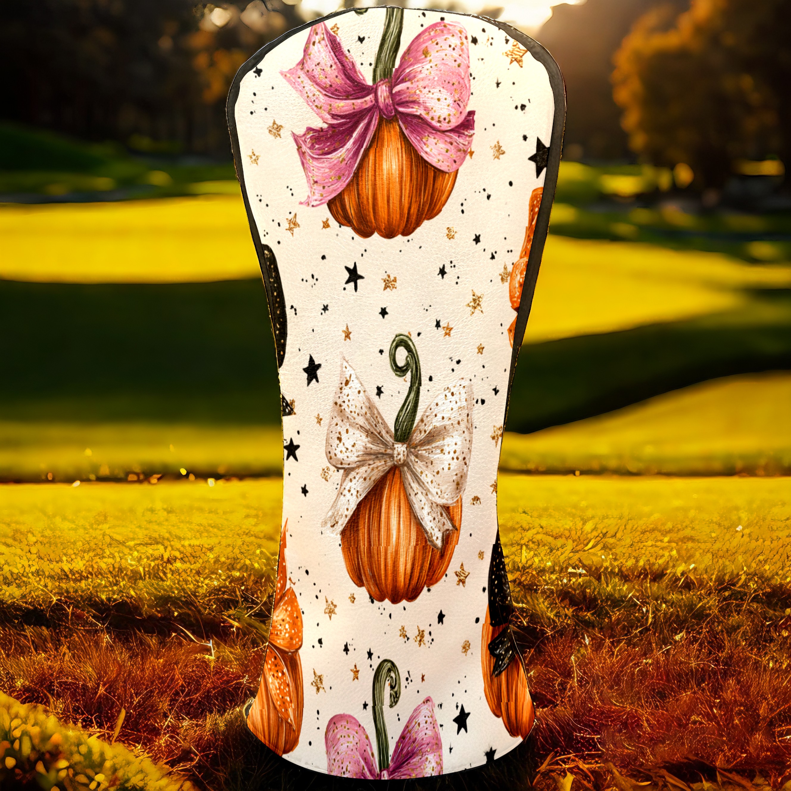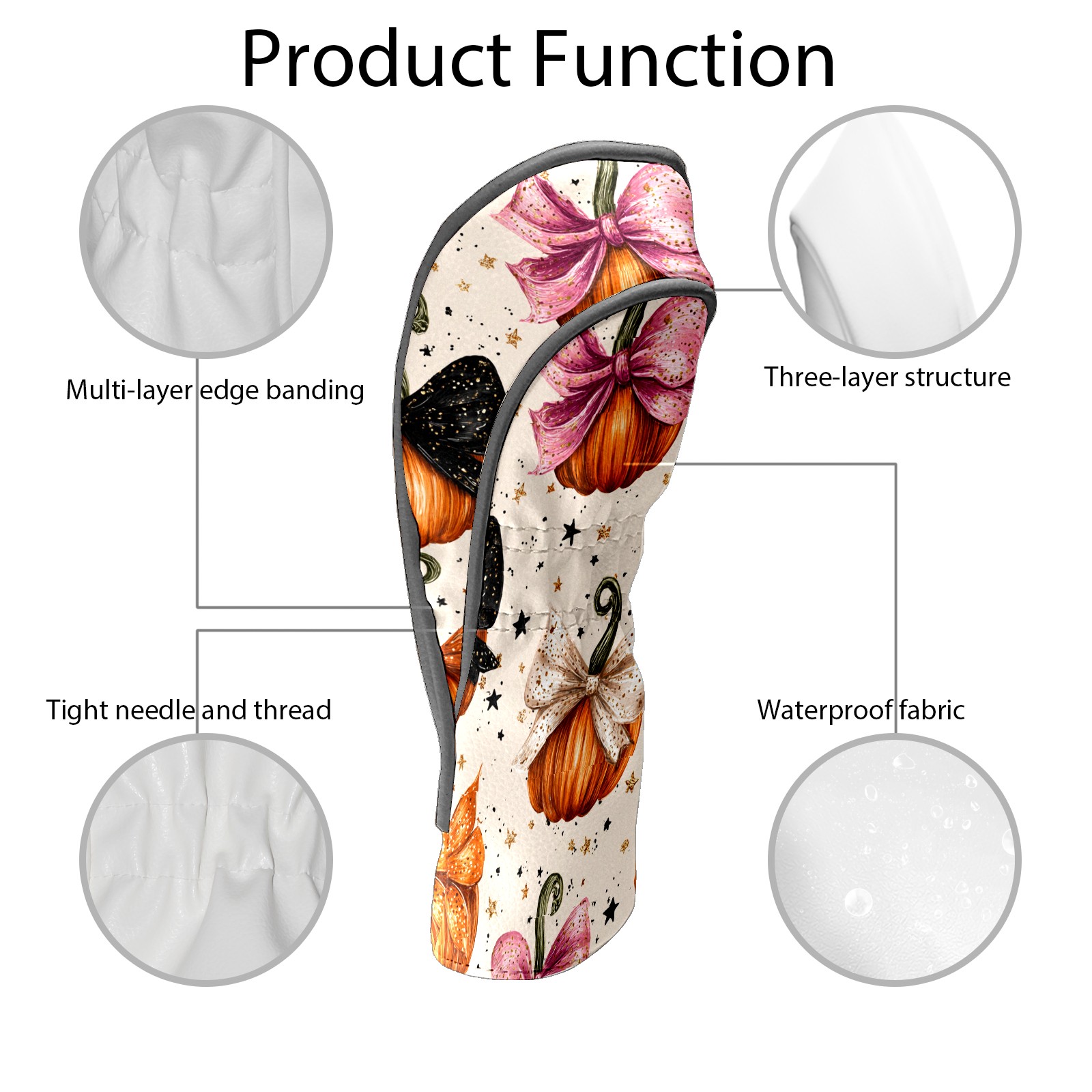 Golf Club Covers, Orange PumpkinBow Premium PU Leather Driver Hybrid Putter Head Covers with Velvet Lining, Waterproof Golf Gifts for Men Women