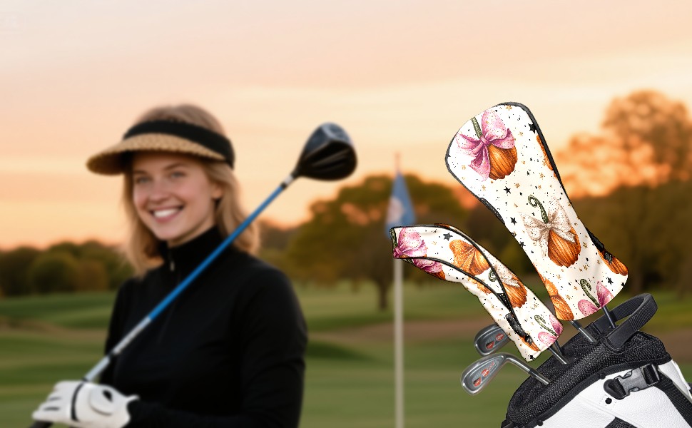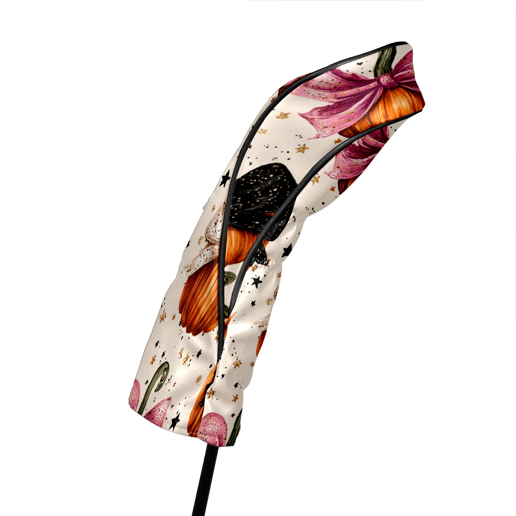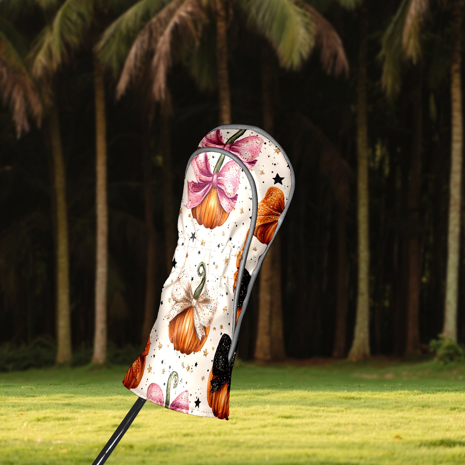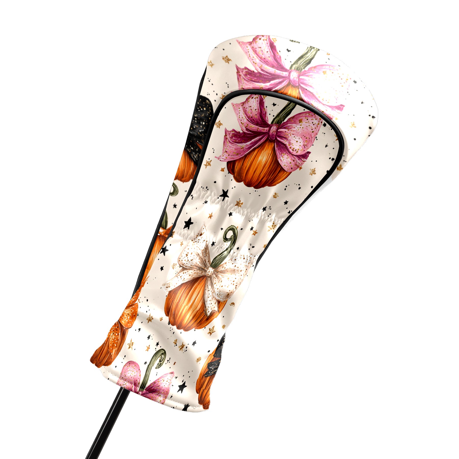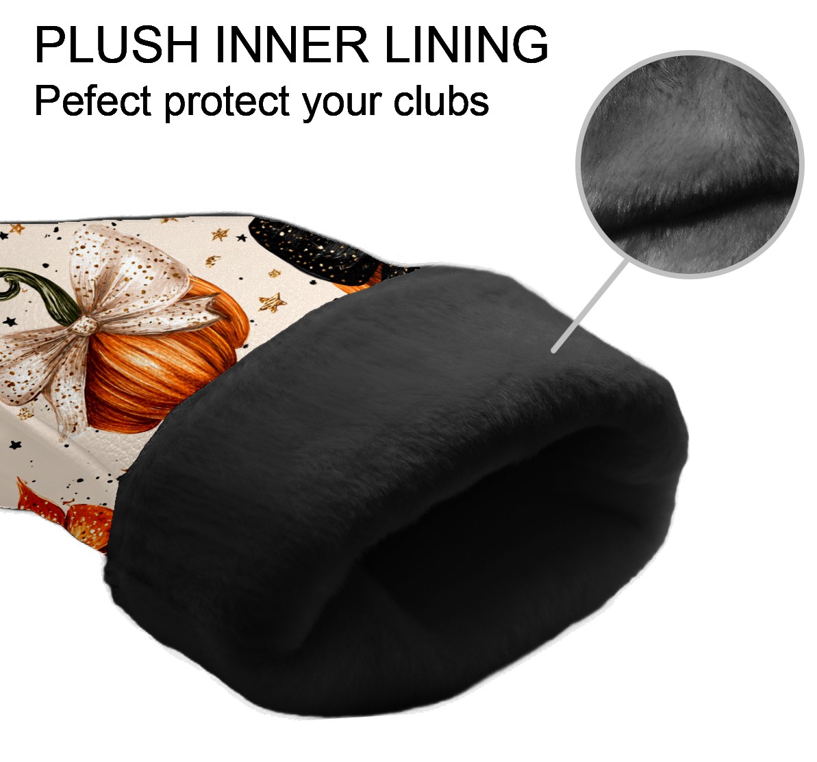 Golf Club Covers, Orange PumpkinBow Premium PU Leather Driver Hybrid Putter Head Covers with Velvet Lining, Waterproof Golf Gifts for Men Women