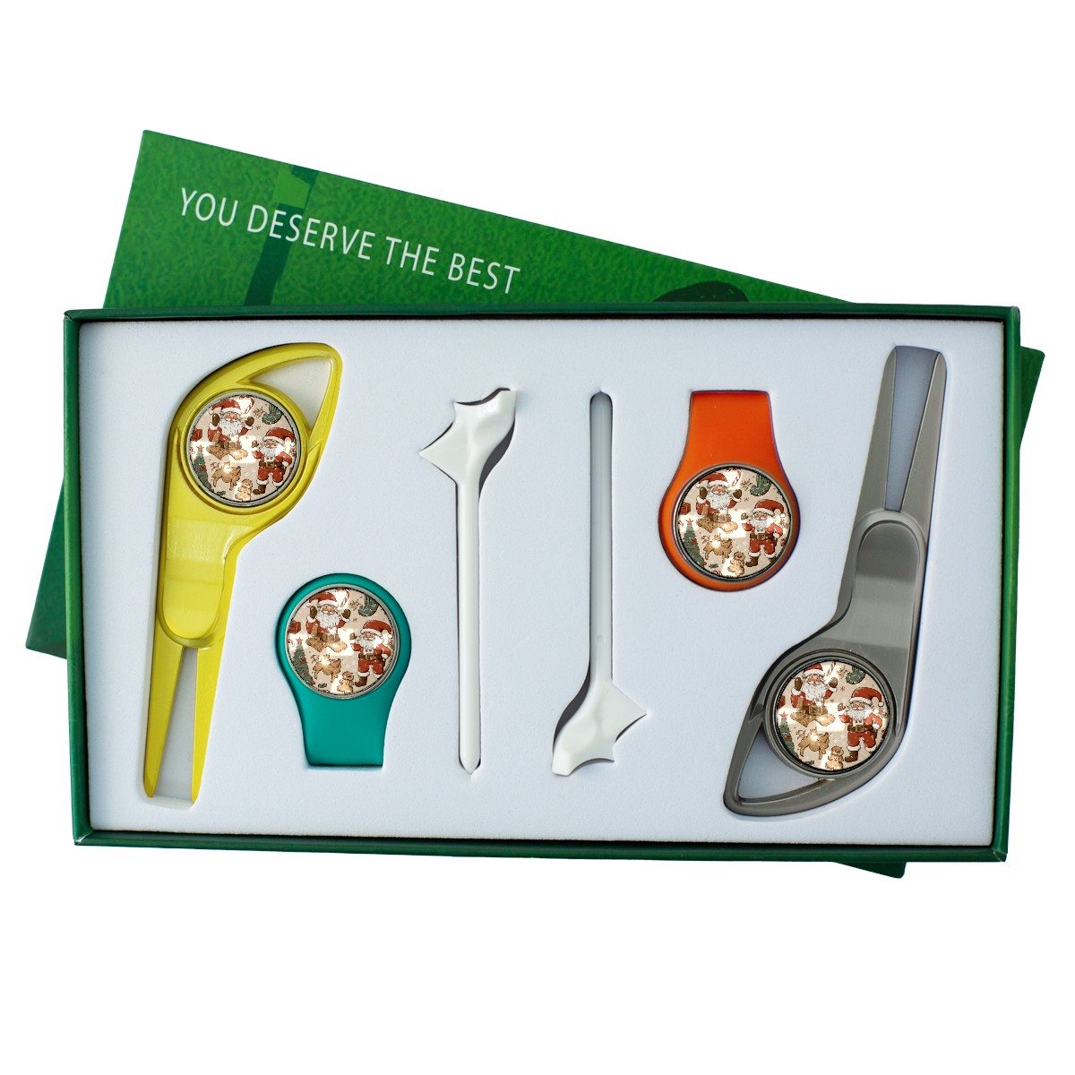 Golf Gift Box for Men Portable Golf Accessories Set with Golf Ball Tees Green Fork Hat Clips Customizable Magnetic Labels Santa And Gifts Pattern