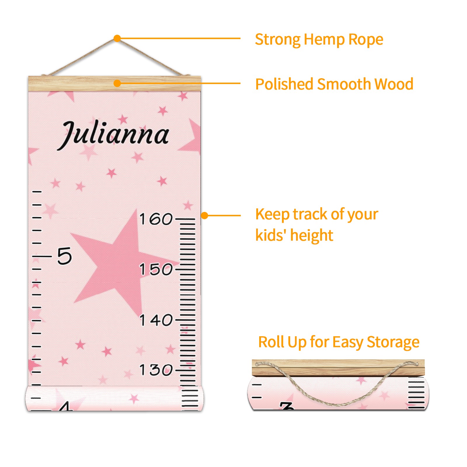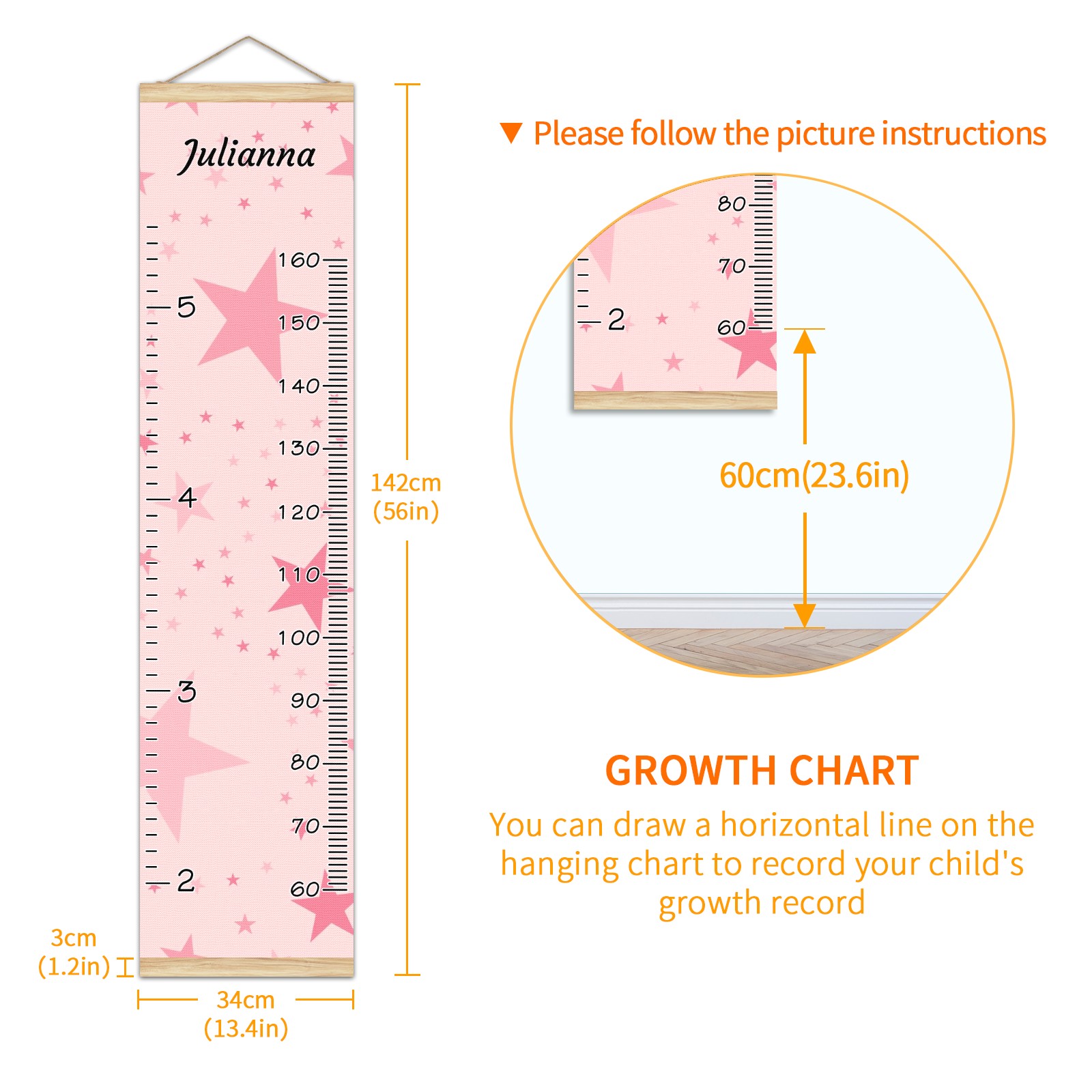 <p><b>Features:</b></p> <p>Rope for Hanging</p> <p>Material: Linen + Wood</p> <p>Dimensions: 13.4x56 inches</p> <p>Package Included: 1 * Baby Growth Chart</p> <p><b>Baby height growth chart can be used anywhere</b></p> <p>Ideal for kids nursery decoration, kids bedroom, interior walls or windows, playroom, living room, homedecoration.Add name and make the growth chart special!</p> <p><b>Easy to fold and carry</b></p> <p>With rope at the top of the growth chart, it is easy to install and remove.You can fold it and unfold any time any where.</p> <p><b>Perfect Gift Idea for Kids</b></p> <p>Environmental and non-toxic for kids use, it must be a perfect gift for baby, kids, girls, and boys.This is a best choice for your friend who have kids or baby as a popular gift.</p> <p><b>Easy to read</b></p> <p>Measurement accrate with 2 scales, Centimeters and feet. The letters are big enough, very easy to read.</p> <p><b>60cm(23.6inch) Over Ground Design</b></p> <p>Not only can protect from dust and other damage, but also will not interfere in floor cleaning.</p>